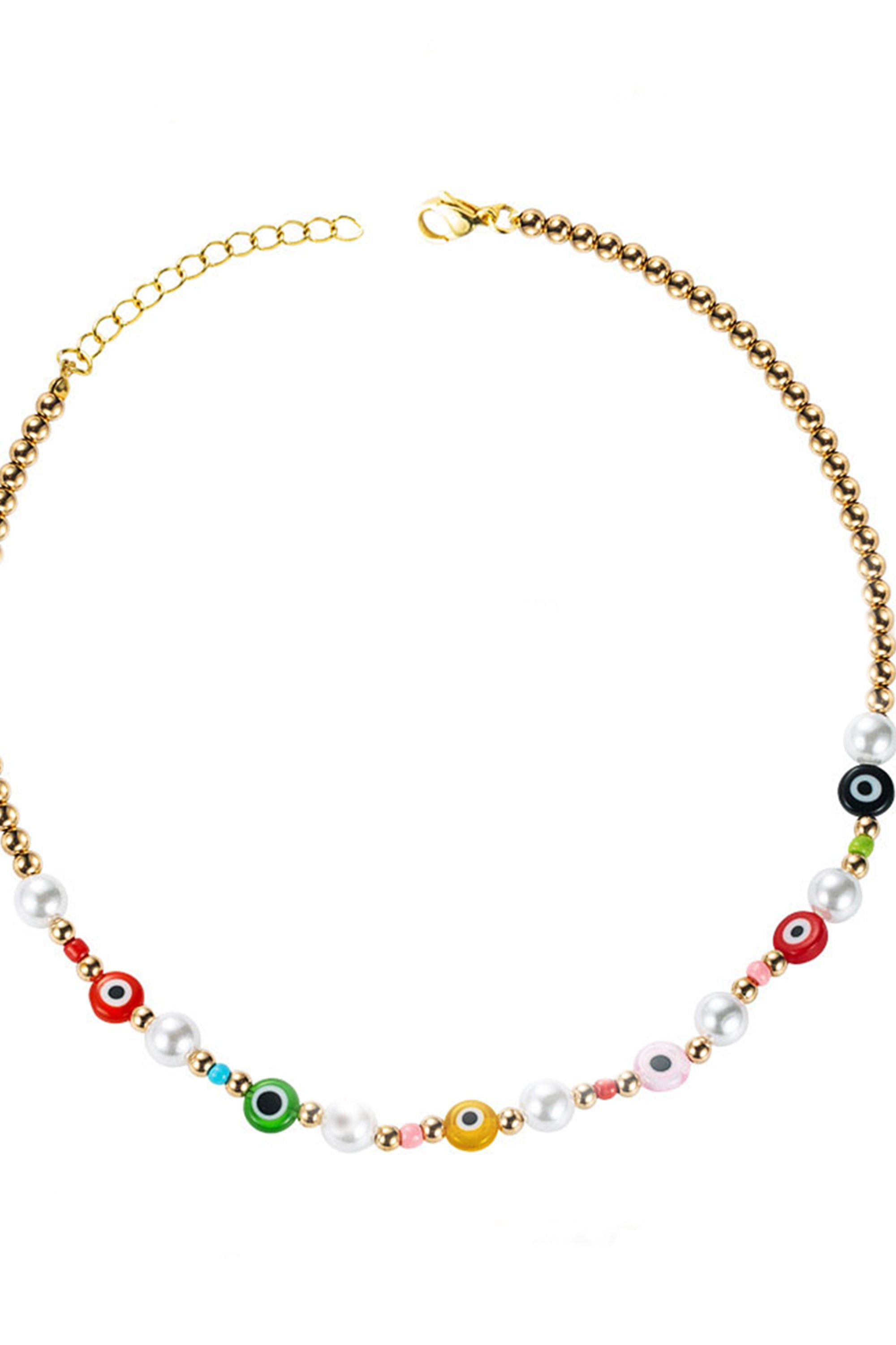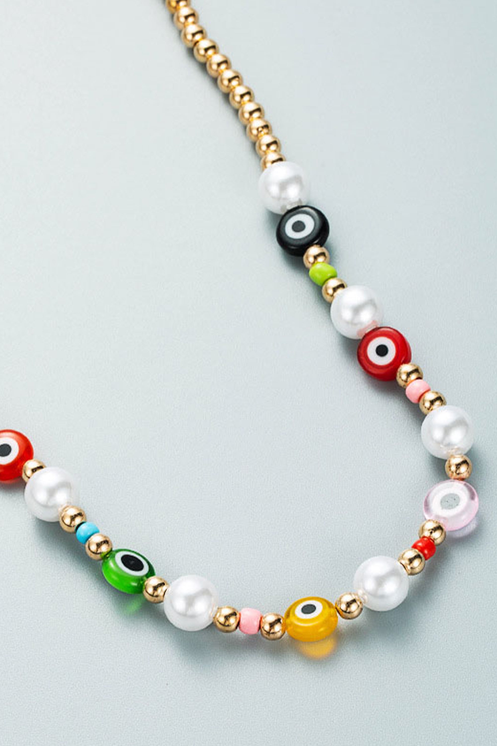 Presenting our Devil's Eye Ethnic Pearl Necklace—a vibrant blend of cultural charm and contemporary elegance. Adorned with colorful rice beads and pearls, it's a captivating accessory, perfect for those who seek a unique and eye-catching piece. Elevate your style with this statement necklace, celebrating timeless beauty and individual flair. Showcase the Devil's Eye Ethnic Pearl Necklace with a solid-colored outfit to let its vibrant hues shine. Pair with a scoop-neck top for a cultural yet chic look, effortlessly blending tradition and modernity in your ensemble.