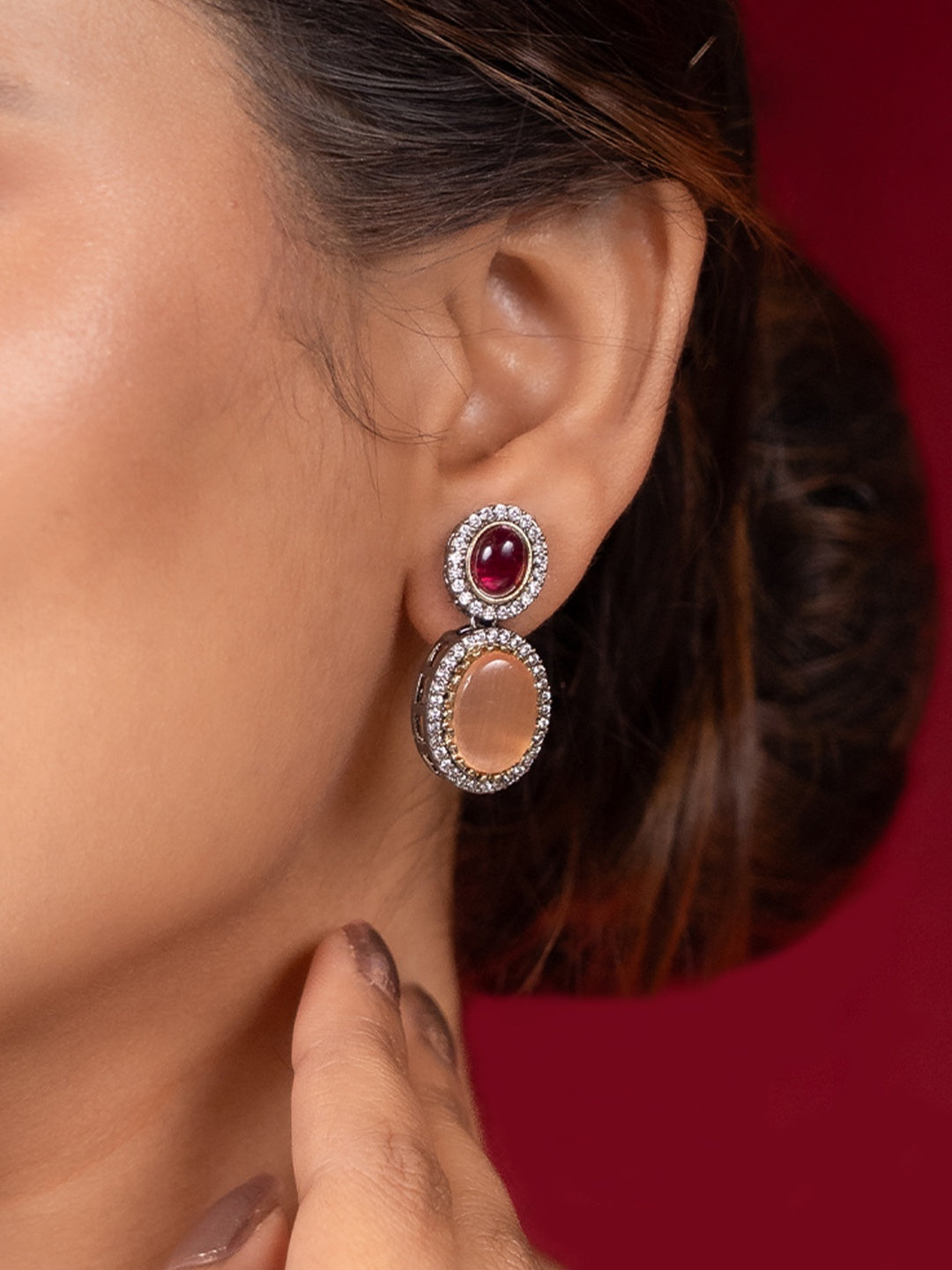 Pair these dual-tone water drop design dangler earrings with zircon with a sleek evening gown or a chic off-shoulder dress for a sophisticated look. For a more casual style, wear them with a simple blouse and tailored pants to add a touch of elegance. Keep your makeup fresh and dewy with a soft smokey eye and nude lip to let the earrings shine as the focal point of your outfit.