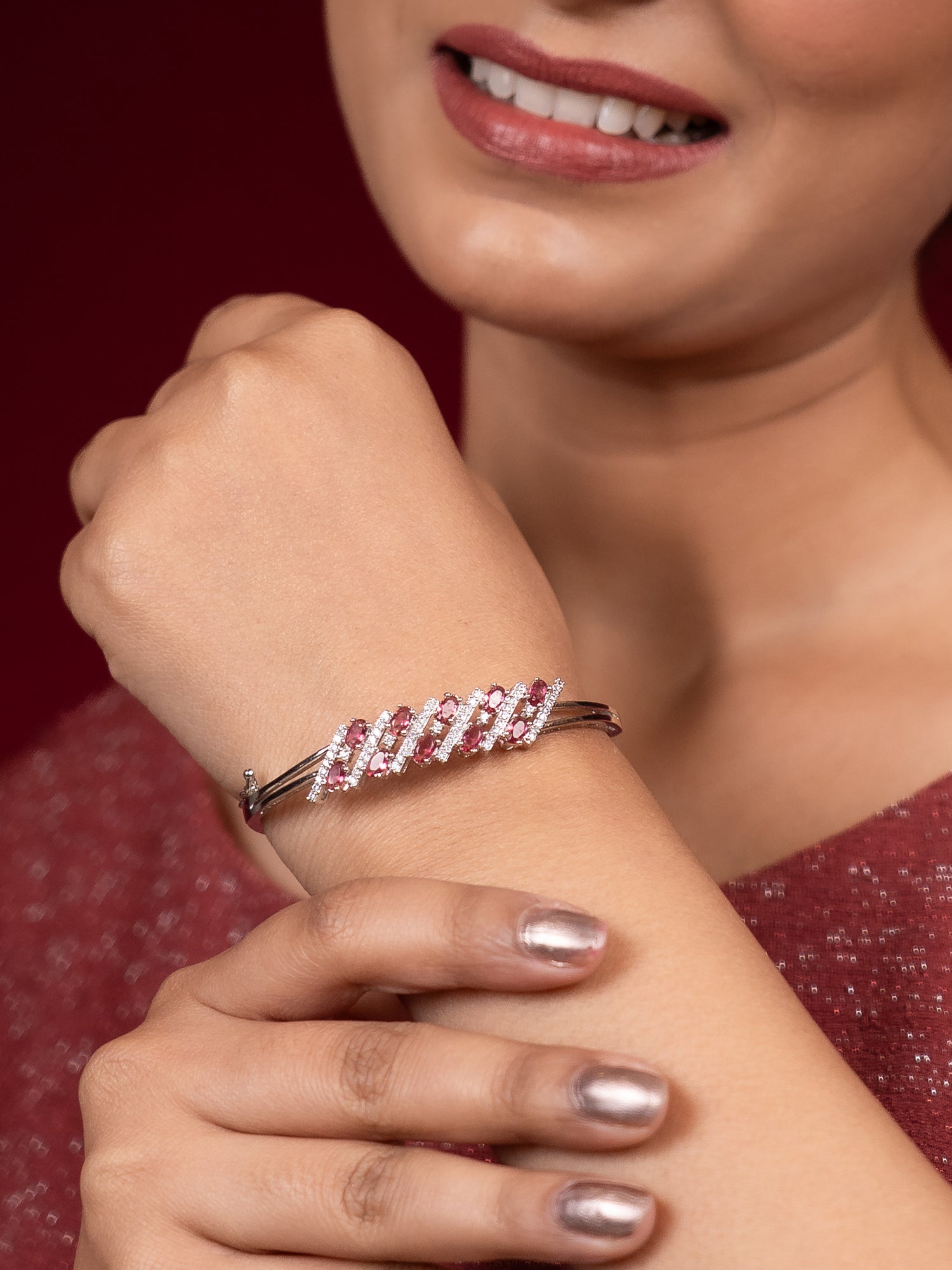Add a touch of grace and sparkle to your jewelry collection with this exquisite silver-plated bracelet, featuring a delicate blend of pink zircon stones and dazzling American diamonds. Designed for effortless elegance, this bracelet strikes the perfect balance between sophistication and charm. The soft pink hues add a feminine touch, while the shimmering stones create a radiant appeal. Whether worn alone or stacked with other accessories, this bracelet is a versatile fashion statement for both casual and formal occasions. Elevate your style with this timeless piece that beautifully complements any outfit.