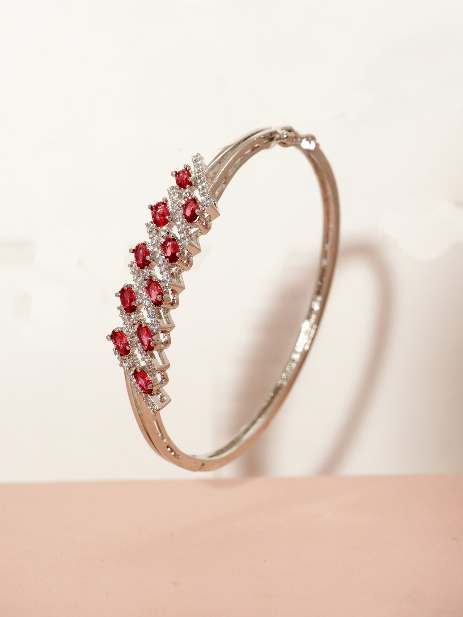 Let this silver-plated pink zircon bracelet shine by pairing it with pastel outfits or floral prints for a soft, feminine look. For a more elegant touch, complement it with American diamond earrings and a sleek clutch. It also pairs beautifully with traditional attire like a pink or silver-toned saree or lehenga, adding a refined sparkle to your ensemble. Keep other accessories minimal to let the bracelet be the focal point of your look.