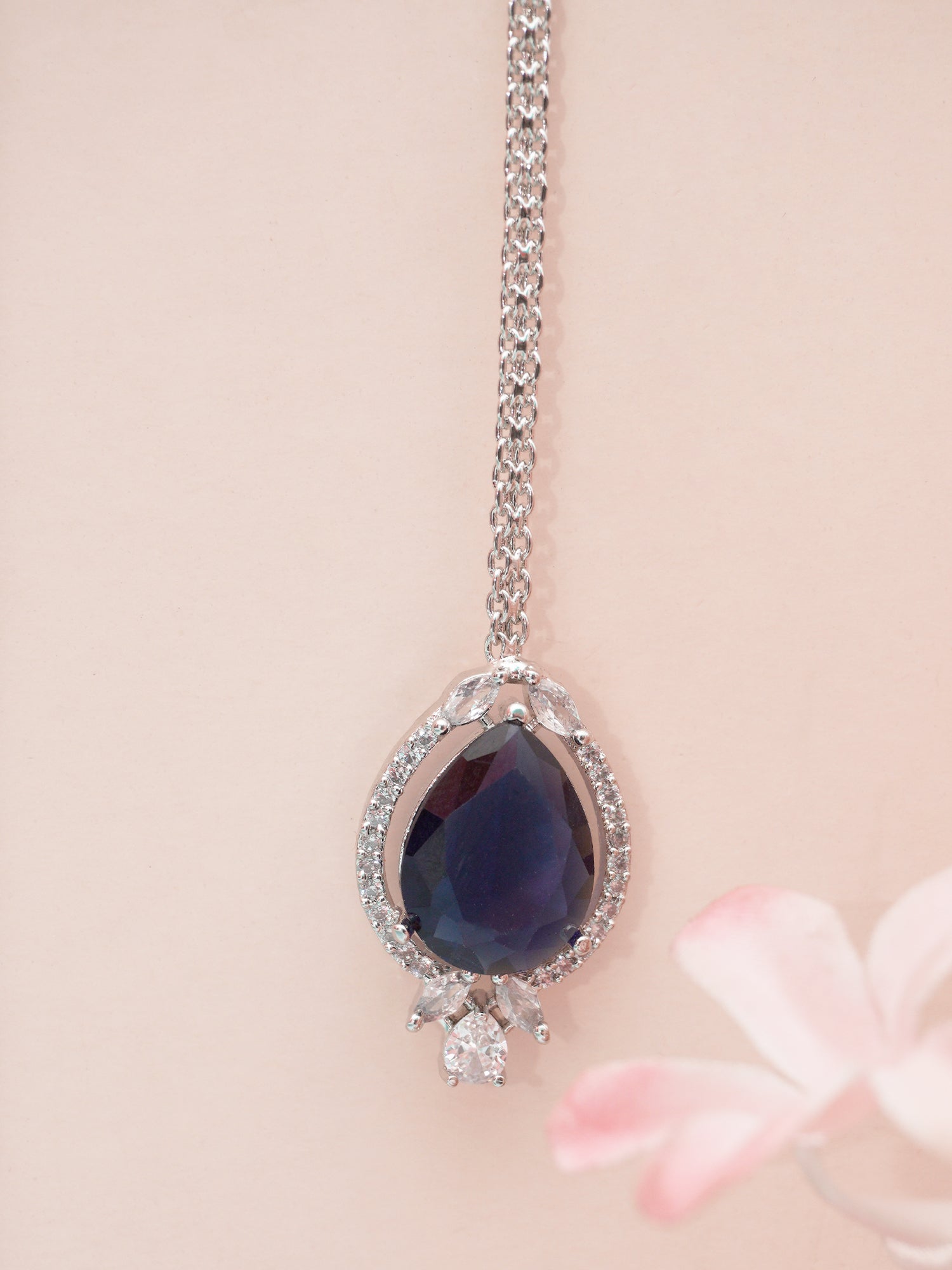 Add a touch of royal elegance to your look with this dark blue American diamond mangtikka, a perfect blend of tradition and contemporary charm. Designed with precision, this piece features brilliant American diamonds set in a rhodium-polished finish, ensuring a radiant sparkle with every movement. The deep blue accents bring a regal touch, making it an ideal accessory for weddings, festive occasions, and grand celebrations.