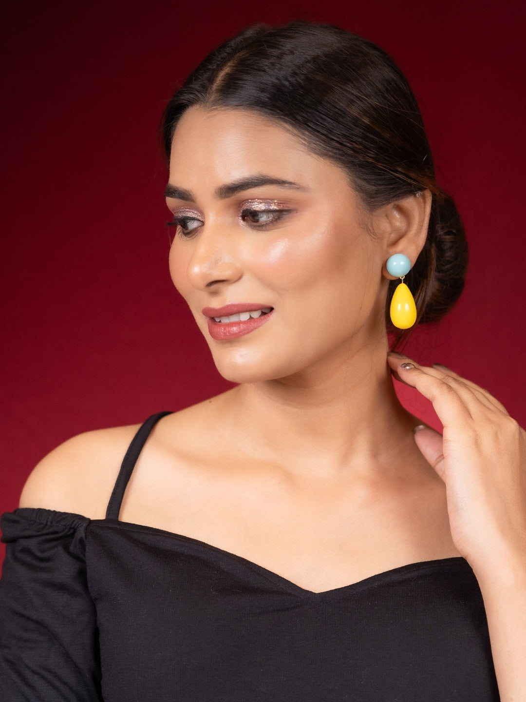 Pair these dual-tone teardrop dangle earrings with a solid-colored outfit to let their vibrant yellow and blue hues stand out. For a chic daytime look, opt for a white or pastel kurta. For evening glamour, complement them with a navy blue or mustard dress. Add a sleek ponytail or a messy bun to highlight the earrings and complete the look with minimal makeup for a polished yet effortless vibe.