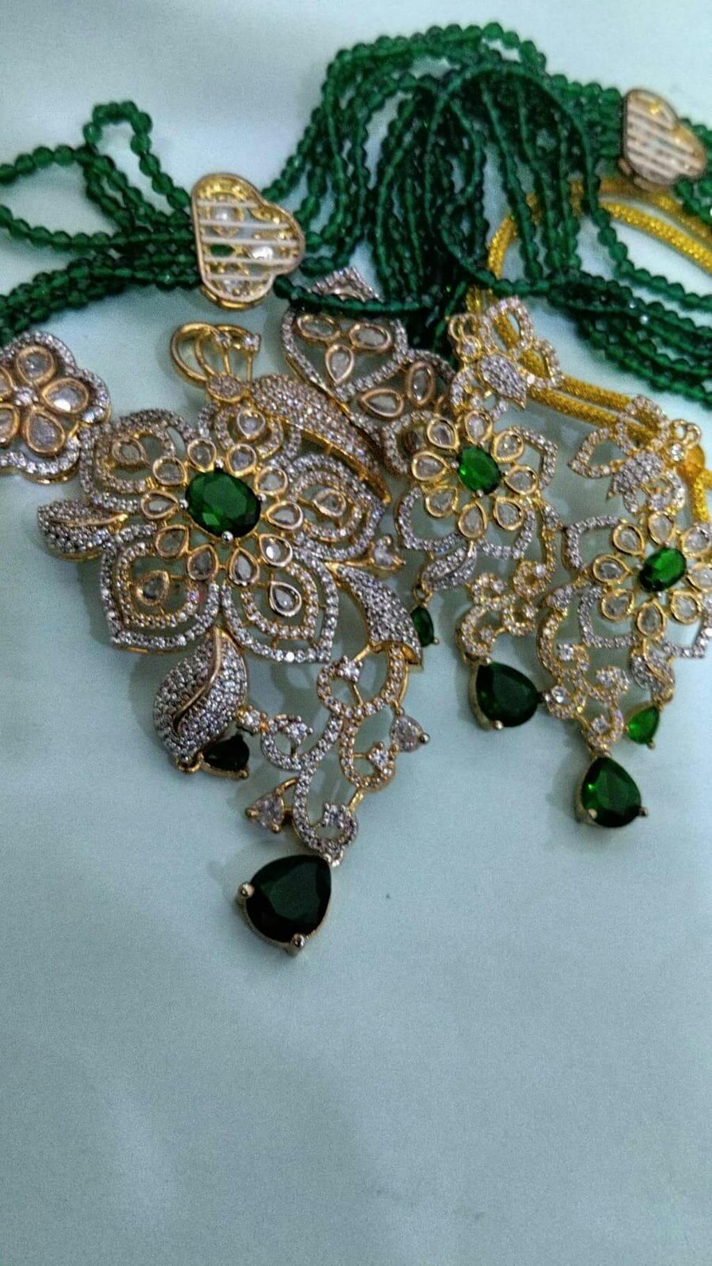 Pair this stunning necklace set with a rich silk saree or an embroidered salwar suit for a regal look. Sweep your hair into an elegant updo to showcase the intricate details of the jewelry. Opt for subtle makeup with a bold lip color to complement the green accents. Complete the ensemble with a matching clutch and delicate gold bangles for a touch of sophistication.