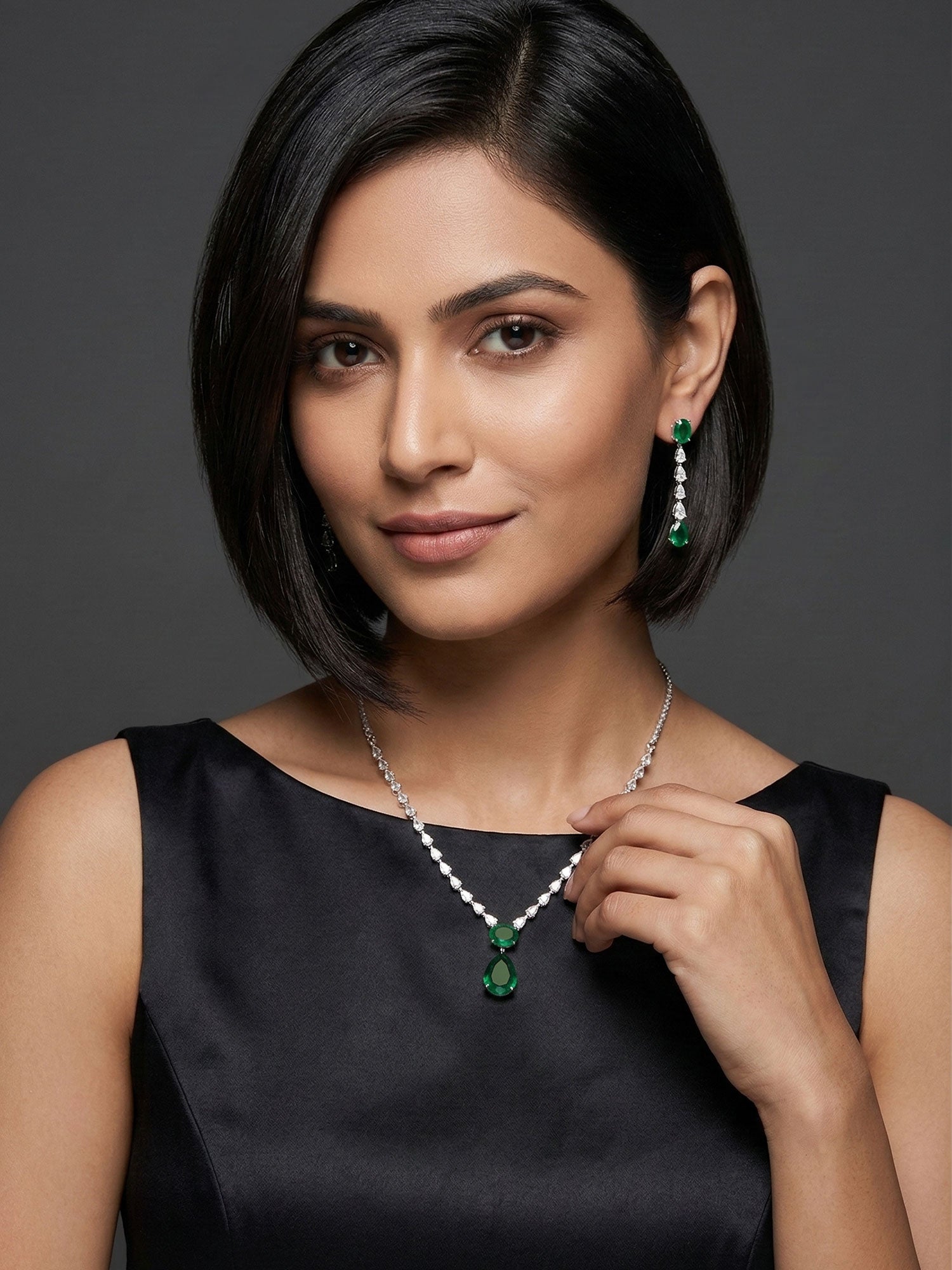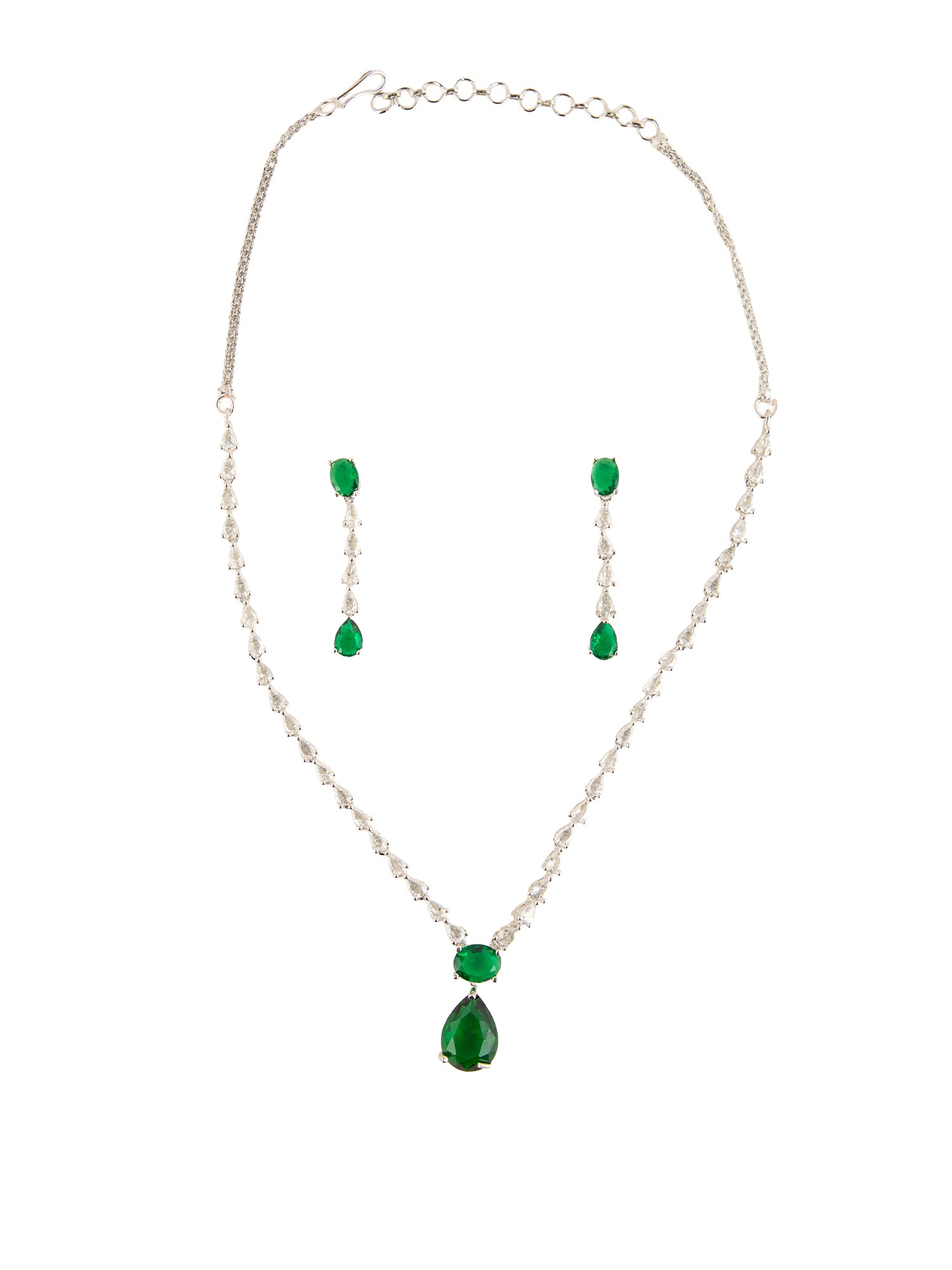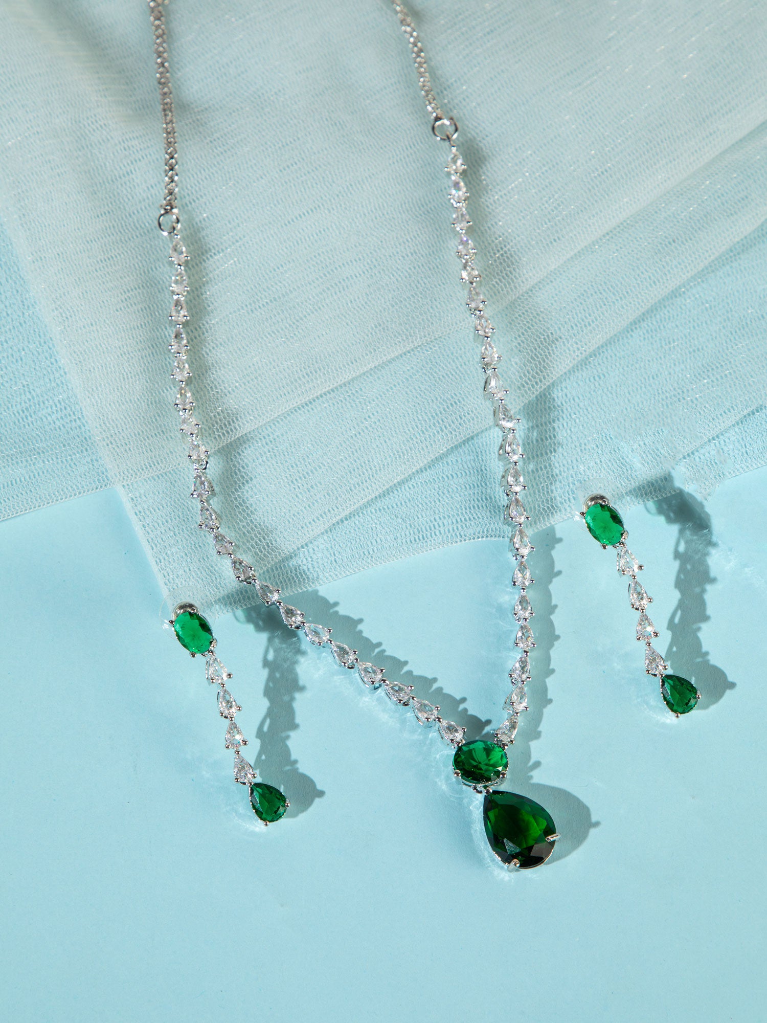 Enhance your elegance with this beautifully crafted silver rhodium-plated necklace set, featuring stunning green and white AD stones in a graceful teardrop design. The brilliant sparkle of American Diamonds combined with the rich green hue creates a perfect balance of luxury and sophistication. Designed with fine detailing and a premium finish, this set is ideal for weddings, parties, and festive occasions. Lightweight and radiant, it adds a refined charm to your overall look.