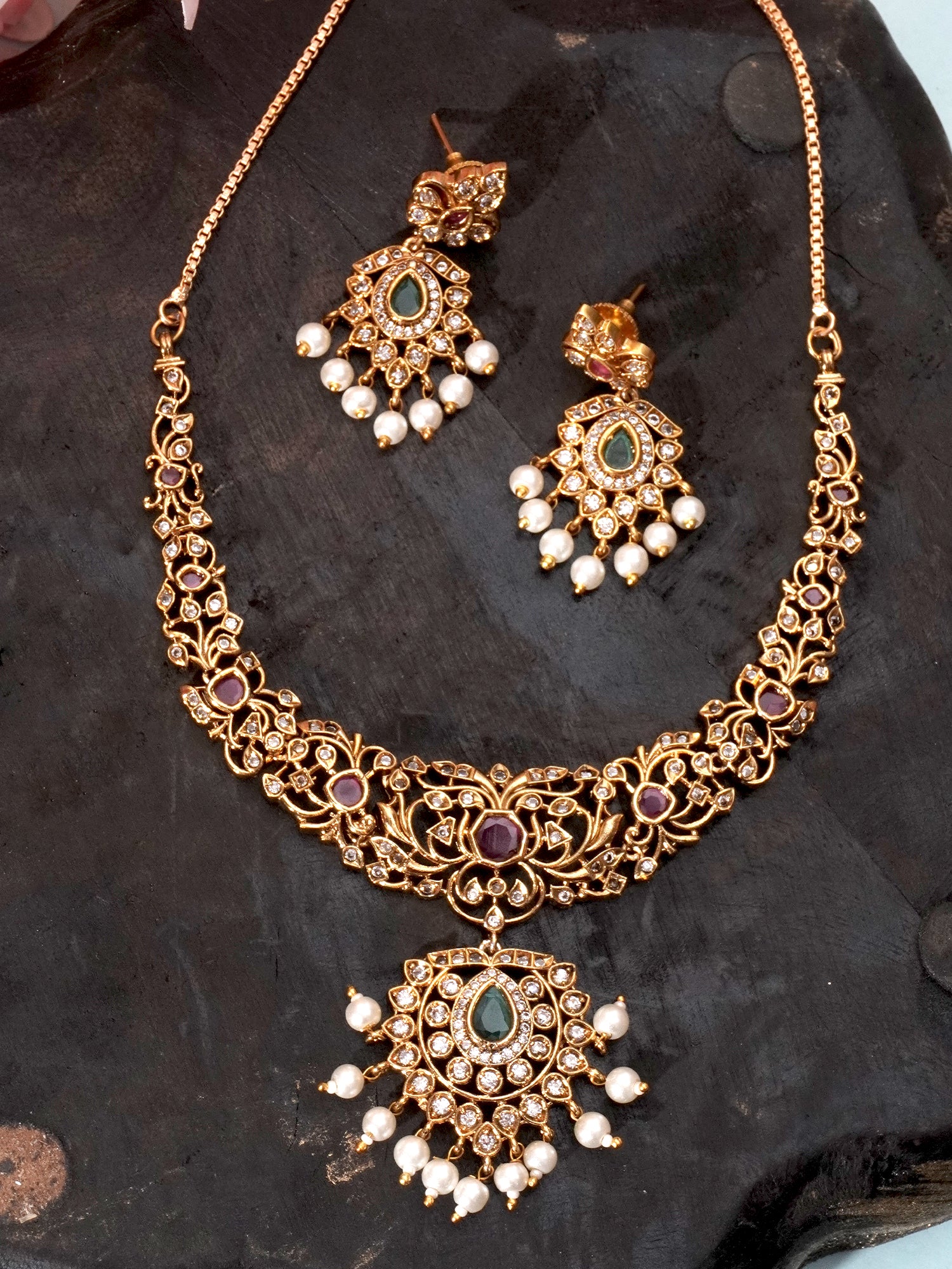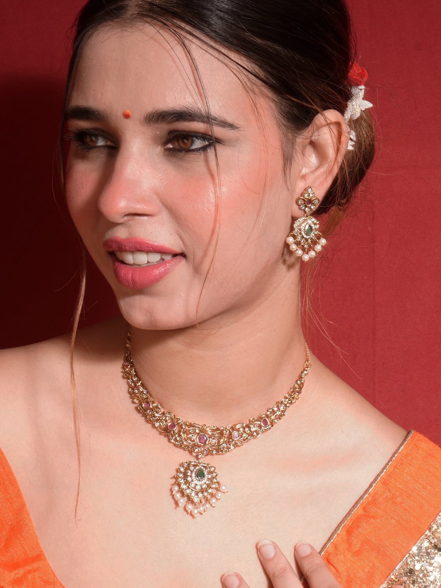 This enchanting jewelry set features a stunning combination of emerald, pearl, and pink gemstones, beautifully set against a luxurious gold-plated base. The delicate flower design adds a touch of elegance, while the sparkling cubic zirconia (CZ) stones enhance its brilliance, creating a radiant effect. The soft glow of the pearls contrasts beautifully with the vibrant emerald and pink hues, making this set perfect for weddings, festive celebrations, or special occasions. Timeless and elegant, this jewelry set is a must-have for adding a sophisticated and feminine touch to your ensemble.