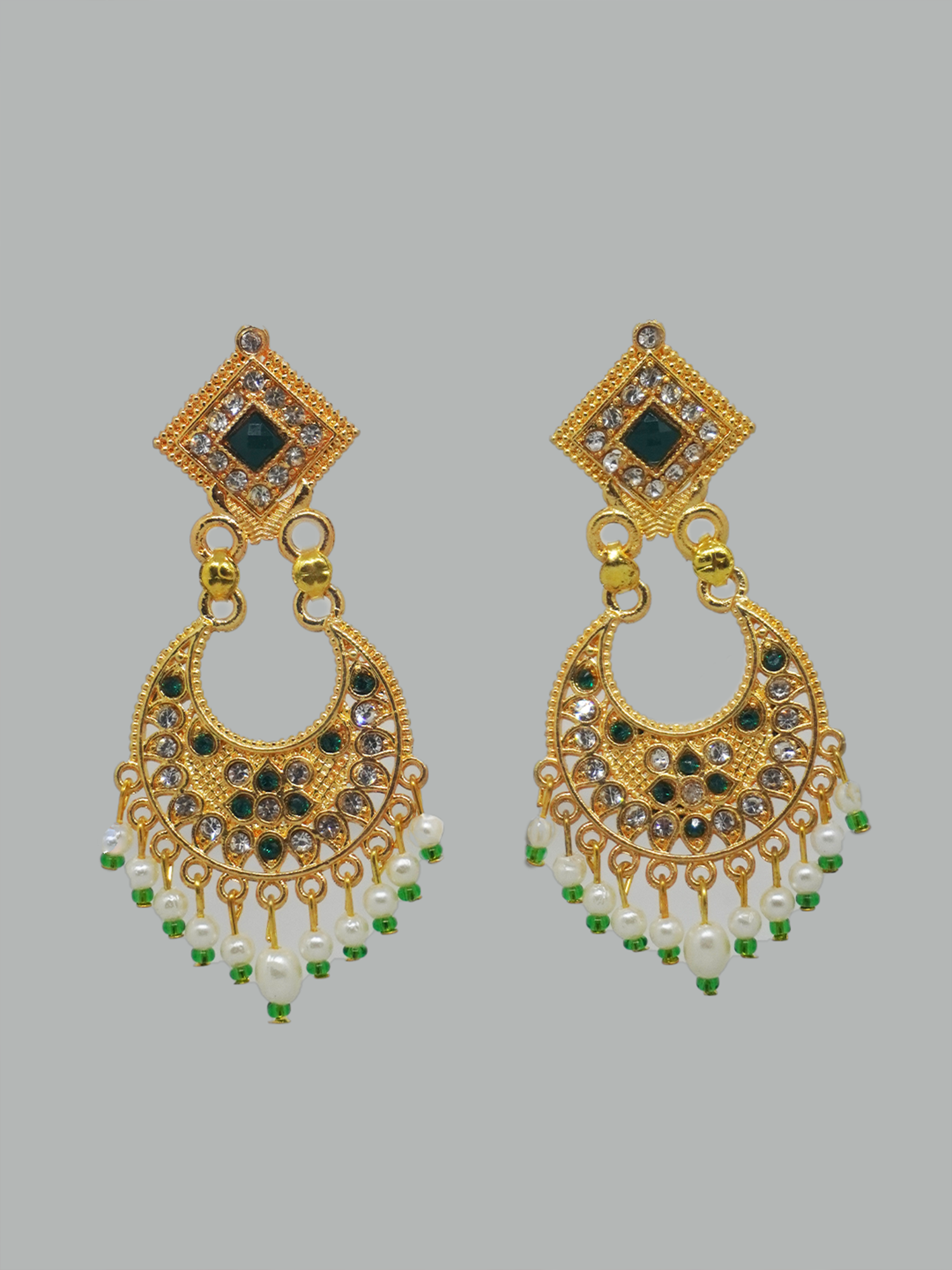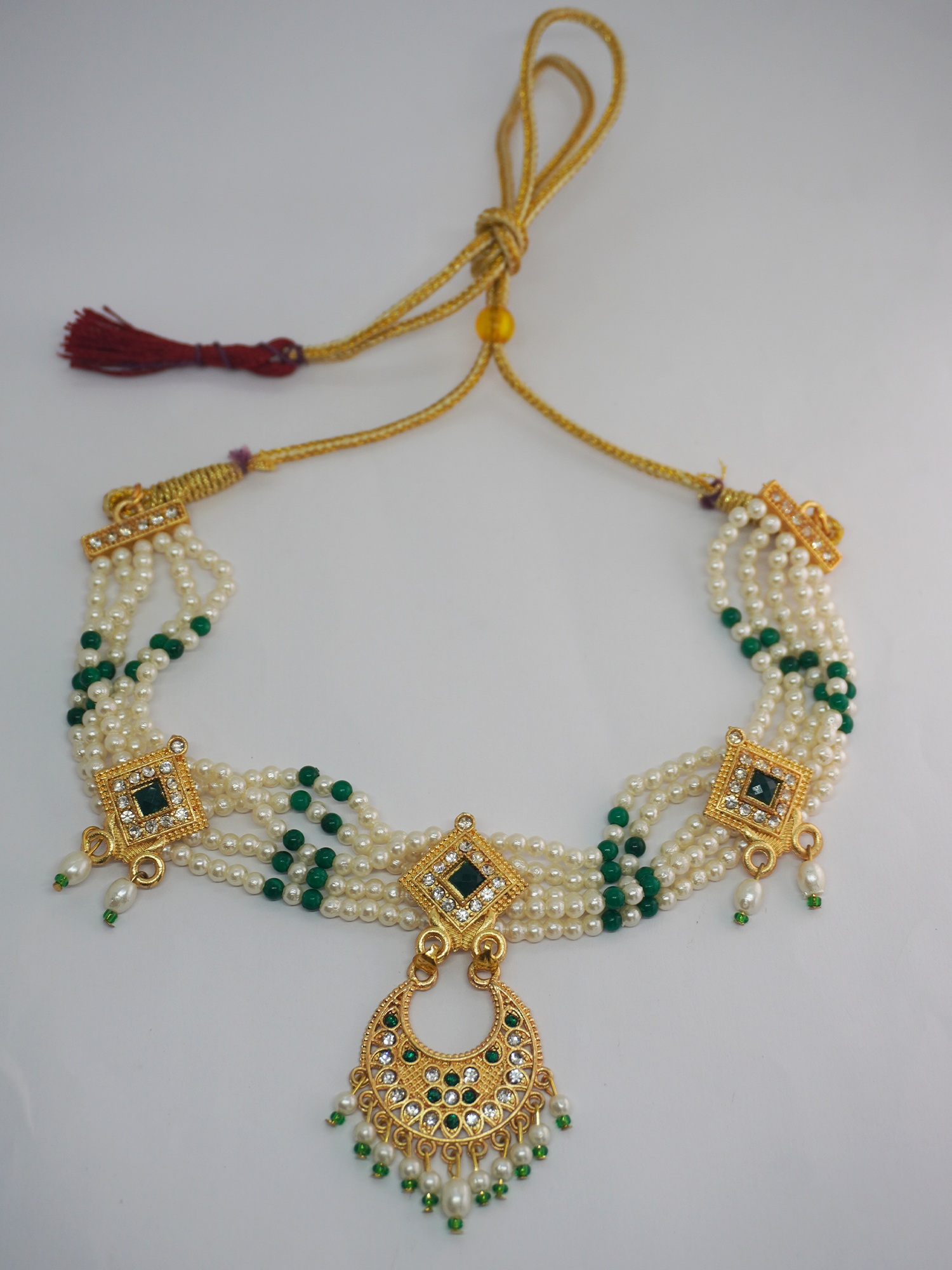 Adorn yourself with this chic Gold Plated Multilayered White and Green Faux Pearl Necklace Set. The contemporary ensemble features a beautiful gold-plated crescent design adorned with white and green CZ stones. The spellbinding earrings echo the necklace's elegance with matching stones in a crescent design. Handmade by local artisans, this must-have set exudes sophistication, perfect for weddings, functions, or parties, adding a touch of glamour to any occasion.