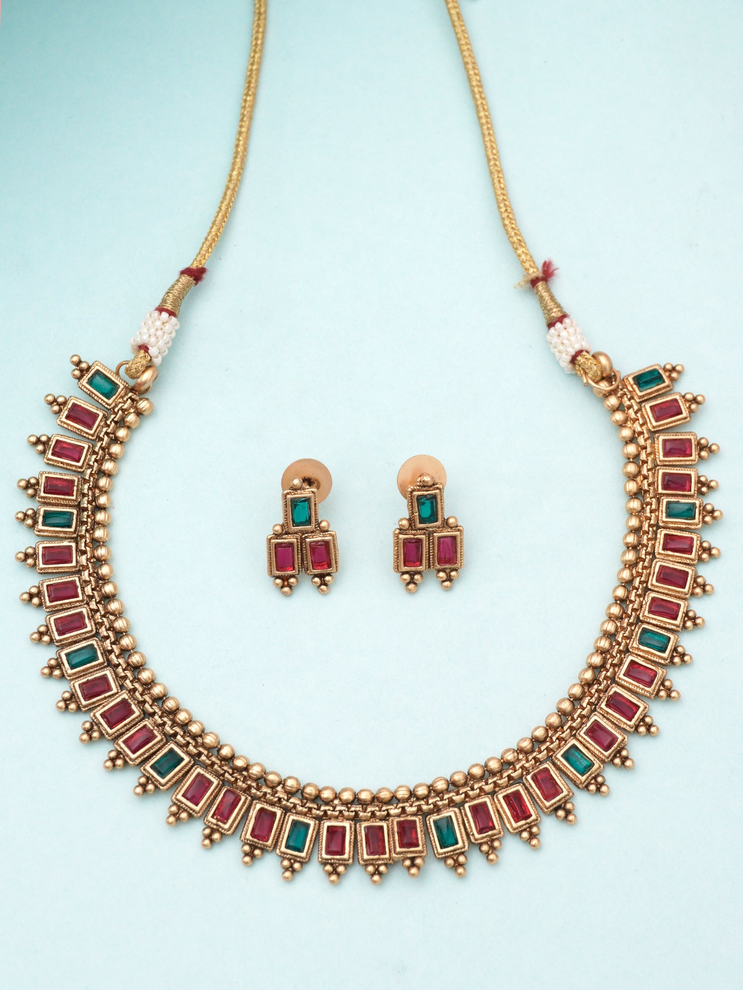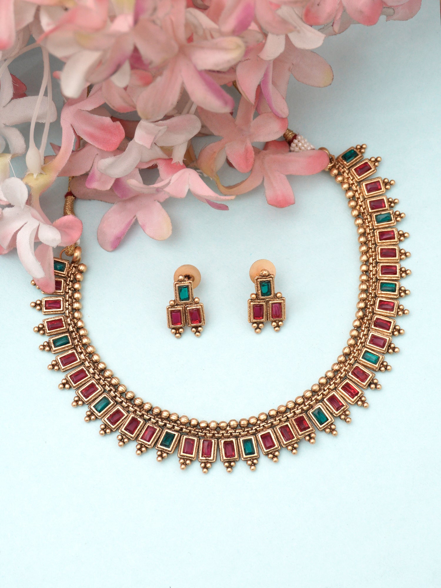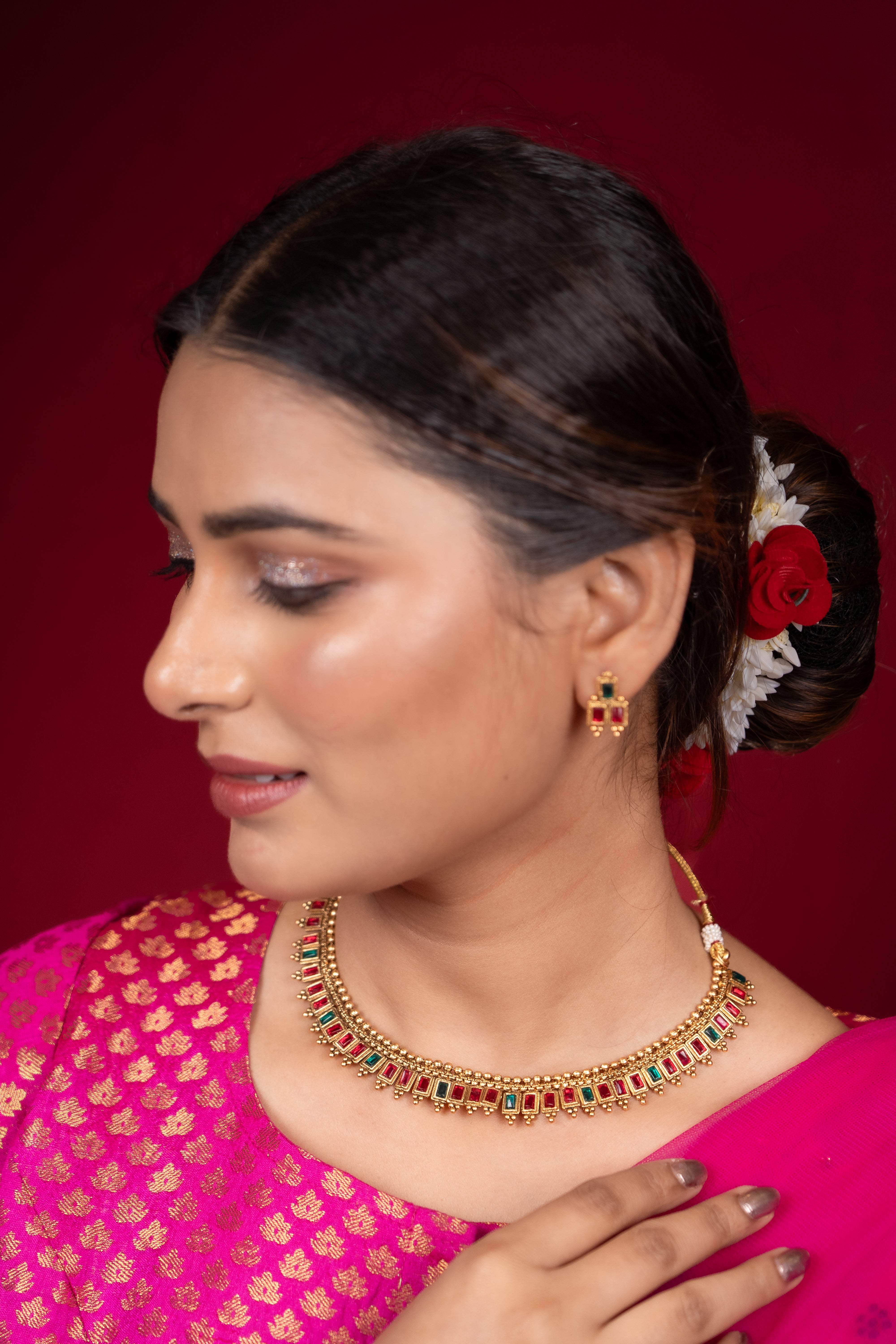 Celebrate heritage and elegance with this traditional 24K gold-plated jewelry set, designed to add a royal touch to your ensemble. Featuring intricate craftsmanship, this set showcases exquisite green and pink stones, creating a striking contrast that enhances its timeless appeal. Perfect for weddings, festive occasions, and cultural celebrations, this jewelry set effortlessly complements sarees, lehengas, and ethnic ensembles. Elevate your look with this beautifully designed piece that embodies grace, tradition, and sophistication.