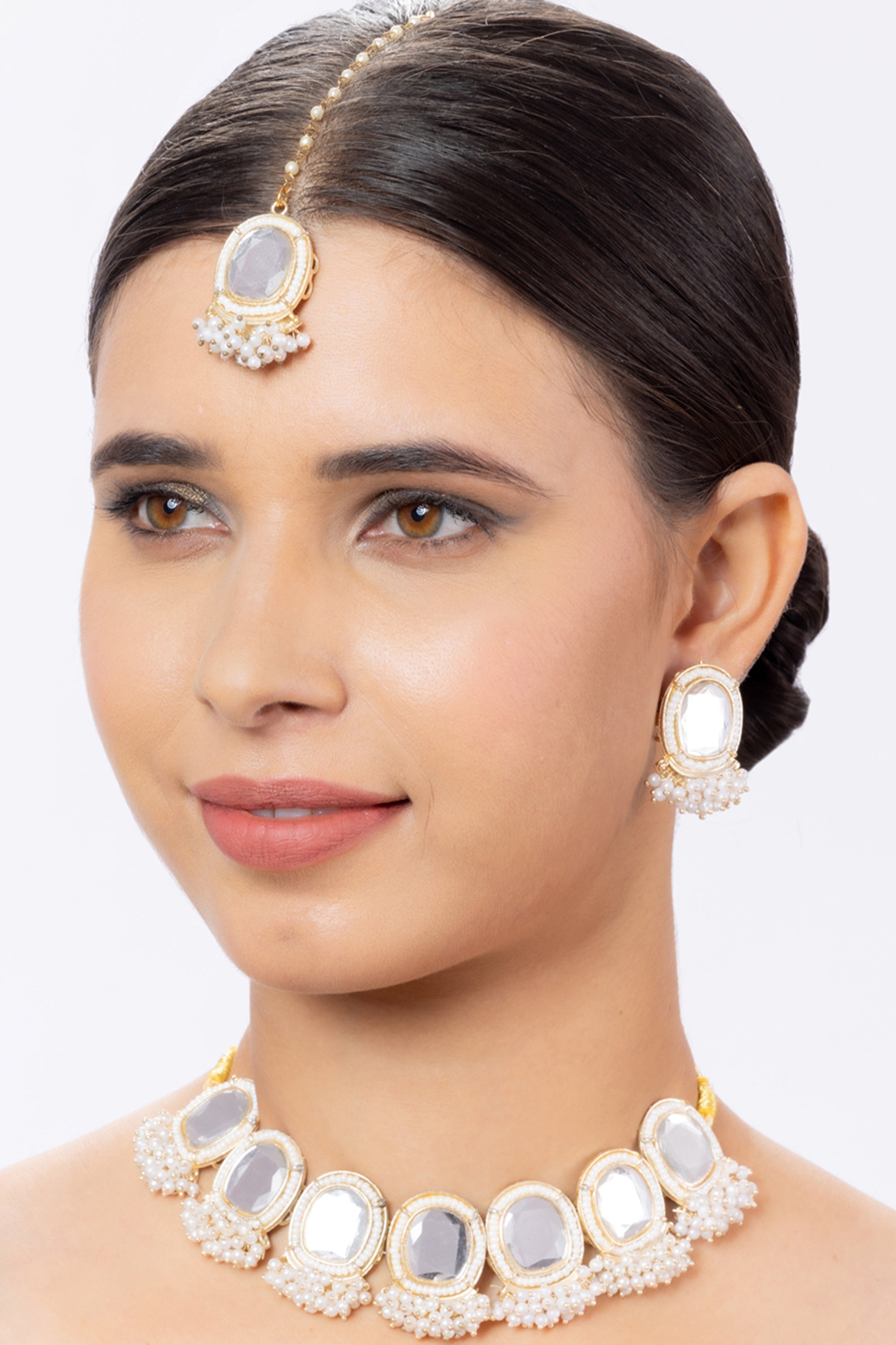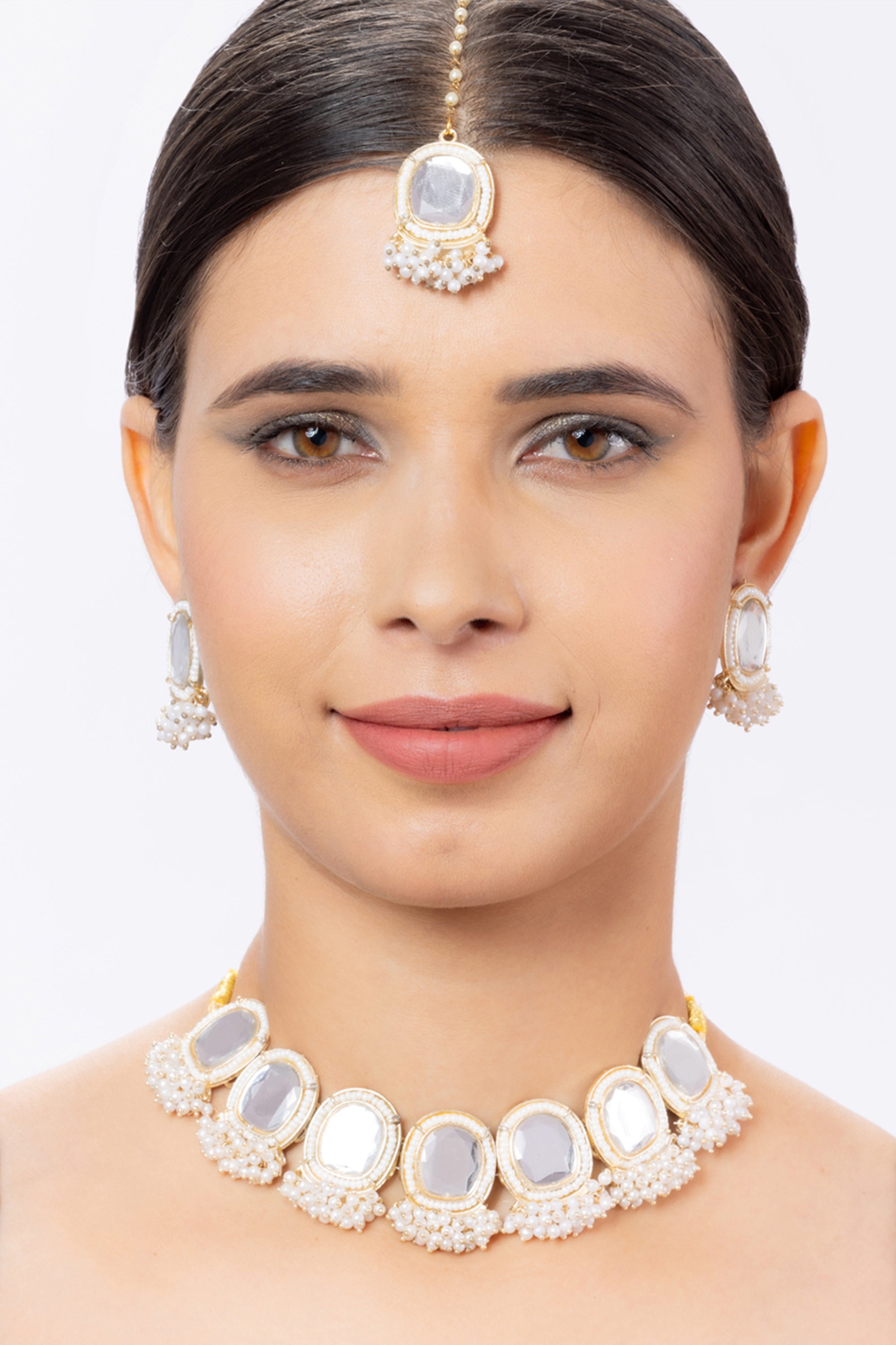 The beauty of this Polki choker necklace set will amaze everyone in the room. Unveil your unique style with this necklace set and spread elegance everywhere. This exquisite necklace set is beautifully embellished with polki and the tiny white beads at the bottom make it more attractive. The entire body is polished with gold and has an adjustable dori. The addition of polki stud earrings and mang tikka completes the entire look of this necklace set. All you’ve to do is pair it with your outfit and you’re all set to slay any occasion. The lightweight makes it more comfortable to adorn.