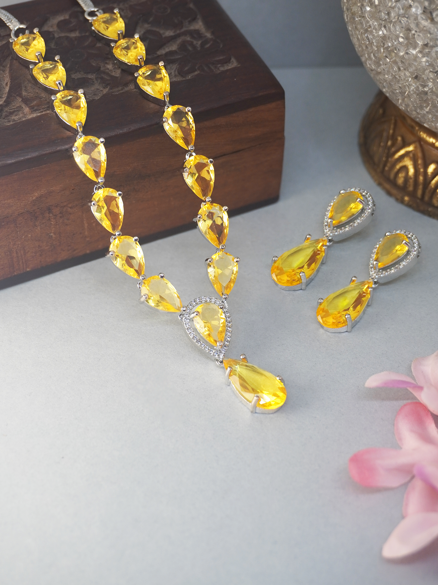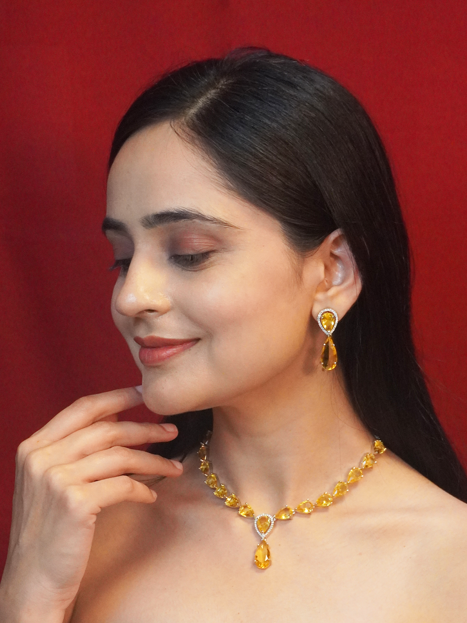 Complement this necklace set with a strapless yellow or gold gown to enhance the topaz stones. Opt for a sleek bun or chignon to keep the focus on the jewelry. Add matching gold heels and a clutch for a polished, elegant look.