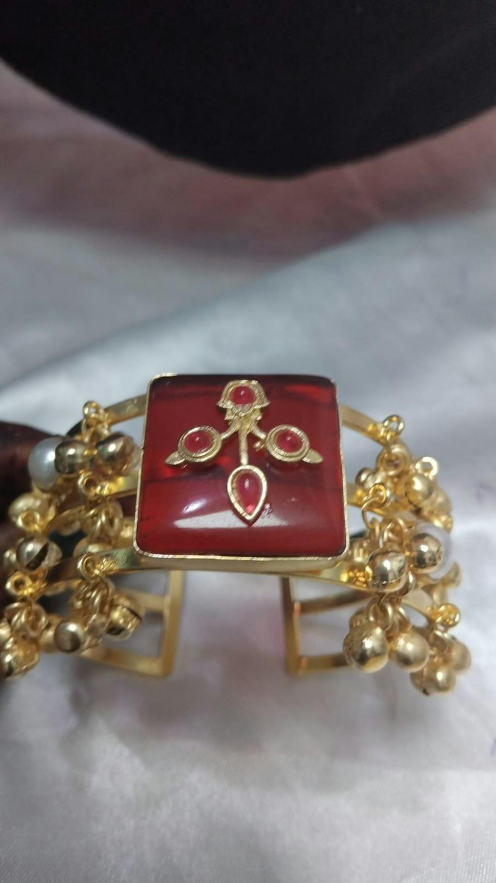 Celebrate heritage and elegance with this exquisite traditional kada, crafted to perfection with a 24K gold-plated finish. Designed for those who appreciate fine detailing, this piece features delicate ghungroo accents that create a soft, melodic charm with every movement. The intricate design is further enhanced with lustrous pearls and rich maroon stones, adding a regal touch to your ensemble. Whether paired with ethnic attire or worn as a statement piece, this kada beautifully blends tradition with timeless allure.