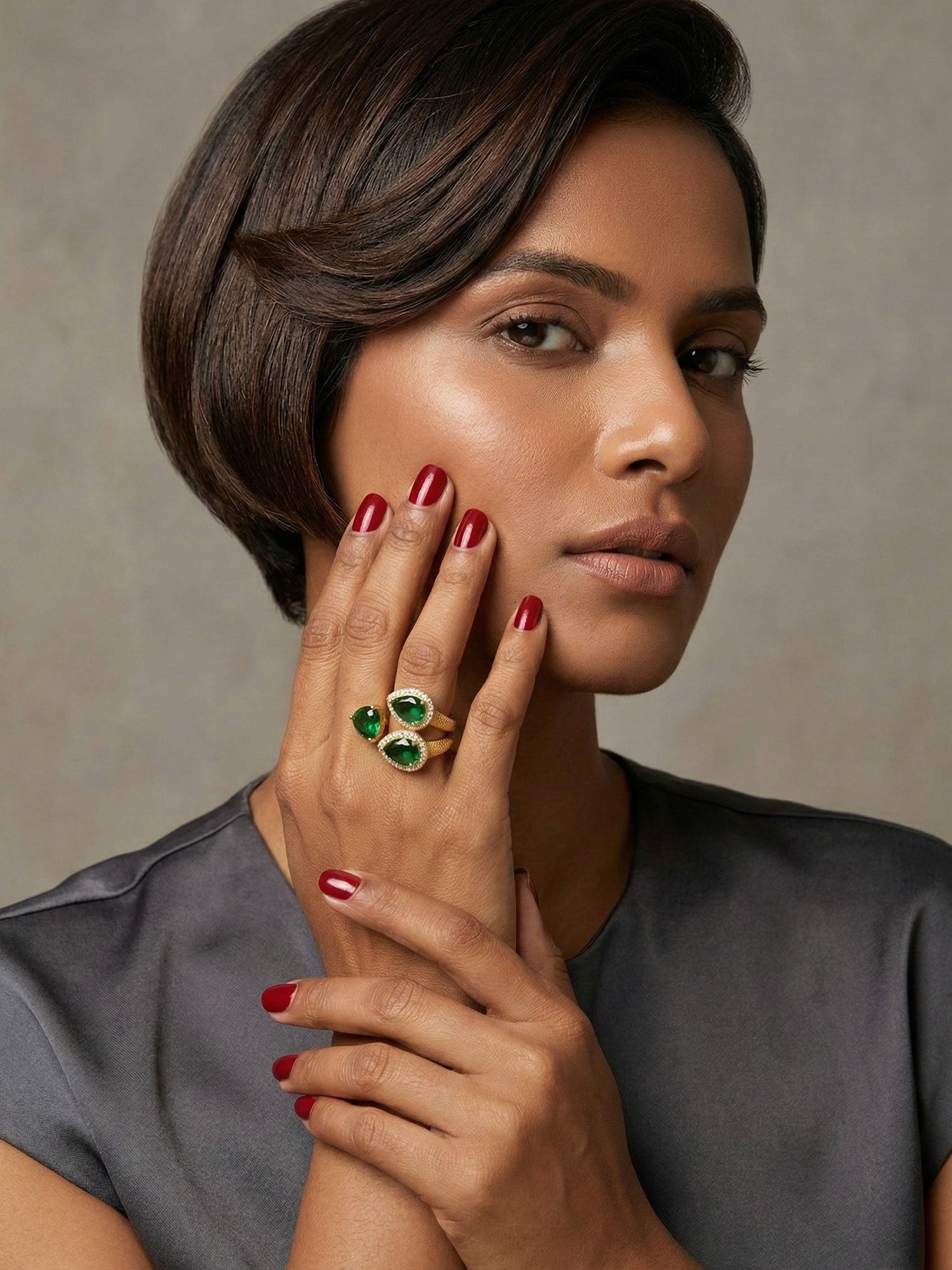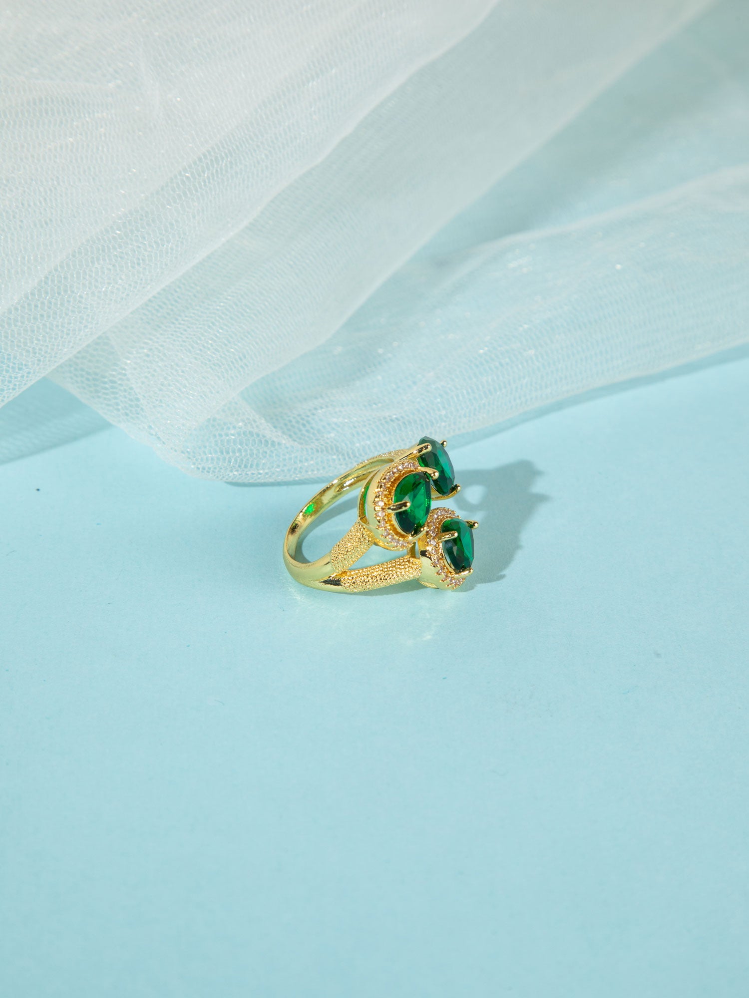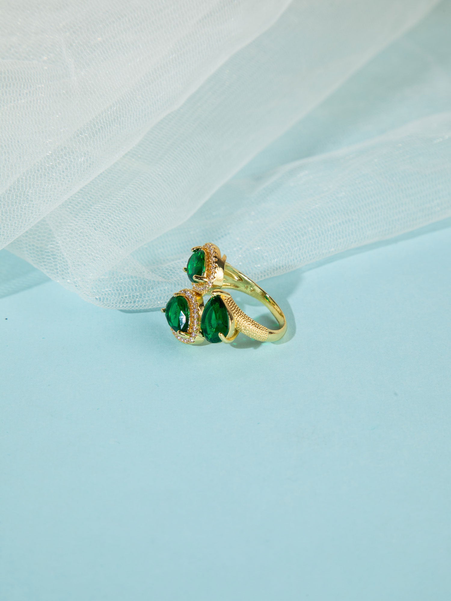 This beautifully crafted gold-plated ring features sparkling CZ stones paired with a rich green centerpiece, designed in an intricate leaf pattern. The nature-inspired detailing adds a graceful and refreshing touch, while the shimmering stones enhance its overall elegance. Perfect for both everyday wear and special occasions, this ring brings a subtle yet sophisticated charm to your jewelry collection.
