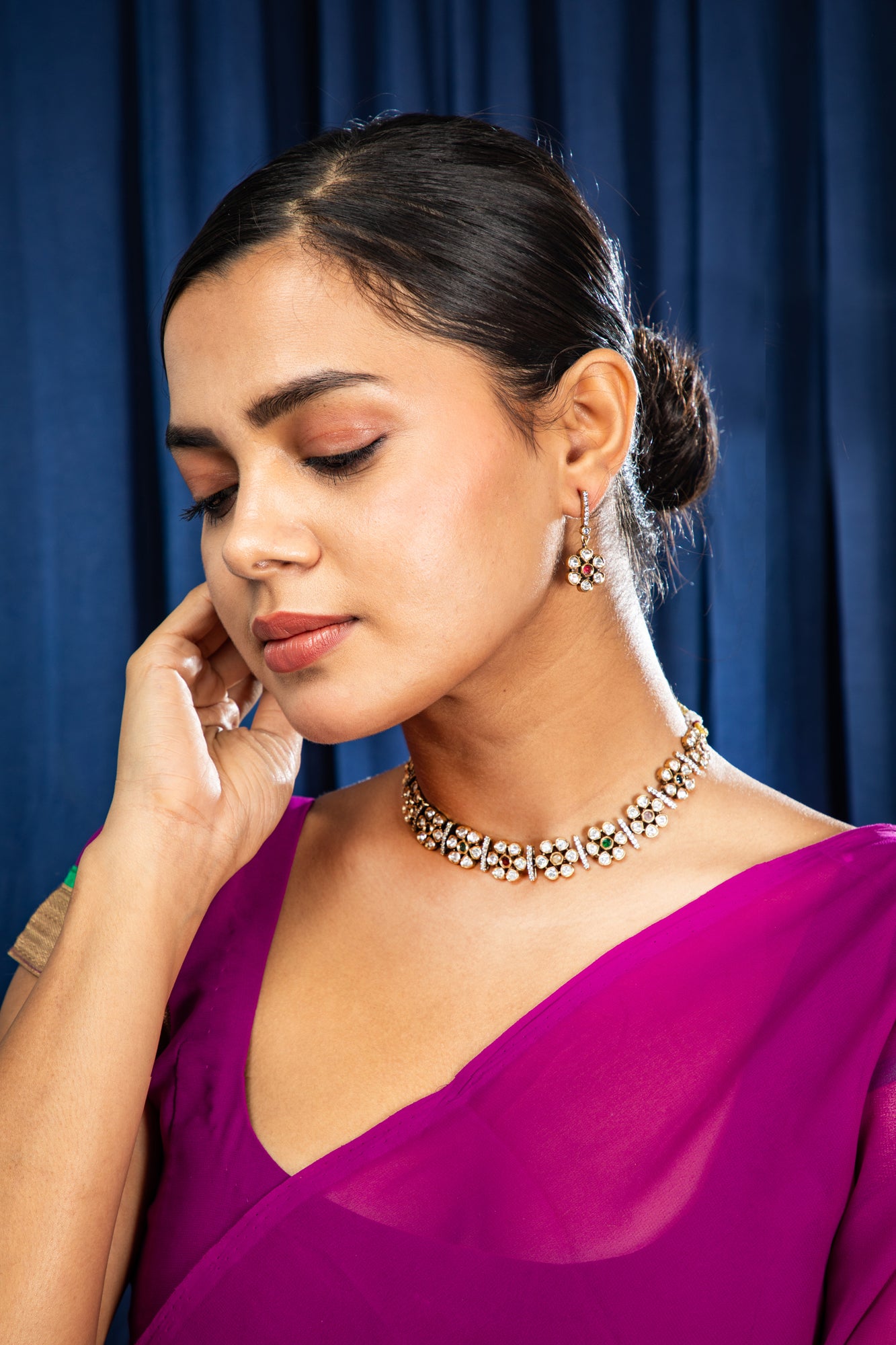Pair with a floral embroidered outfit or saree for a harmonious and elegant festive ensemble.