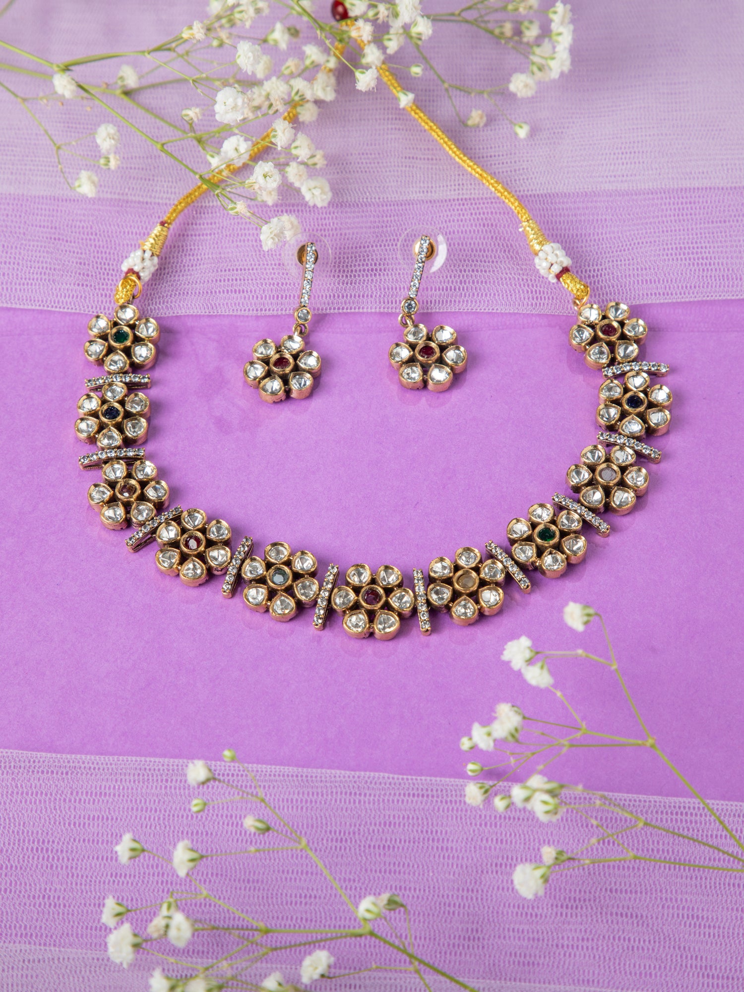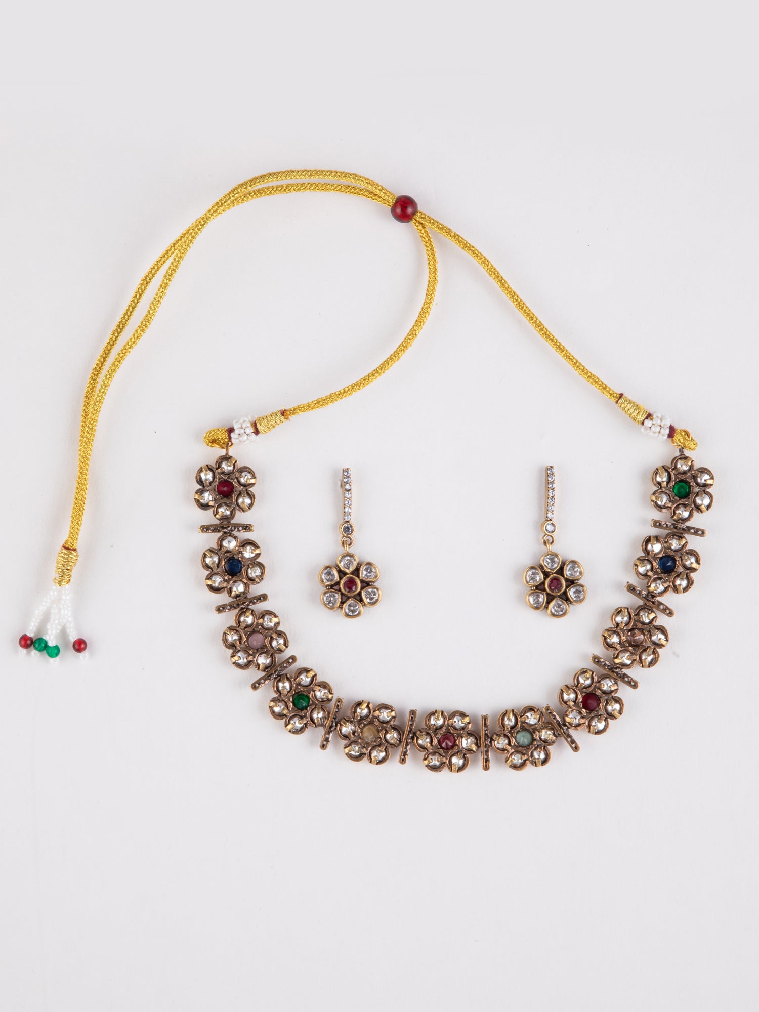 Grace your look with this gold plated floral necklace adorned with white, red, and green stones. Paired with matching floral earrings, it's a mesmerizing design perfect for weddings, festivals, or parties.