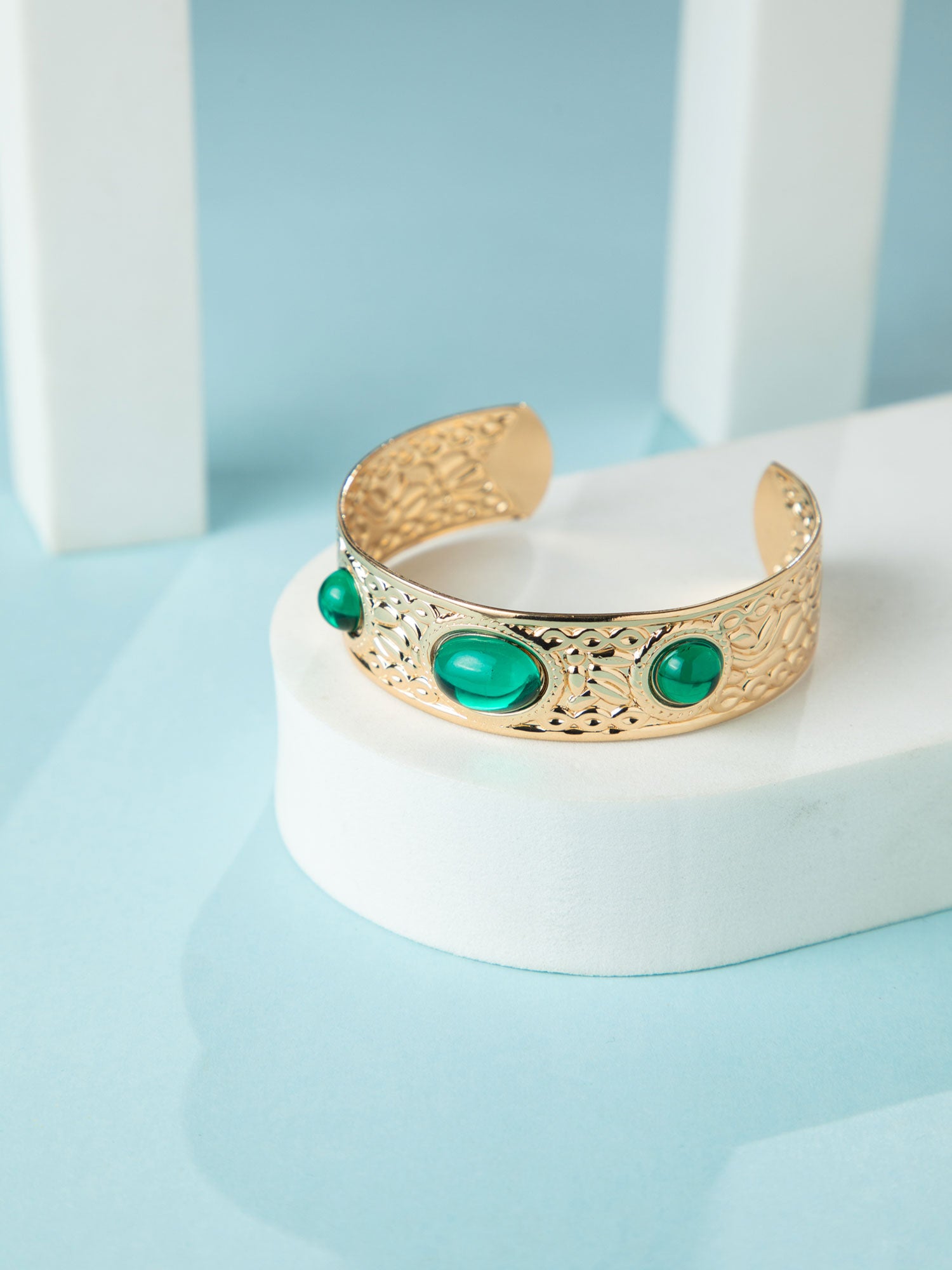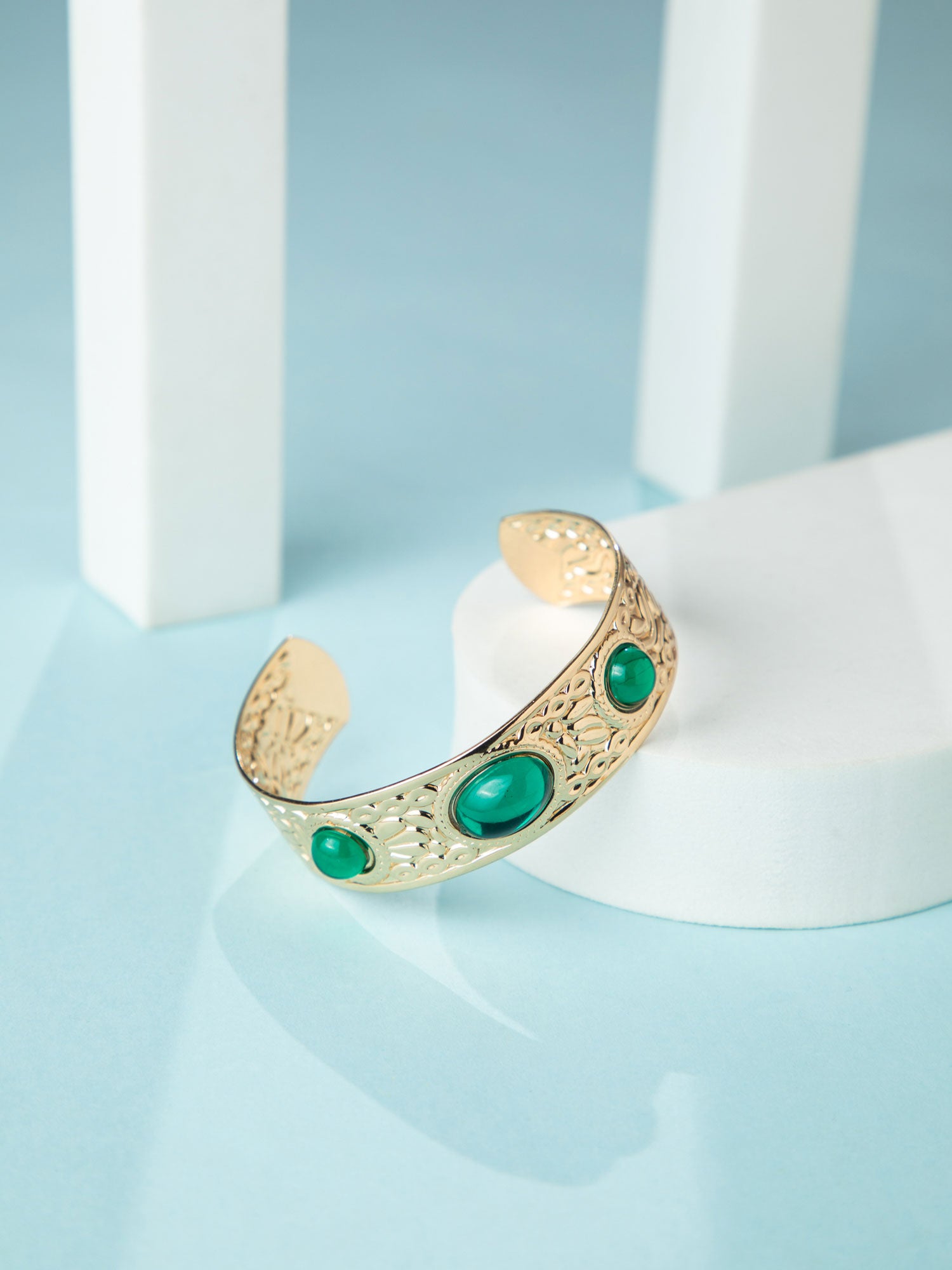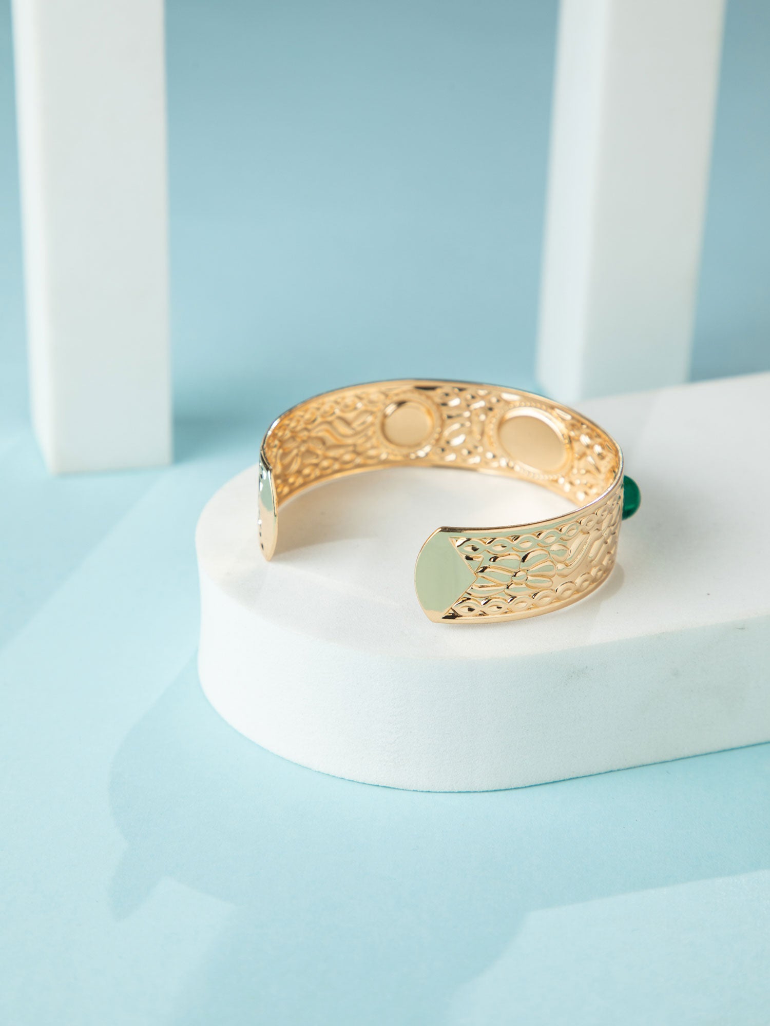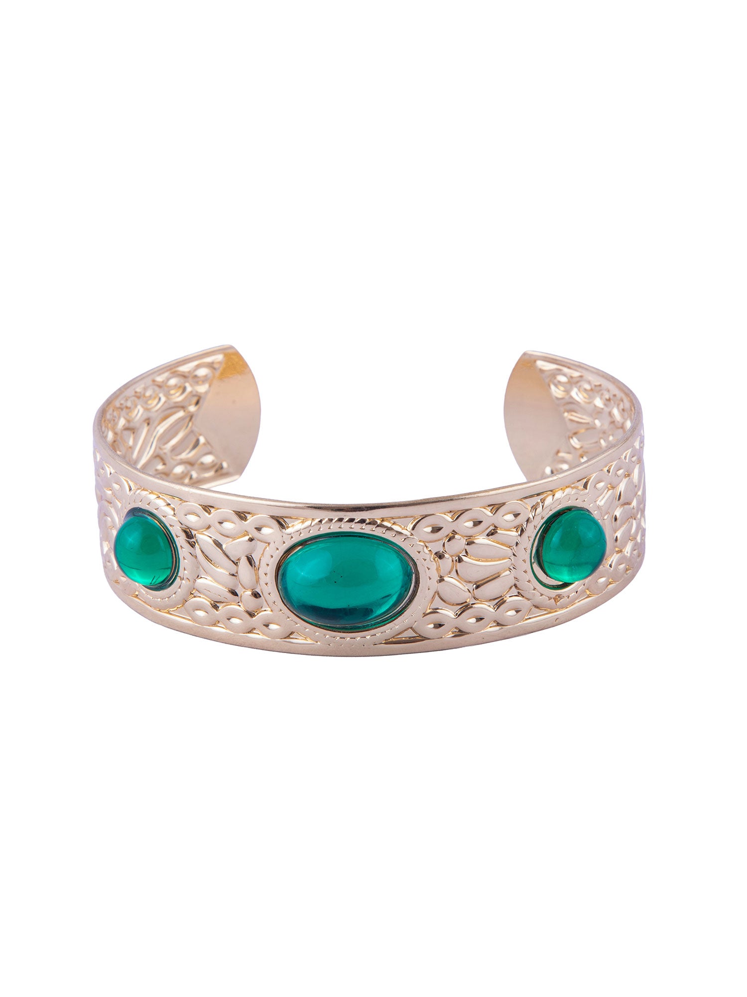 Gold Plated Adjustable Kada Bangle with Green Stones