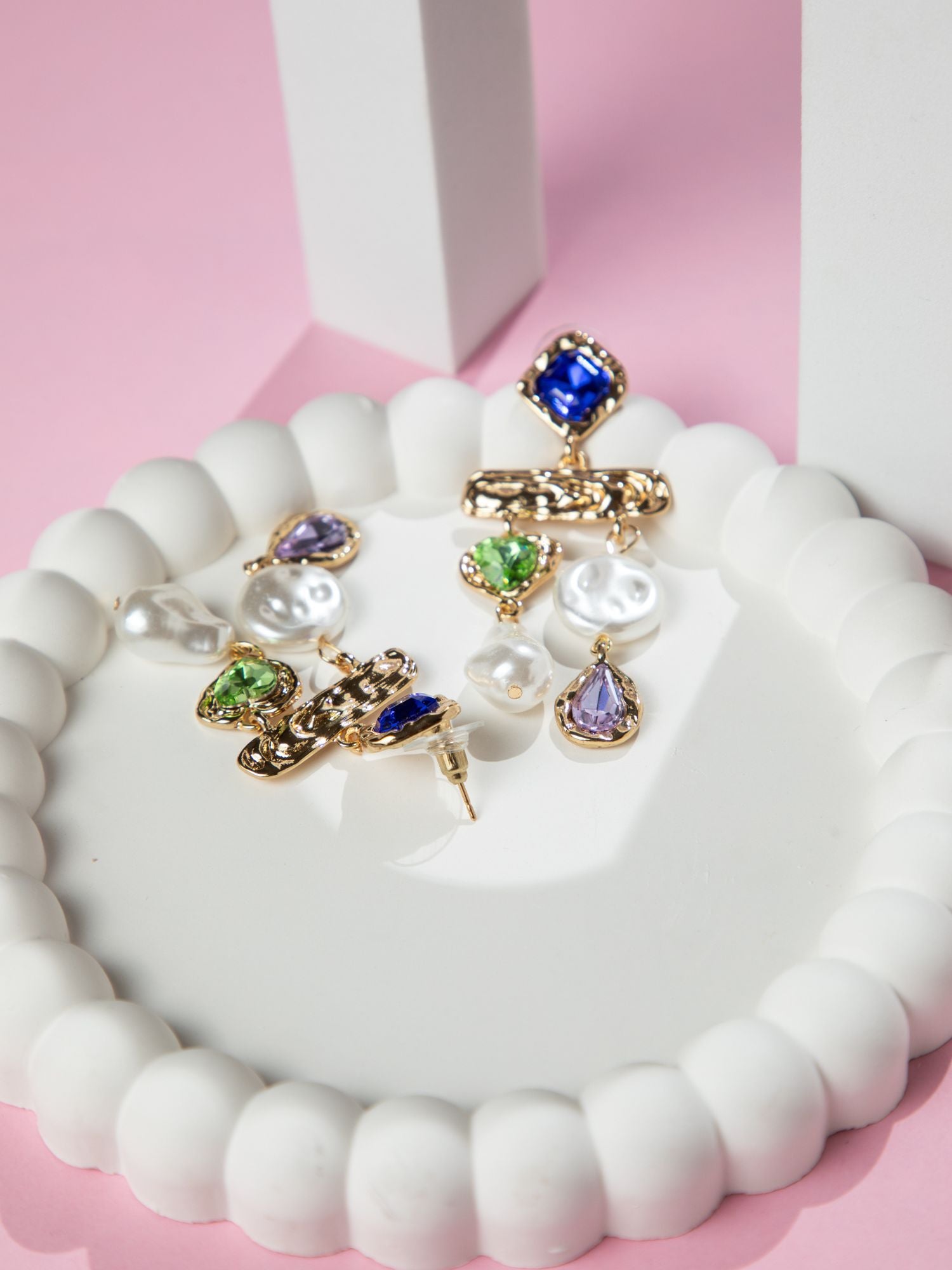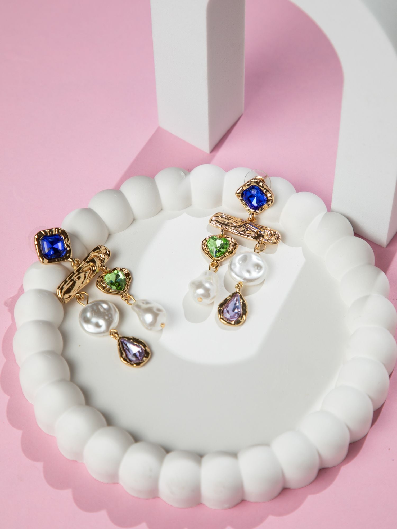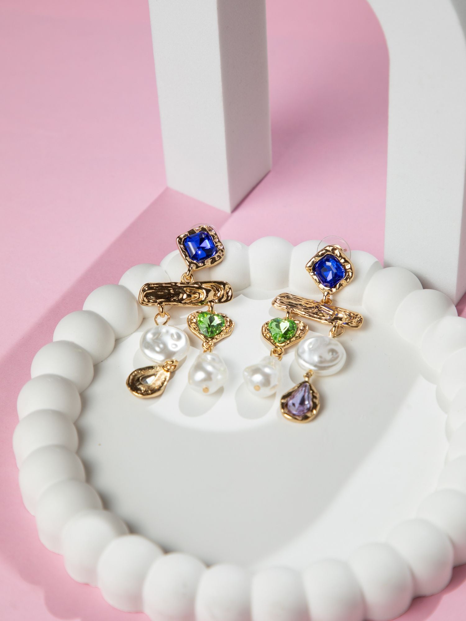 Gold Plated Dangler Earrings with Green and Blue Stones and Faux White Pearls