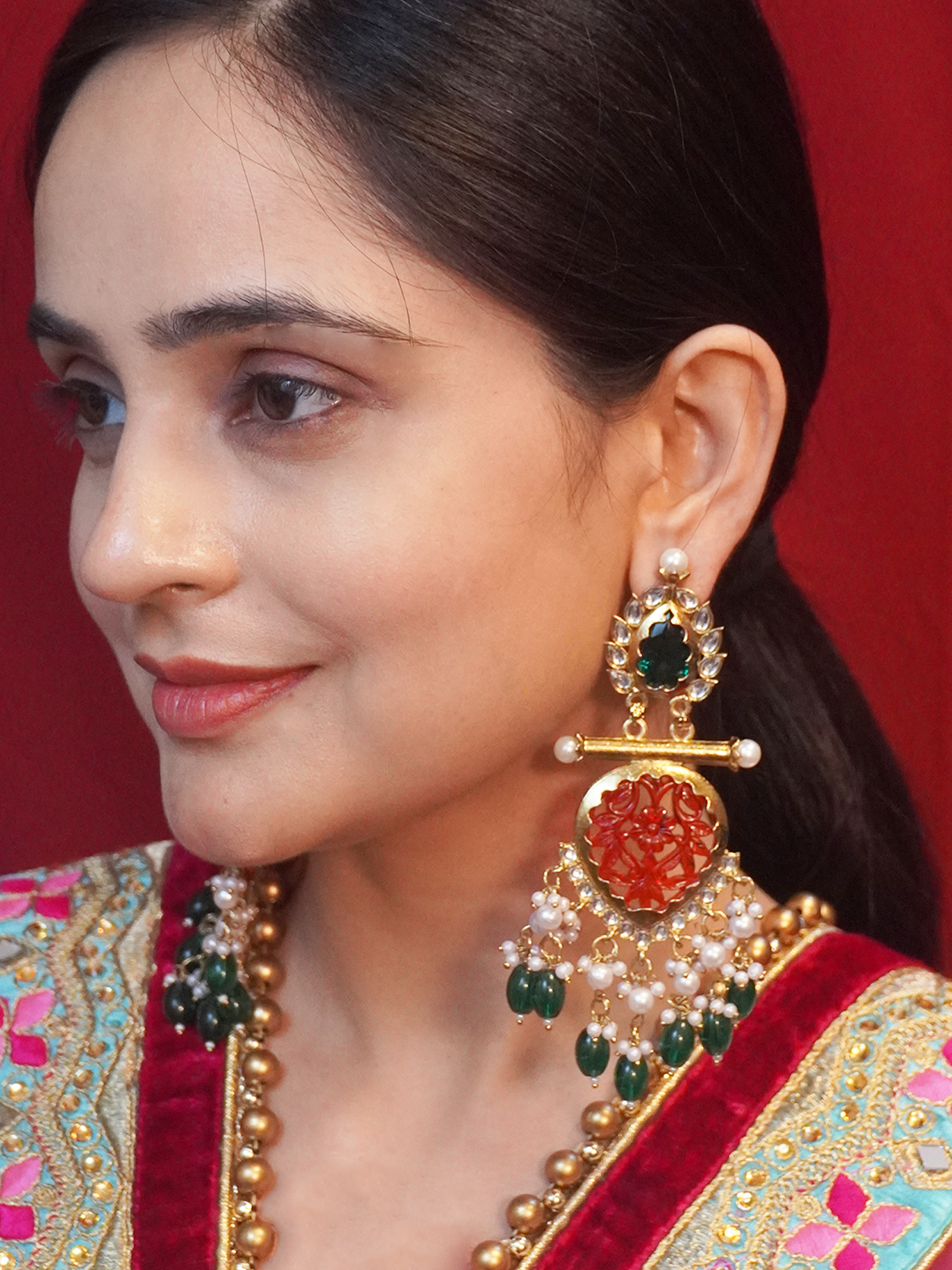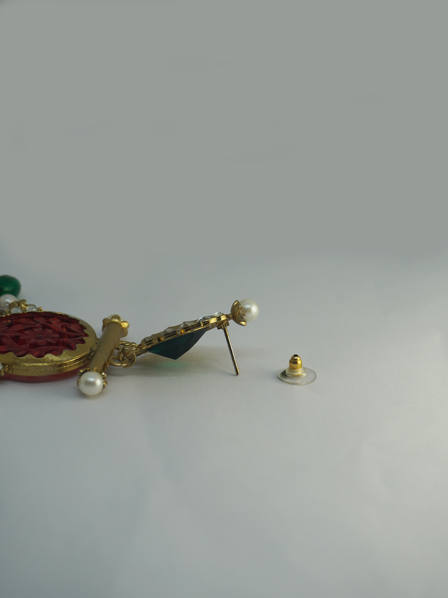 Introducing these exquisite gold-plated dangler earrings featuring green and red stones with floral engravings. The top green stone is surrounded by a layer of water drop kundan stones, complemented by dangling white and green beads. Handcrafted by local artisans, these earrings showcase a modern and latest design, perfect for wearing to festivals or functions, adding a touch of elegance to any outfit.