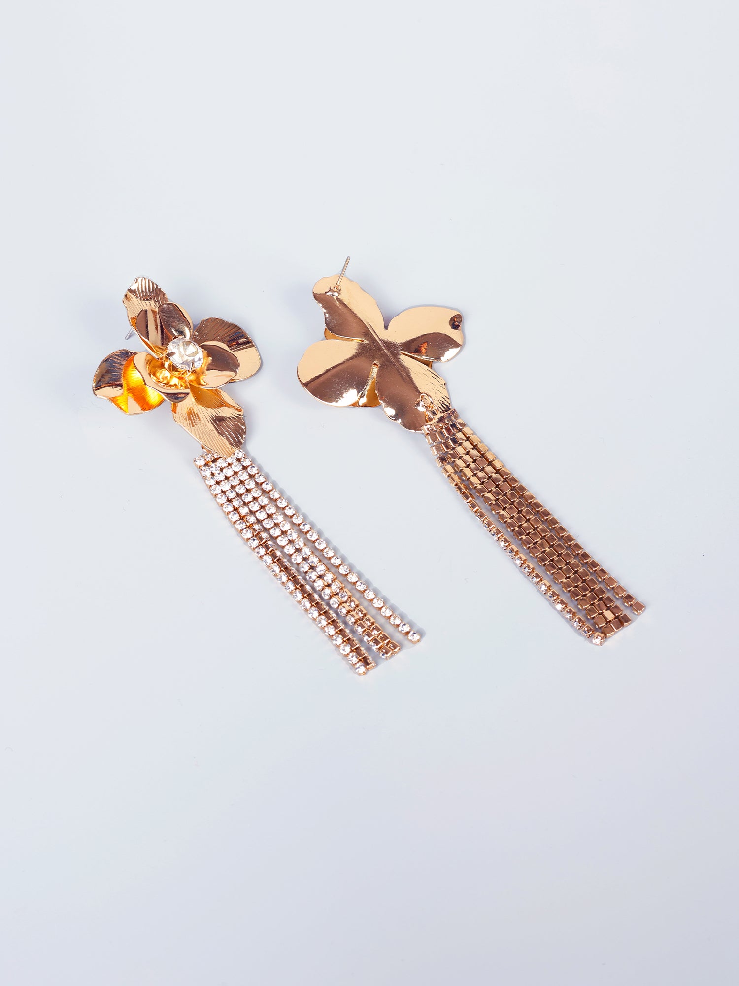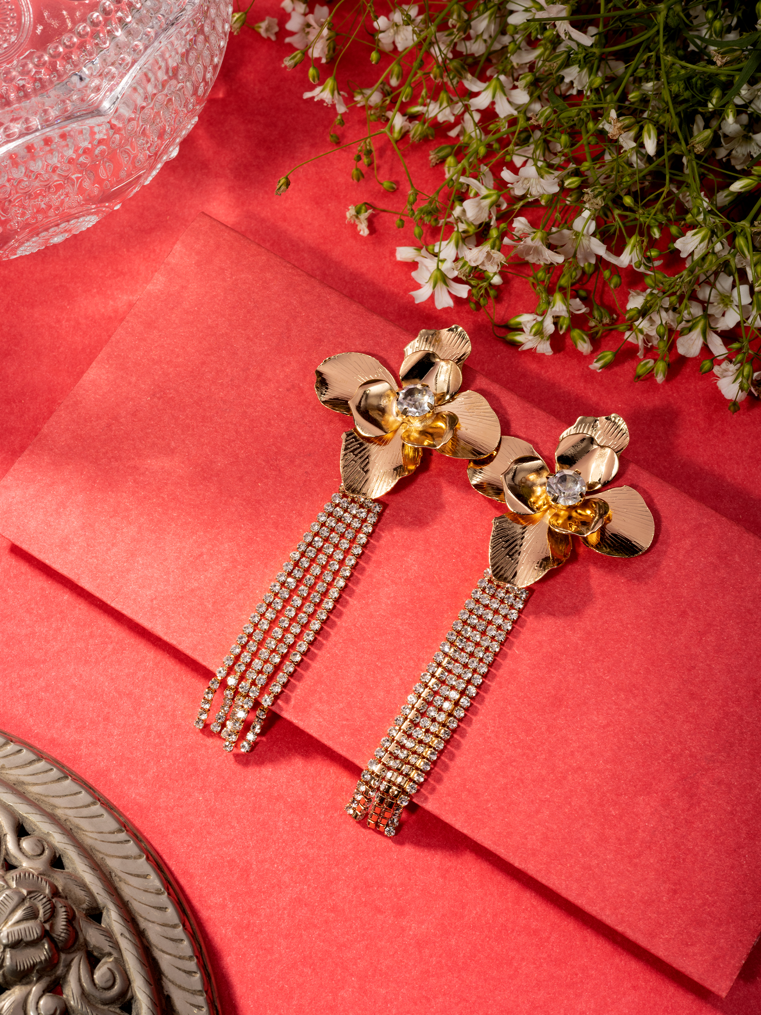 Introducing our exquisite Gold-Plated Floral Design White CZ Stone Studded Long Earrings, featuring a beautiful floral design with a white stone at the center. Sparkling white stones adorn the multi-layered chain hanging at the bottom, adding enchanting elegance to any ensemble. A must-wear accessory for functions or festivals, these earrings boast the latest in skillful craftsmanship and modern style. Handmade by local artisans, they offer anti-allergic and anti-tarnish properties for lasting comfort. Perfect for parties or special occasions, these earrings elevate your look with timeless sophistication.