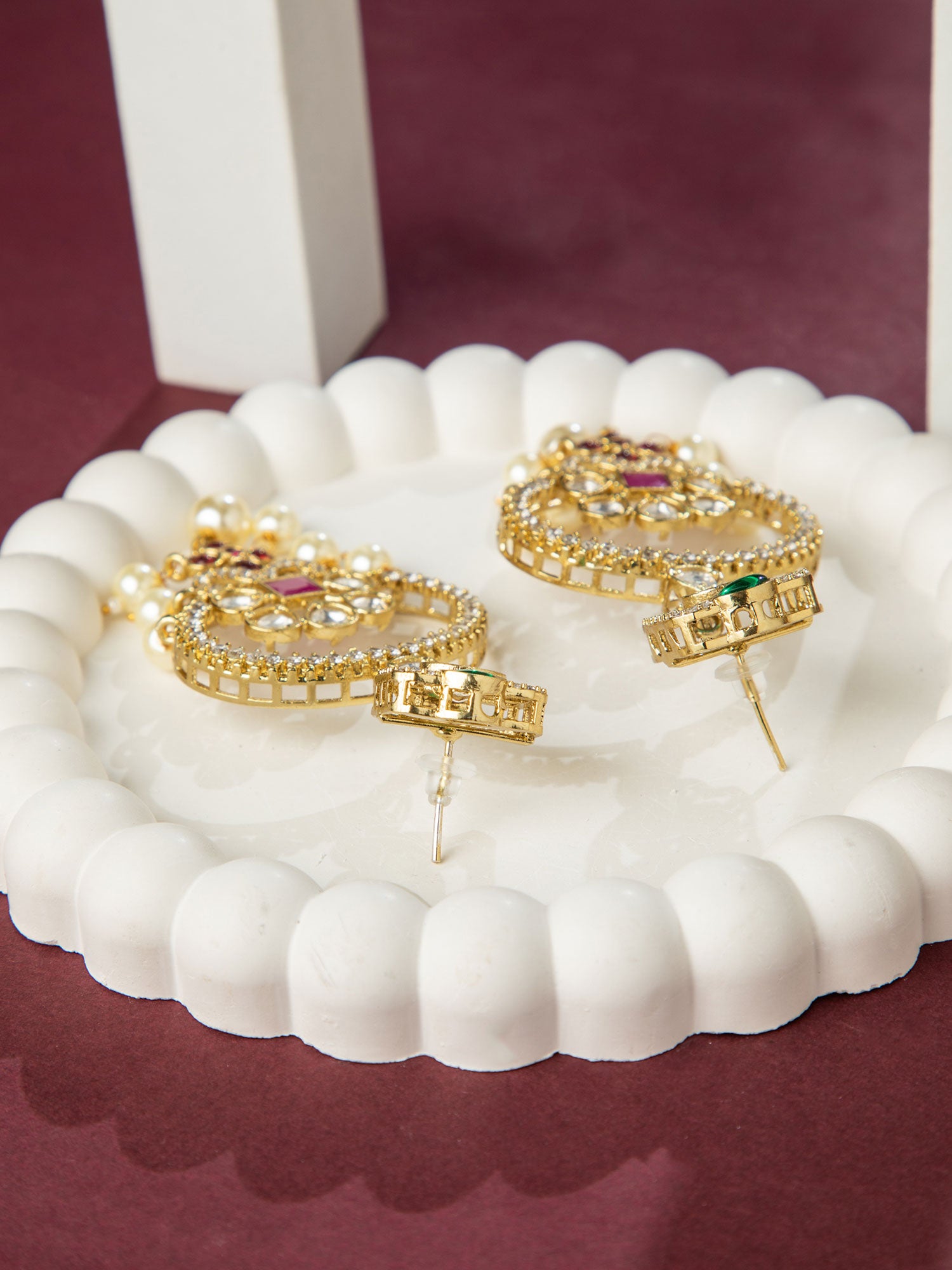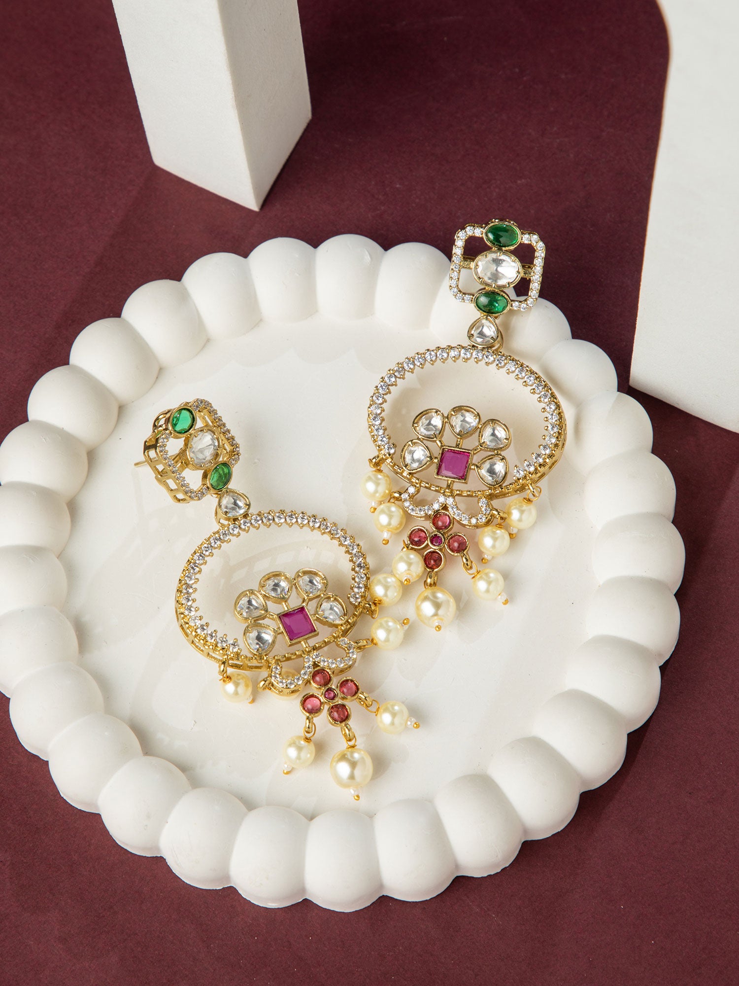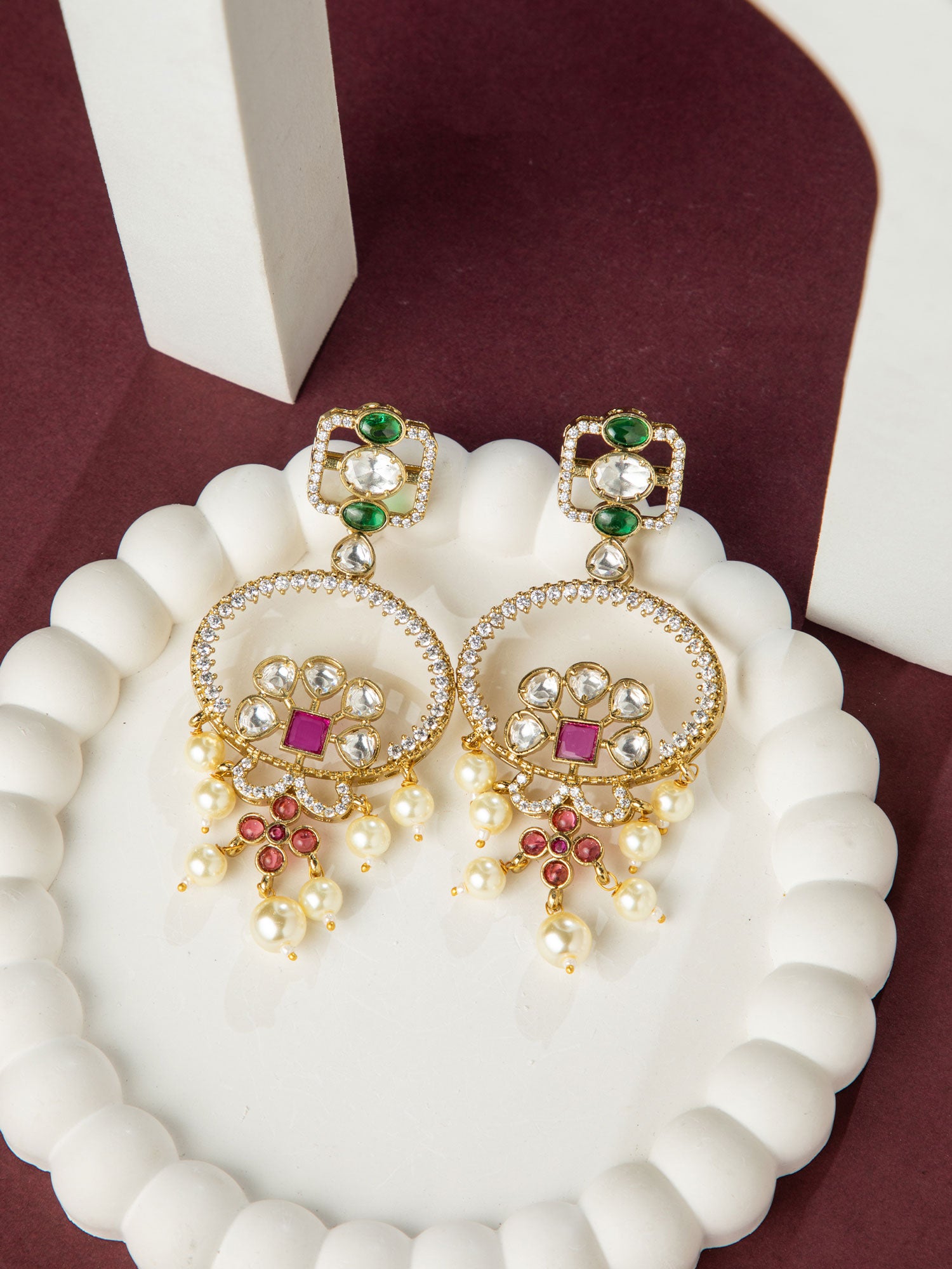 Gold Plated Floral Stone and Pearl Long Earrings