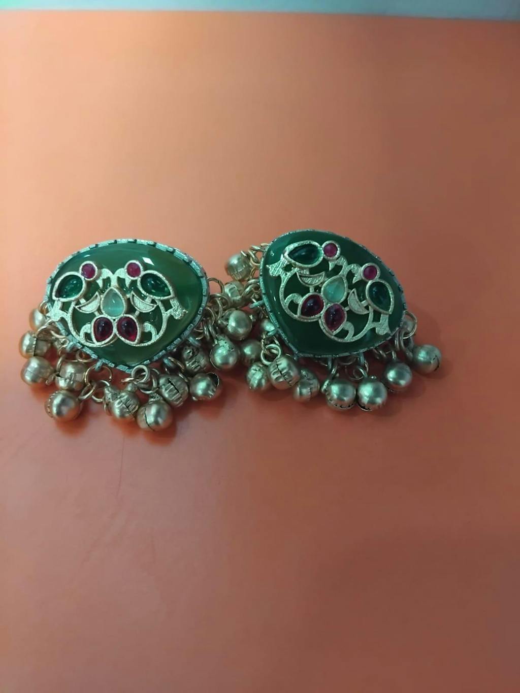Mesmerizing gold-plated earrings featuring a large green stone with ruby and emerald accents. Adorned with gold-plated metal pearls, this floral-inspired design is handcrafted by local artisans. A must-have for parties, festivals, or functions, offering a modern, elegant touch.