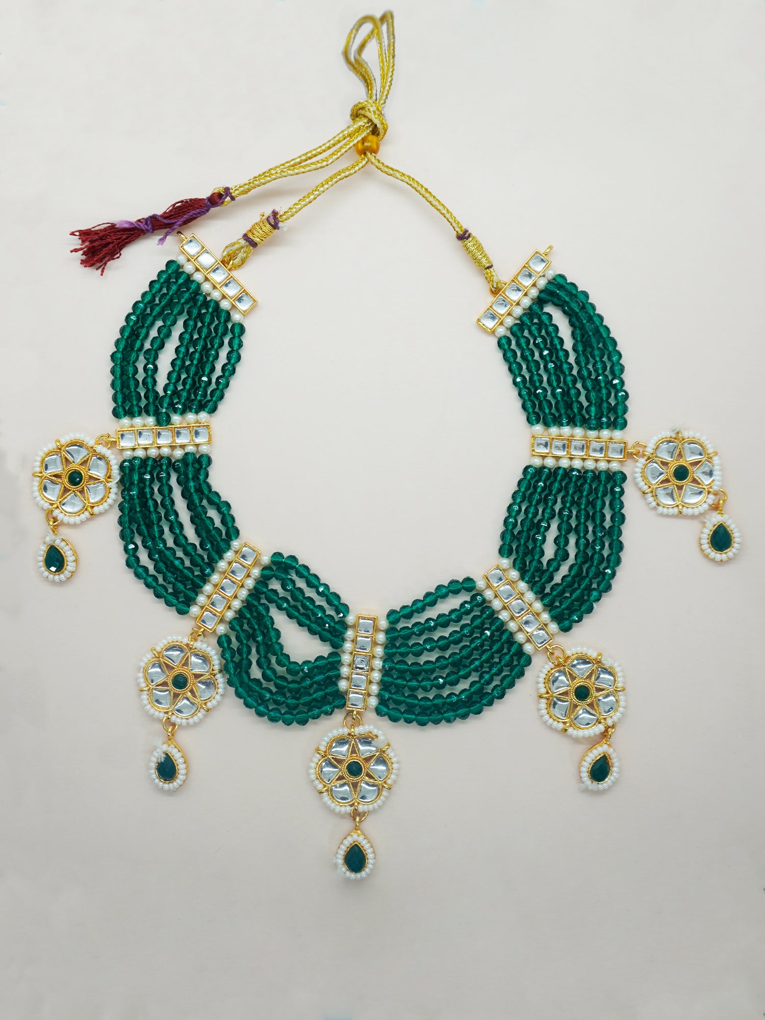 Pair this gold-plated kundan and pearl jewelry set with a rich, traditional saree or lehenga in shades of red, green, or gold to complement the emerald accents. For a more modern yet ethnic look, wear it with an elegant anarkali dress or a fusion outfit, allowing the intricate design to shine as your statement piece. This set is perfect for weddings, festivals, or any grand occasion where you want to exude timeless elegance.