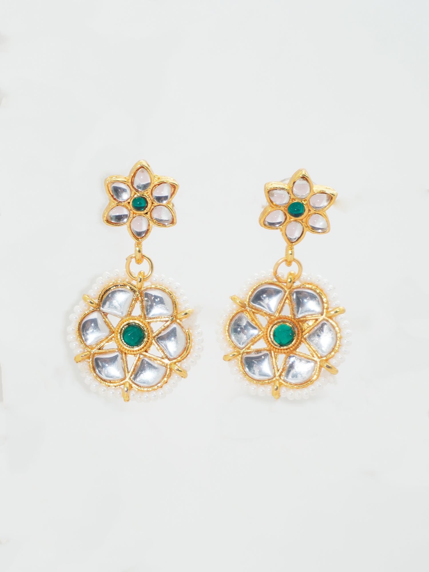 This exquisite jewelry set features a perfect blend of traditional and contemporary design, crafted with gold plating, kundan stones, lustrous pearls, and vibrant emerald accents. The intricate kundan setting enhances the rich beauty of the pearls, while the emerald stones add a touch of color and elegance to the set.