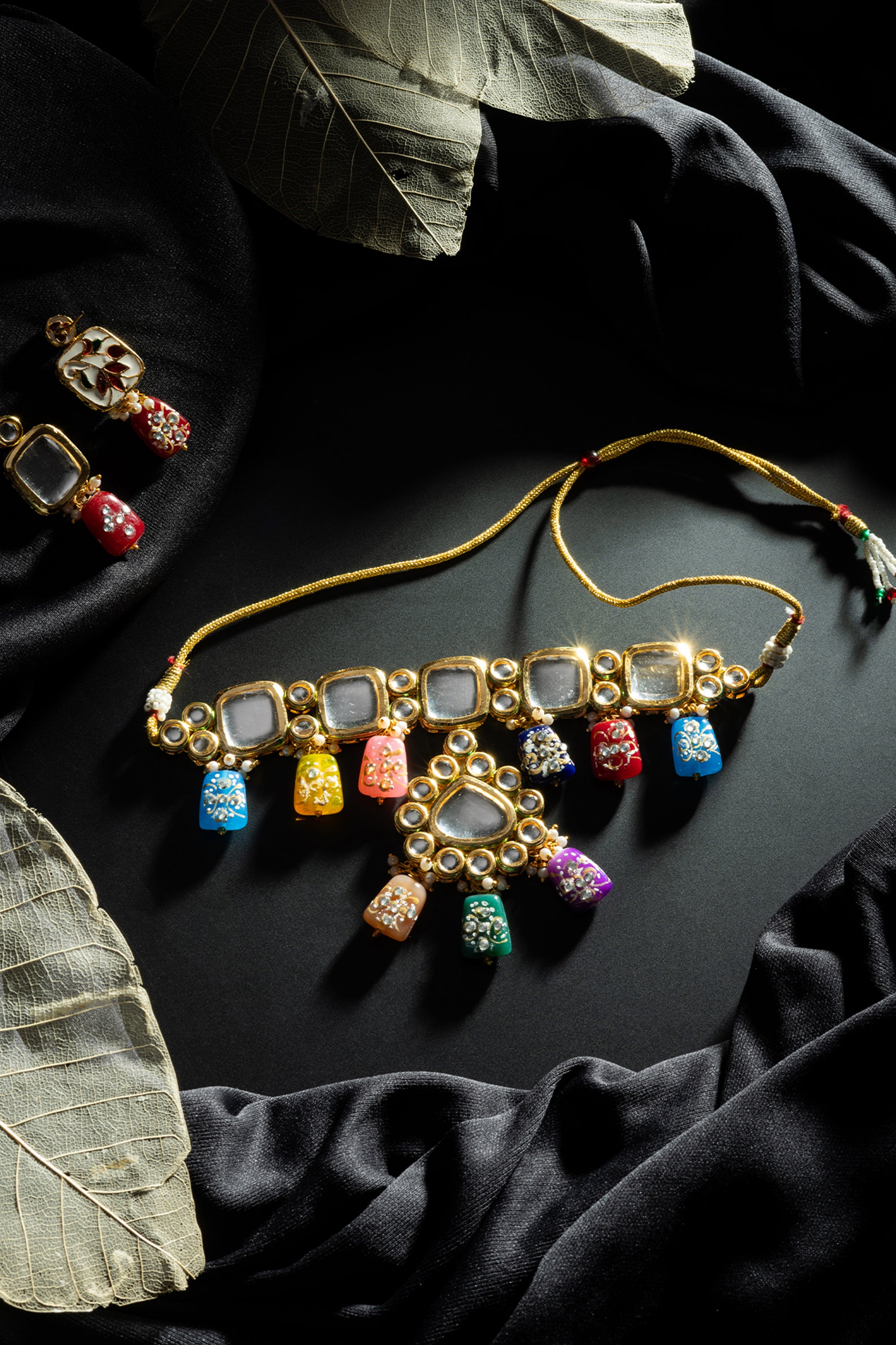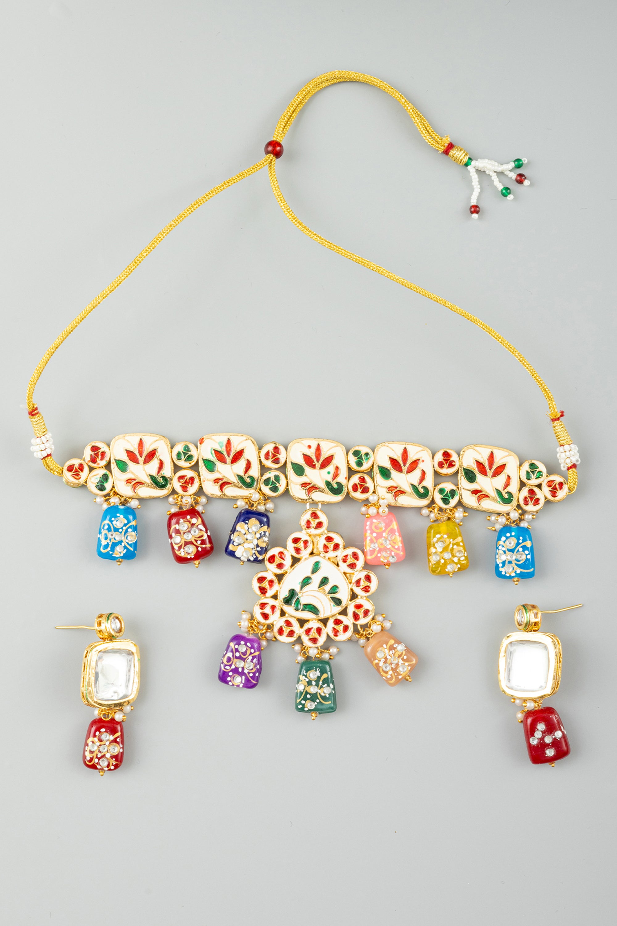 Introducing our Gold Plated Kundan Meenakari Necklace Set with Earrings—a timeless fusion of tradition and contemporary allure. This attractive and captivating set is meticulously crafted in the latest design, perfect for parties and special occasions. The gold-plated finish adds a touch of glamour, while the intricate Multi Colored Stones with carving showcase a stylish and elegant aesthetic. Immerse yourself in the charm of this Traditional Necklace Set, a perfect accessory that seamlessly blends traditional craftsmanship with modern fashion. Elevate your ethnic charm by pairing our Gold Plated Kundan Meenakari Necklace Set with a vibrant saree or lehenga. Let this traditional set take center stage, allowing the intricate Multi Colored Stones with carving to complement the richness of your ensemble. Keep other accessories minimal to highlight the captivating details of this stylish and elegant necklace set. Embrace the cultural flair and make a statement at any festive occasion.