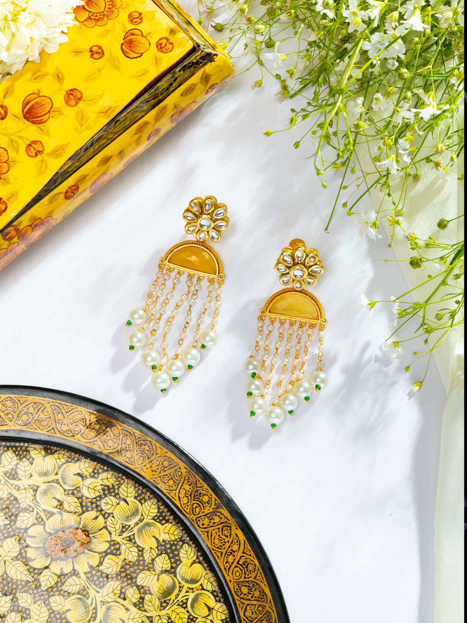 Elevate your grace with our Gold-Plated Kundan Danglers. These Jaipuri earrings feature an enchanting floral design adorned with Kundan stones and a vibrant yellow stone centerpiece. Embellished with white pearls, these ethnic earrings, perfect for festivals and functions, are meticulously handcrafted from high-quality brass, ensuring both durability and luxury. Skillfully made by local artisans, these dazzling danglers embody the cultural opulence and artistic finesse of Jaipuri jewelry, making them a splendid addition to your ethnic jewelry collection, radiating sophistication.