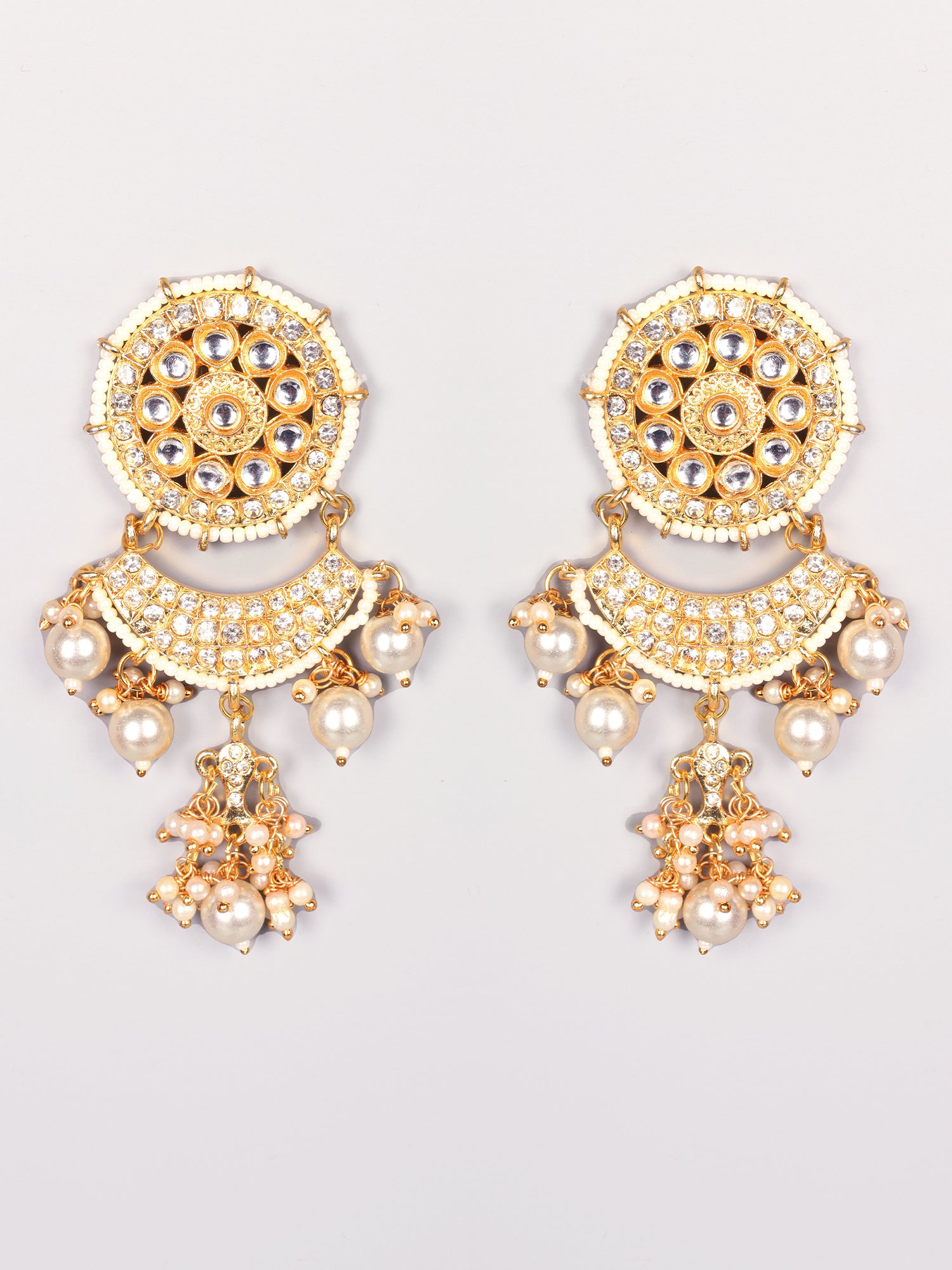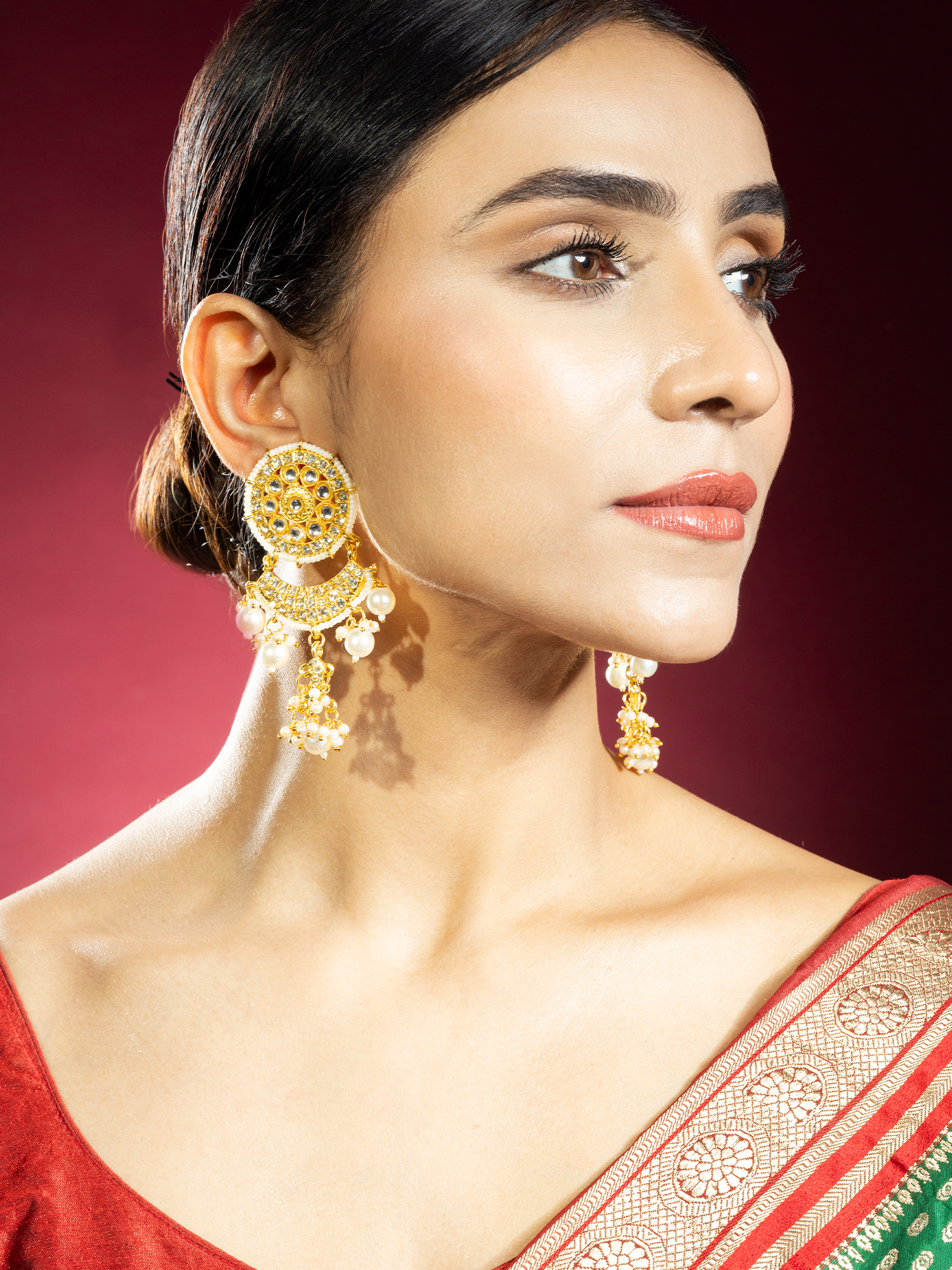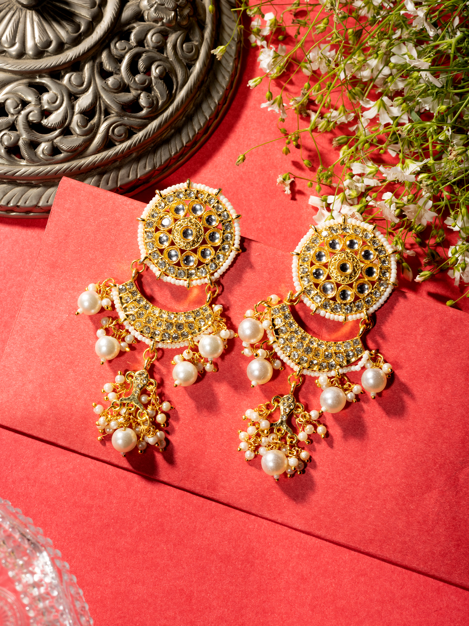 Introducing our captivating Gold Plated Pearl, Kundan, and White Stone Chandbali Earrings, featuring an alluring design adorned with AAA+ grade small white CZ stones, kundan, and pearls. Beautiful pearls elegantly dangle at the bottom, adding an extra touch of charm. These earrings are artfully crafted by local artisans, showcasing a contemporary style suitable for both daily wear and special occasions. Elevate your ensemble with these handcrafted earrings, perfect for adding a touch of sophistication to any outfit.