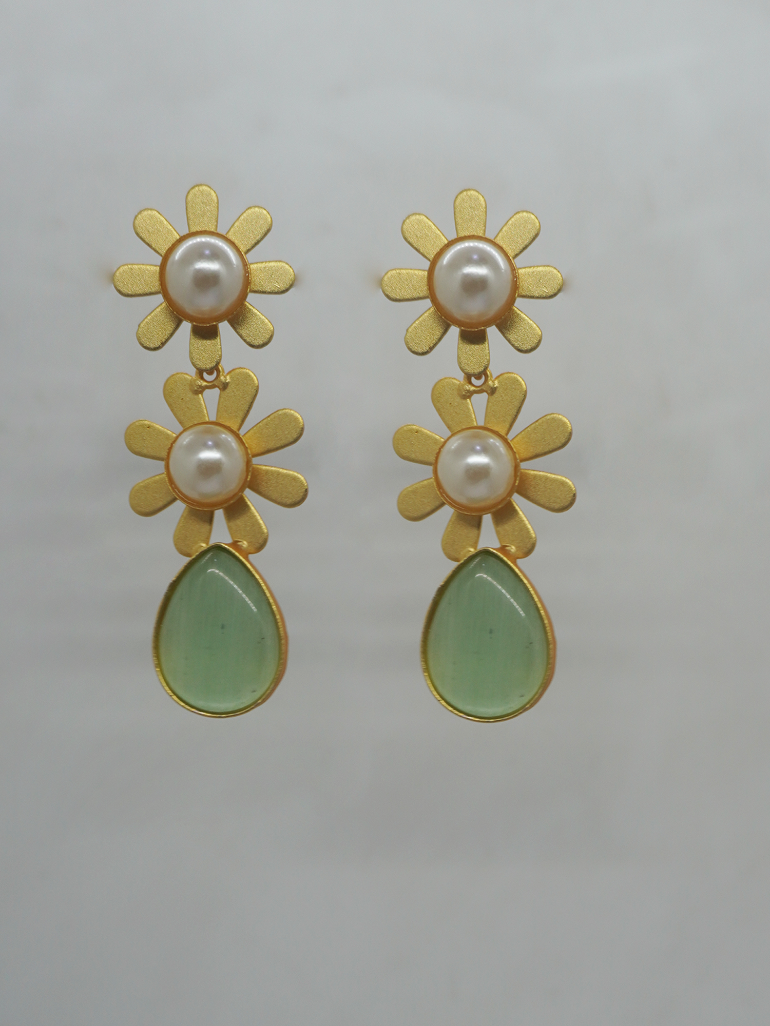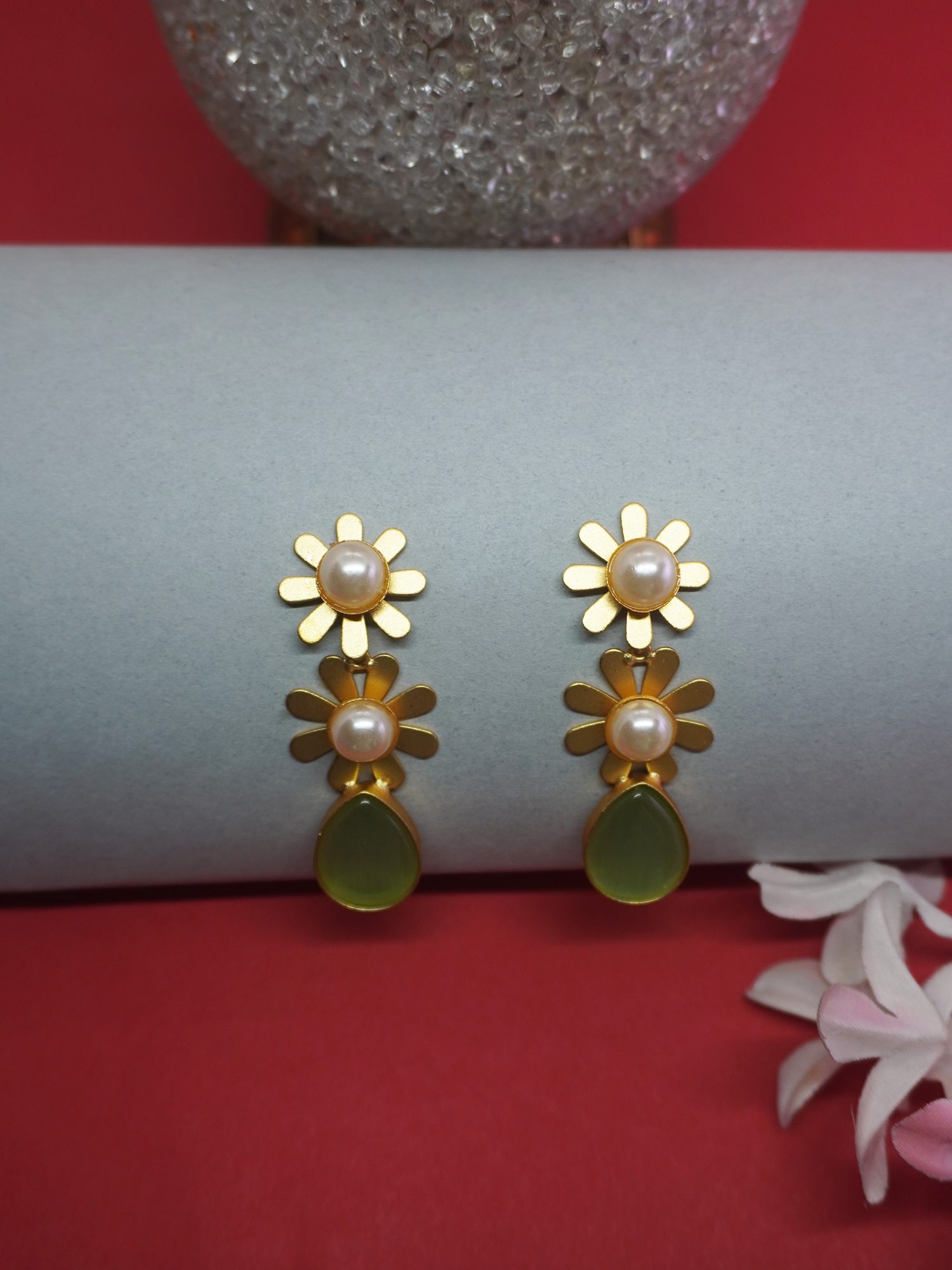 Explore elegance with our Gold Plated Matte Finish Floral Earrings featuring a green water drop stone at the bottom and a white faux pearl in the center of the floral design. Handcrafted by local artisans, these earrings embody modern sophistication, perfect for daily wear or enhancing your party attire with a touch of refined style.