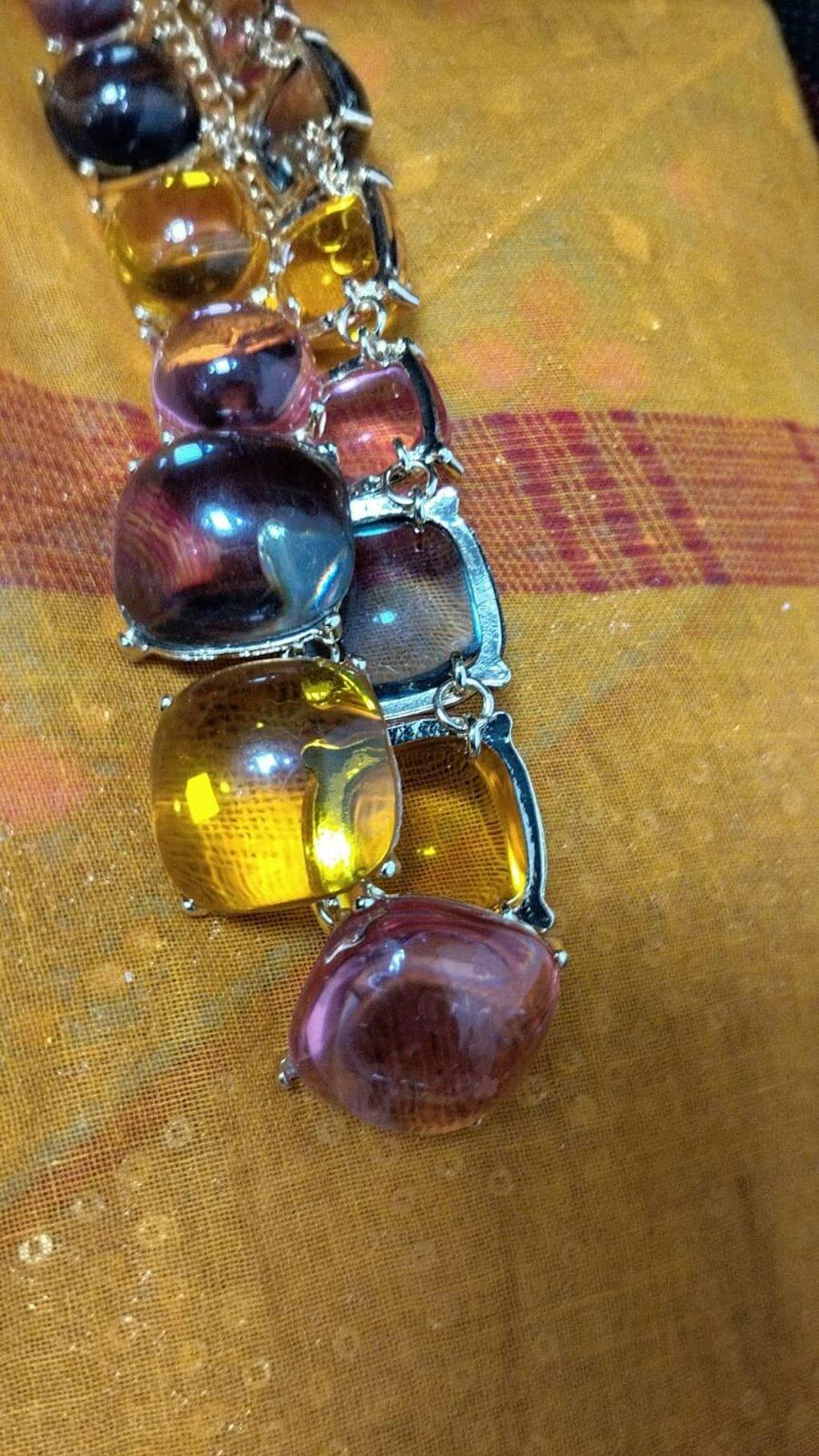 Pair this Gold-plated Multi-Colour Translucent Stone Necklace with a solid-colored outfit to let the vibrant stones stand out. Opt for a sleek updo to showcase the intricate design of the necklace.
