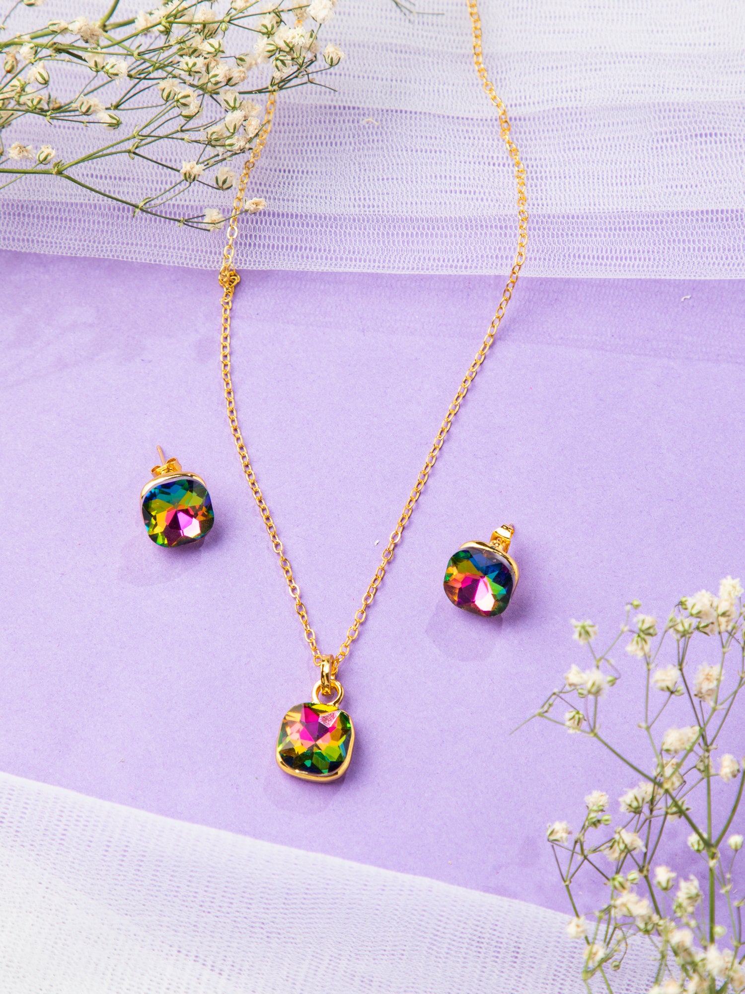 Gold Plated Necklace Set with Earrings featuring a mesmerizing multicolor radiating stone pendant and elegant chain. Paired with enchanting multicolor stud earrings, this unique and latest design is perfect for daily wear as well as functions, adding vibrant charm to any look.