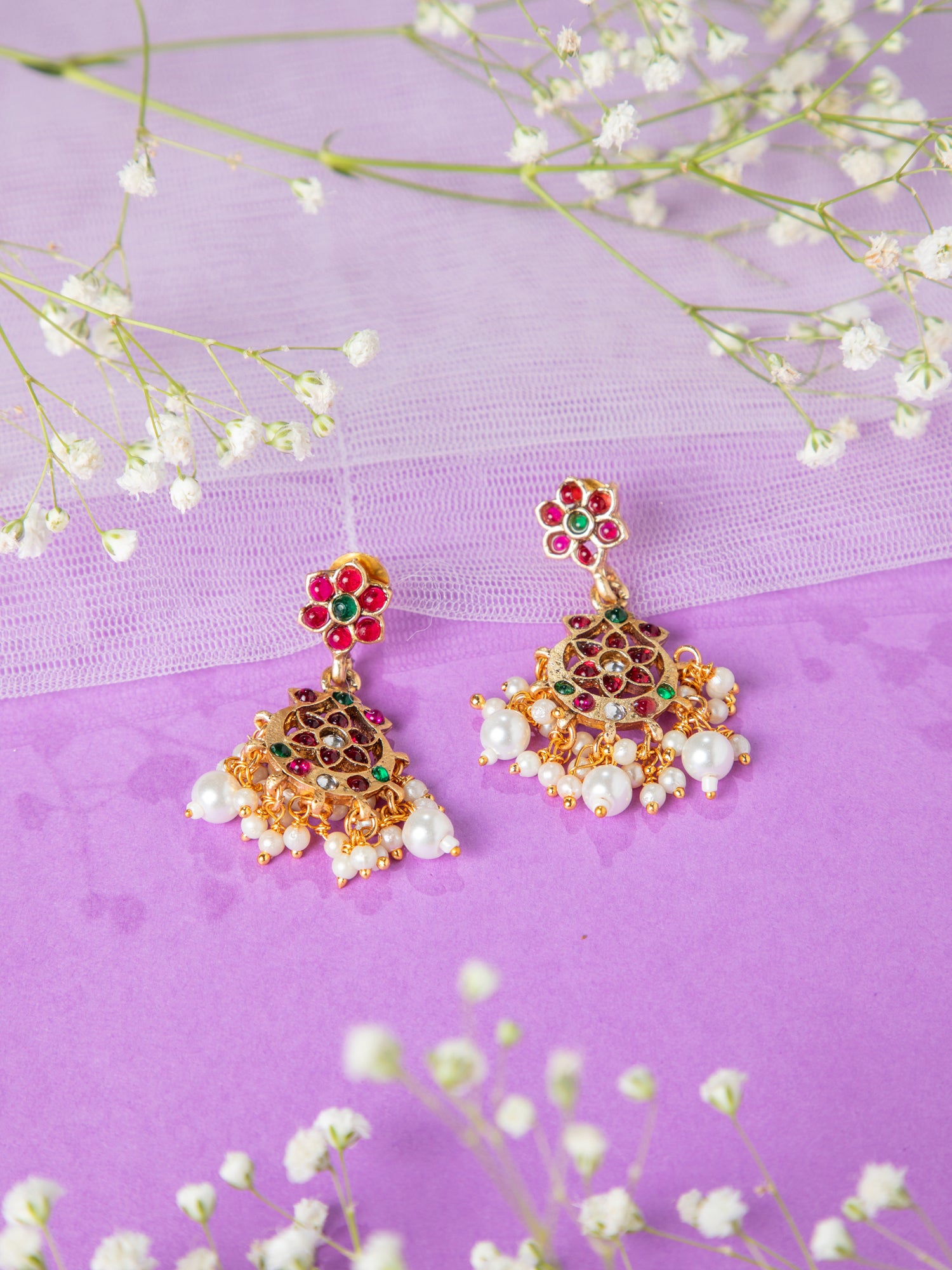 Gold Plated Multilayered Green Beads Necklace and Earrings set with Multicolor Stones and Faux Pearls