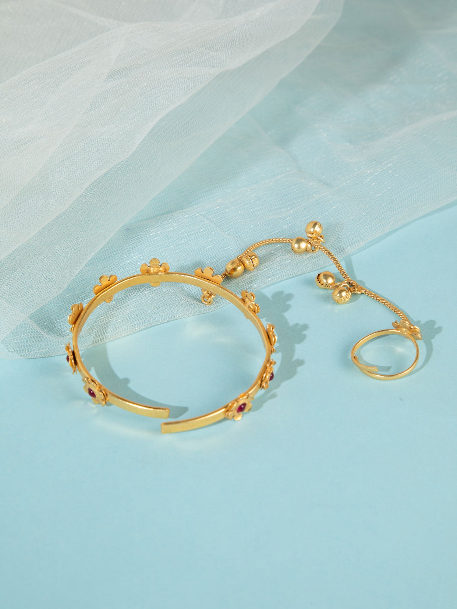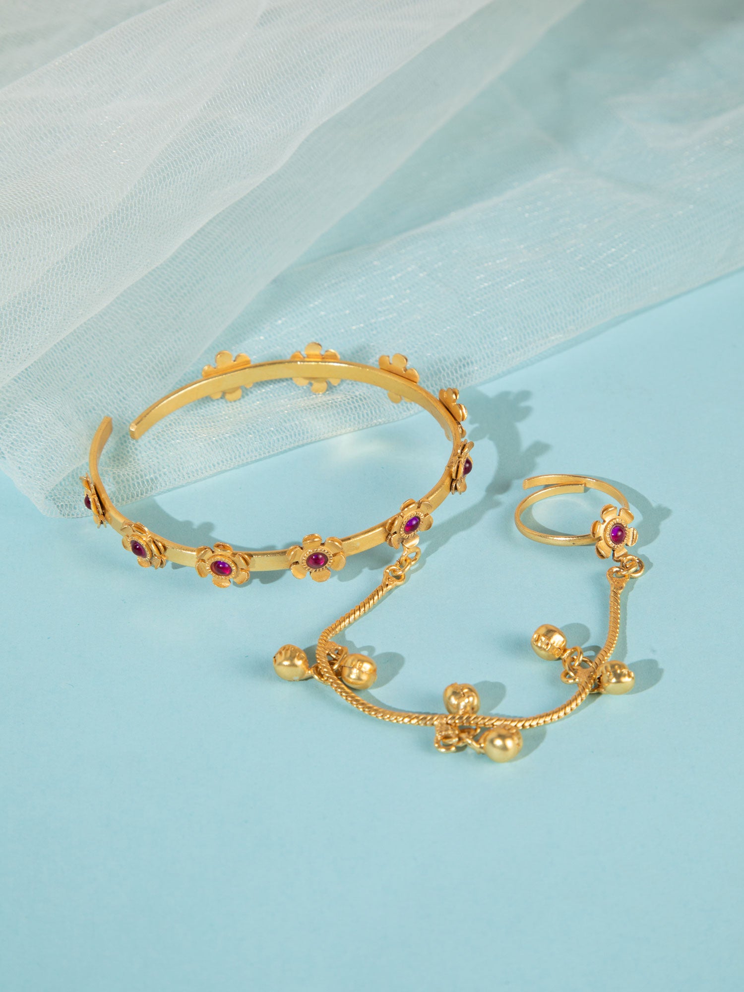 Enhance your traditional look with this stunning gold-plated haathphool, beautifully designed with intricate floral motifs and adorned with delicate ghungroo accents. The elegant flower design adds a soft, feminine charm, while the tiny ghungroos bring a subtle rhythmic movement and festive vibe. Crafted with fine detailing and a rich gold finish, this piece perfectly blends tradition with grace, making it ideal for weddings, mehendi functions, and festive celebrations.