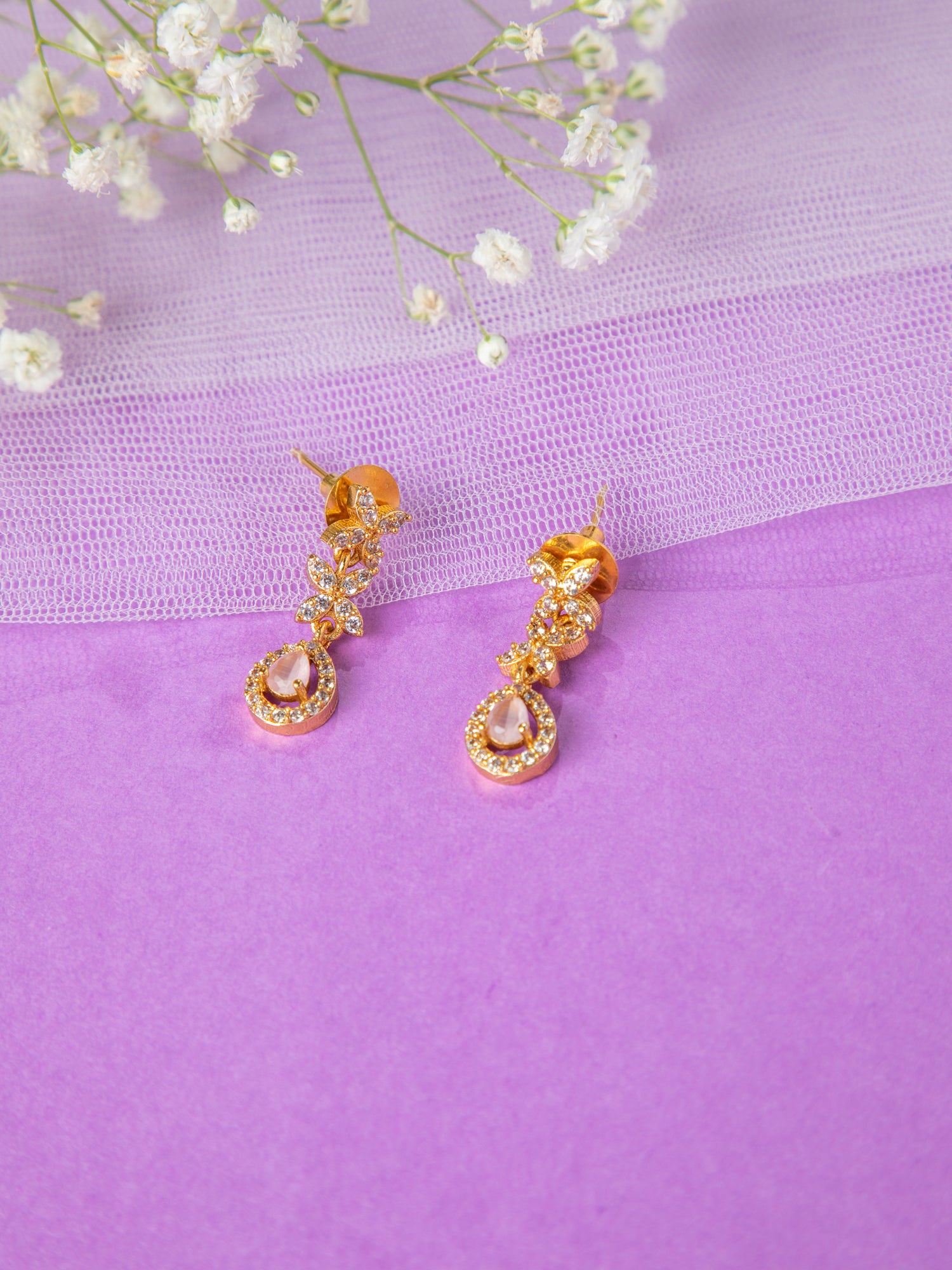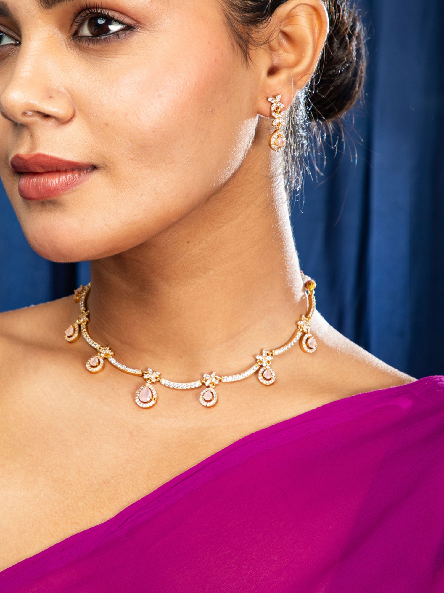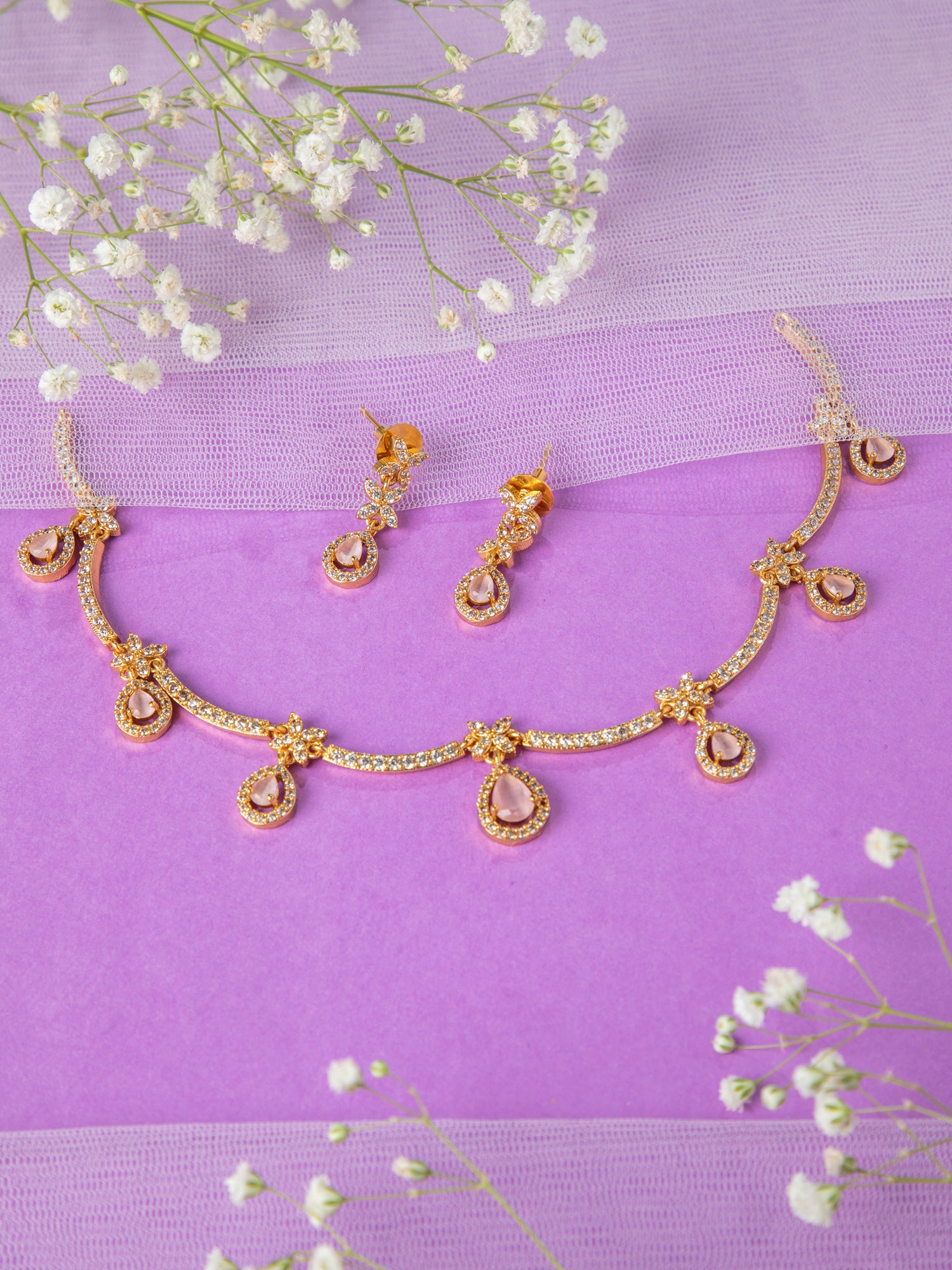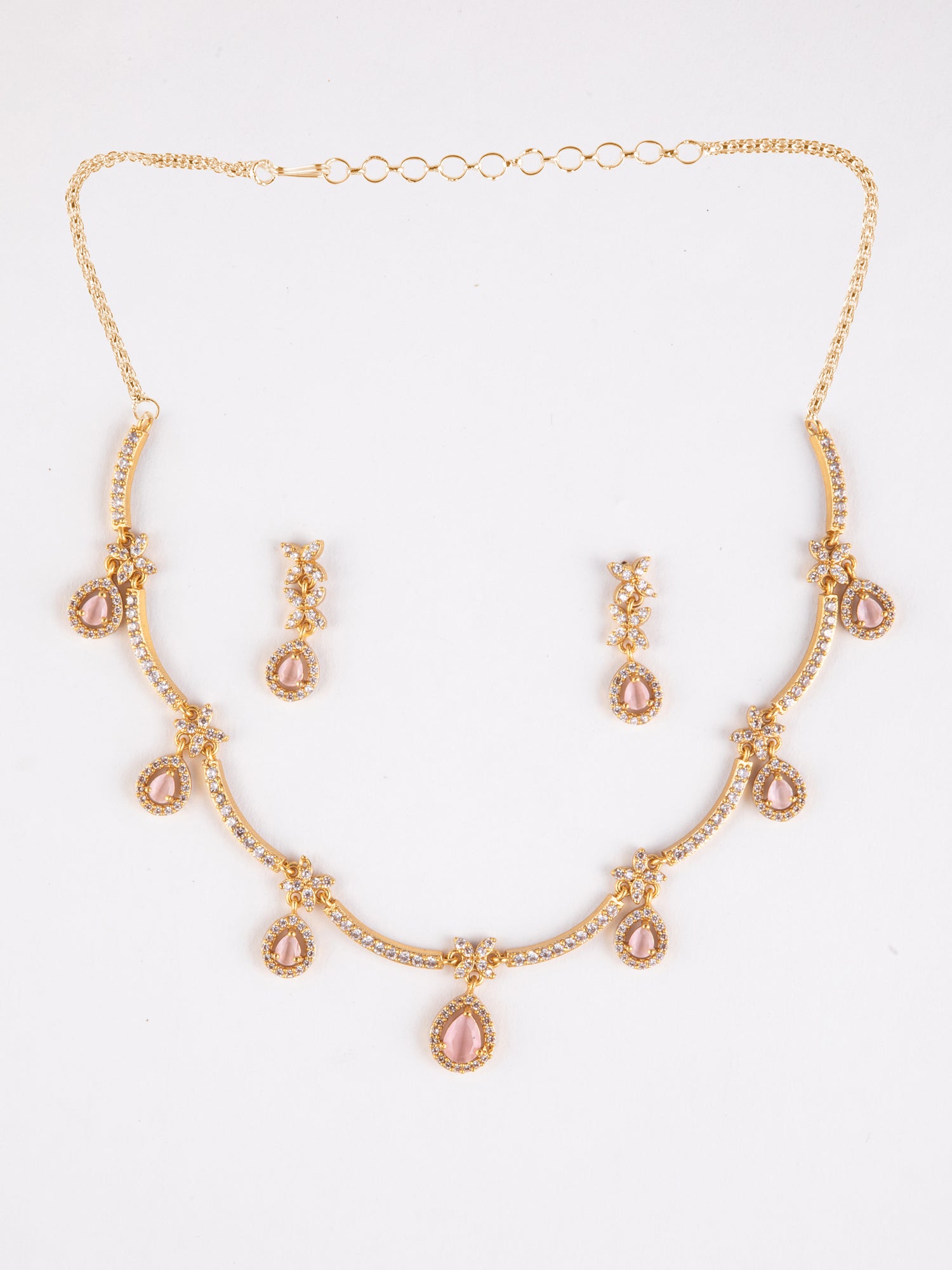Gold Plated Pink Water Drop Stone and White CZ Necklace and Earrings Set