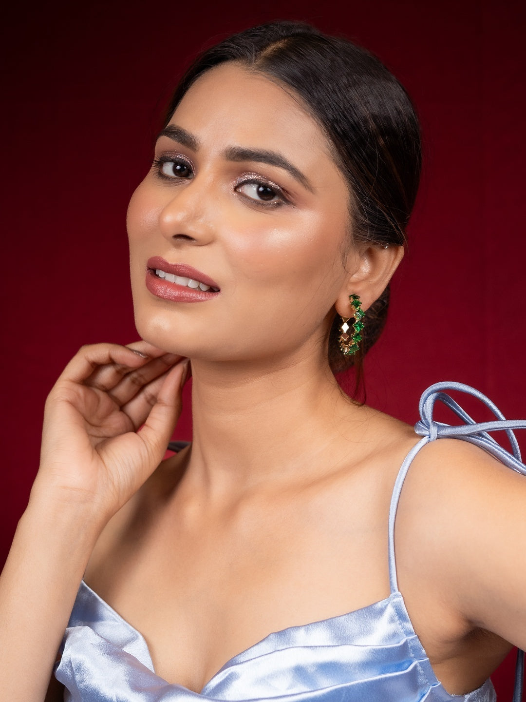 Pair these rhodium-plated emerald and American diamond stud earrings with a classic black dress or a sleek tailored suit for a sophisticated, polished look. For a more casual yet elegant vibe, wear them with a white blouse and high-waisted trousers, allowing the earrings to add a pop of color and luxury to your outfit.