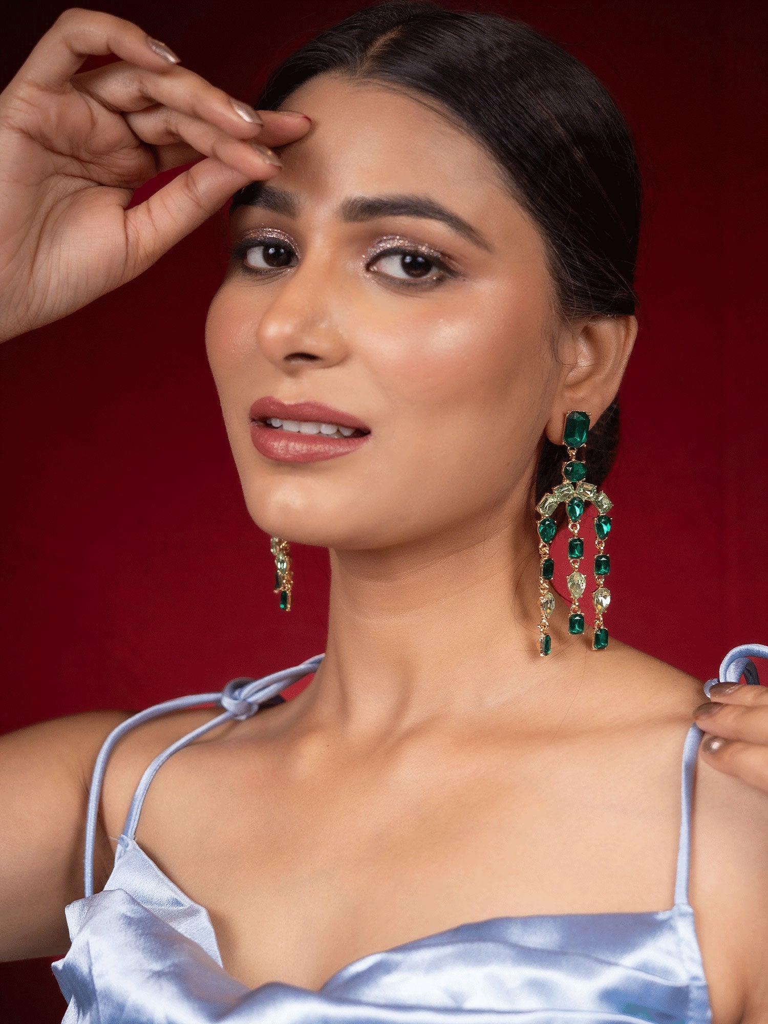 Let these gold-plated green gemstone chandelier drop earrings be the highlight of your look by pairing them with a deep green or gold outfit. Style your hair in a sleek bun or soft waves to showcase their intricate design. Complement the look with a matching statement ring or a delicate gold bangle for an elegant, well-balanced ensemble.