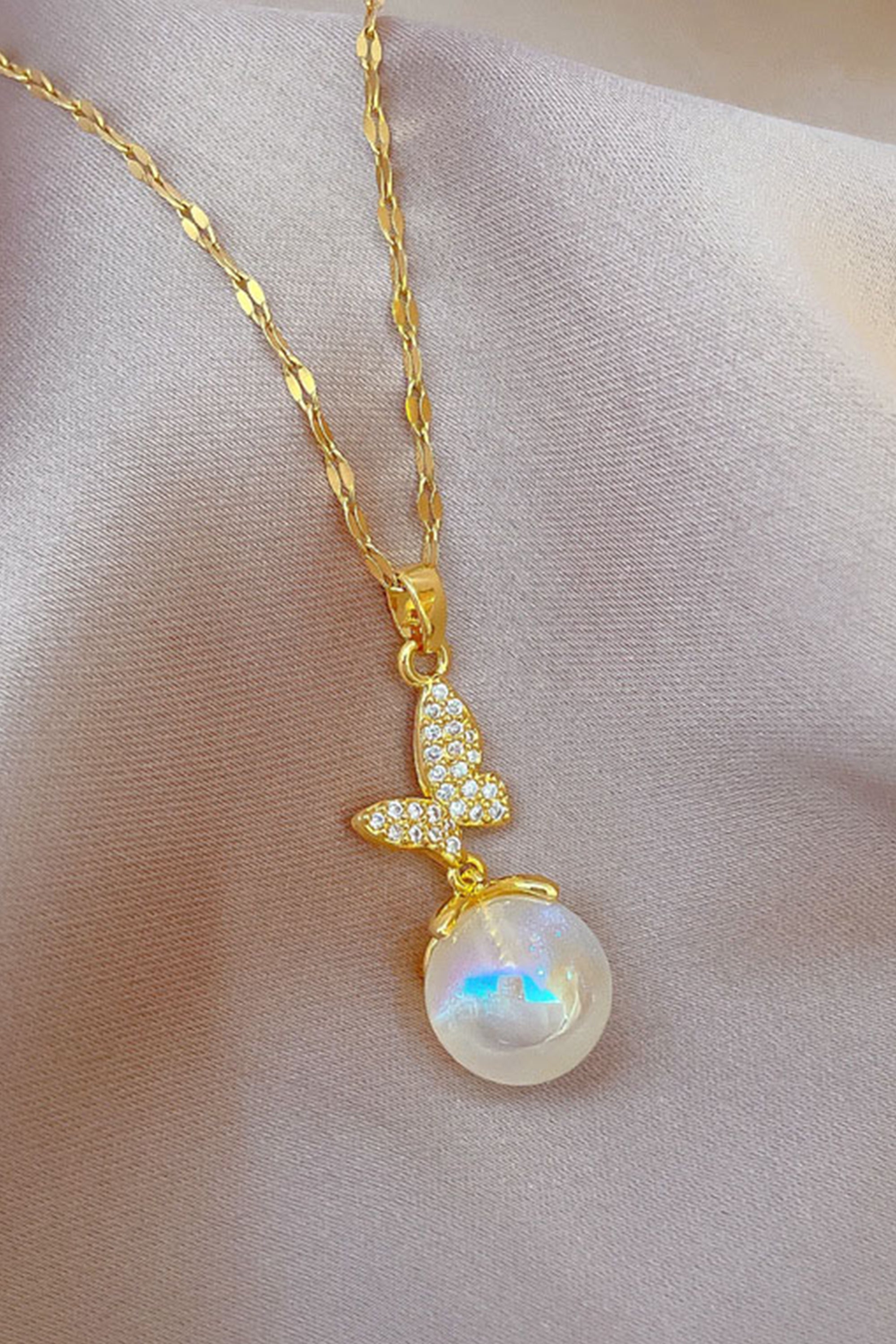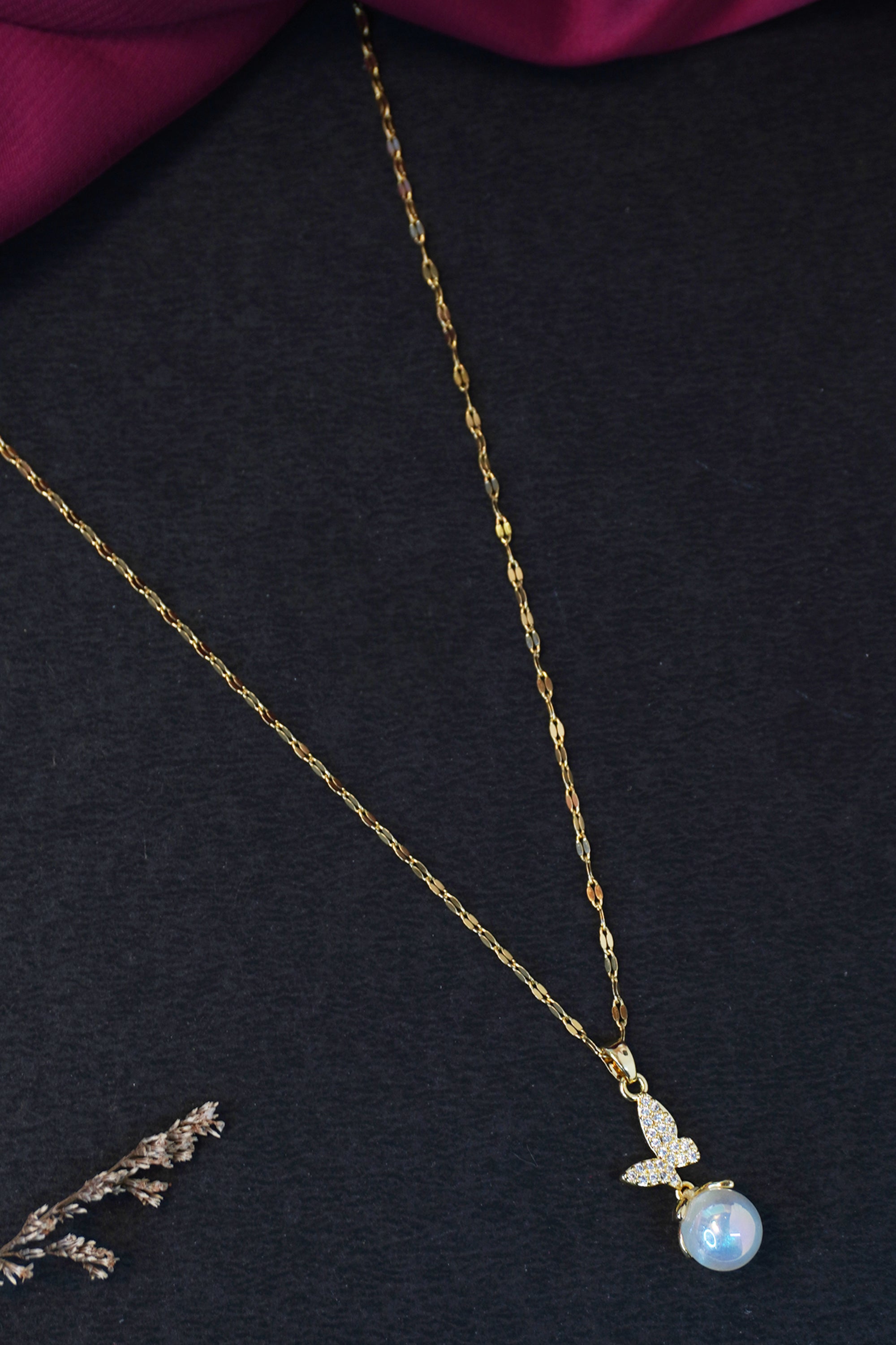 This is a beautiful gold-plated piece of butterfly and pearl pendant. The butterfly is studded with zircon (American diamond) and the pendant chain is made up of high-quality alloy. It is anti-tarnish and skin-friendly. Avoid direct spray of perfume and sweat for the longevity of the necklace. This is perfect for casual or occasional use.