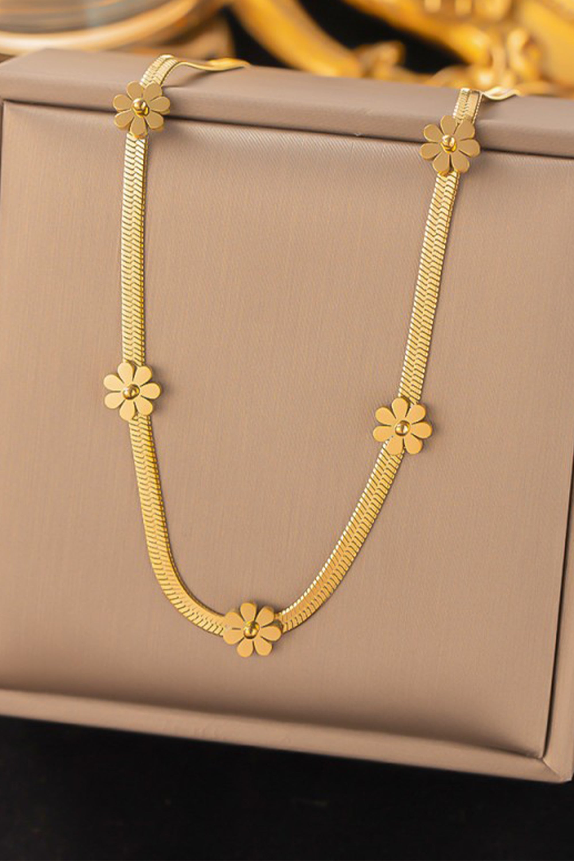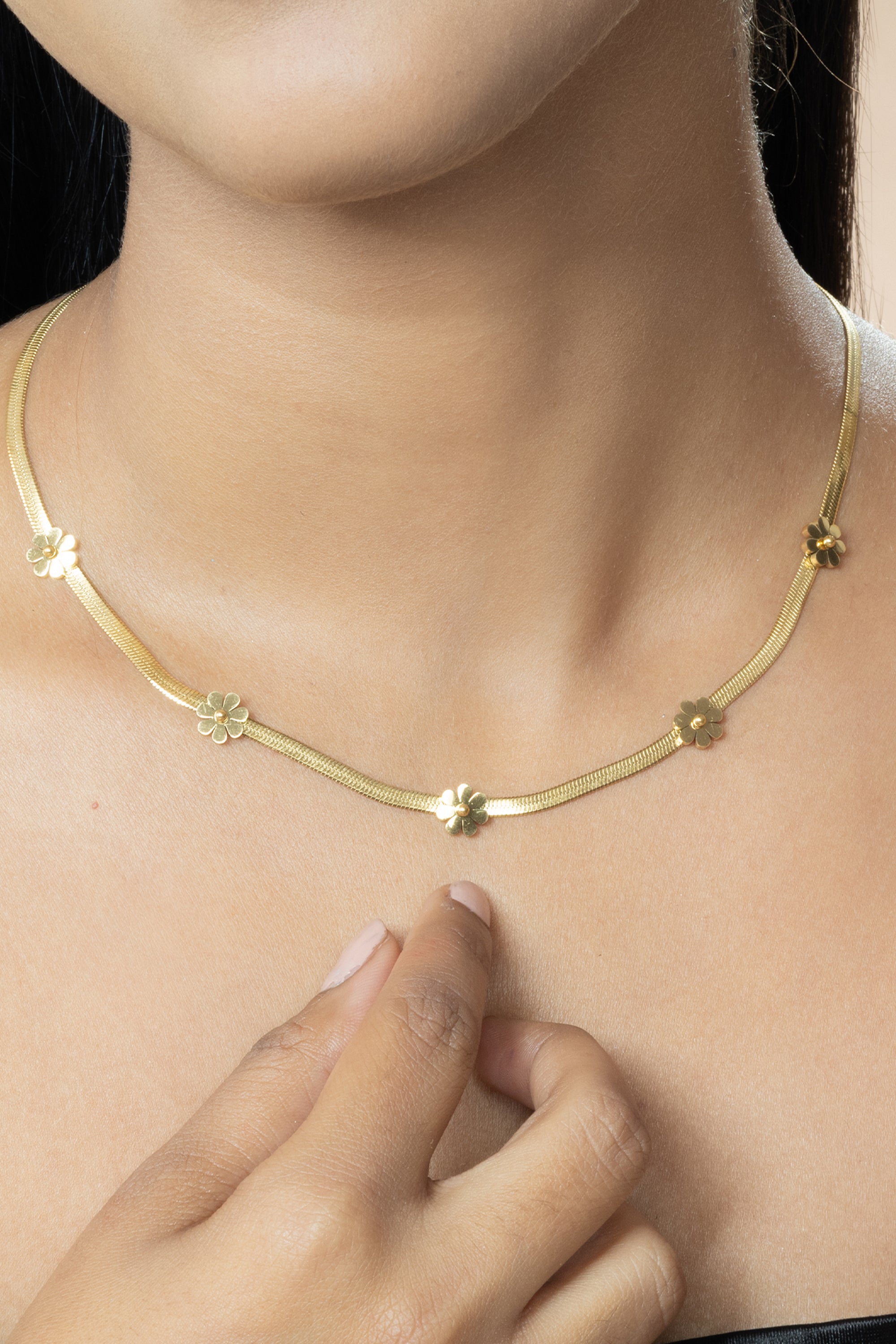 Introducing our Gold Toned Snake Chain Necklace – a harmonious blend of fashion and comfort. Crafted with an anti-tarnish, anti-allergic design, and skin-friendly attributes, this necklace ensures enduring allure. The attractive gold polish with Rhodium plating and intricate gold-plated floral leaves design showcases the latest in fashion, making it a captivating accessory for your collection. Elevate your style effortlessly with this chic and comfortable necklace. Enhance your everyday elegance by layering our Gold-Toned Snake Chain Necklace with a V-neck or scoop-neck top. The anti-tarnish, anti-allergic design ensures enduring allure, while the gold polish with Rhodium plating and intricate floral leaves add a captivating touch. Embrace a chic look that effortlessly complements your daily fashion.