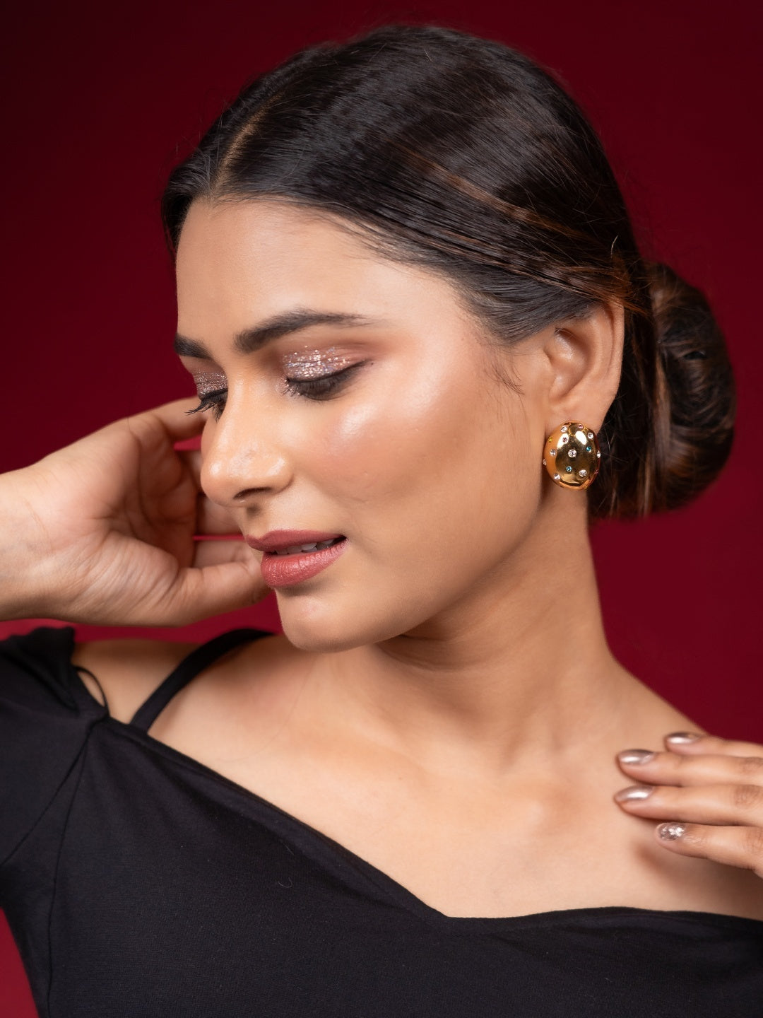 Pair these golden oval multi-colored stone studded studs with a neutral-toned outfit like a beige blouse or a soft pastel dress to let the colors pop. They also complement a vibrant ethnic outfit, such as a saree or lehenga, adding a burst of color to your traditional look. Keep the rest of your accessories minimal to let the earrings stand out.