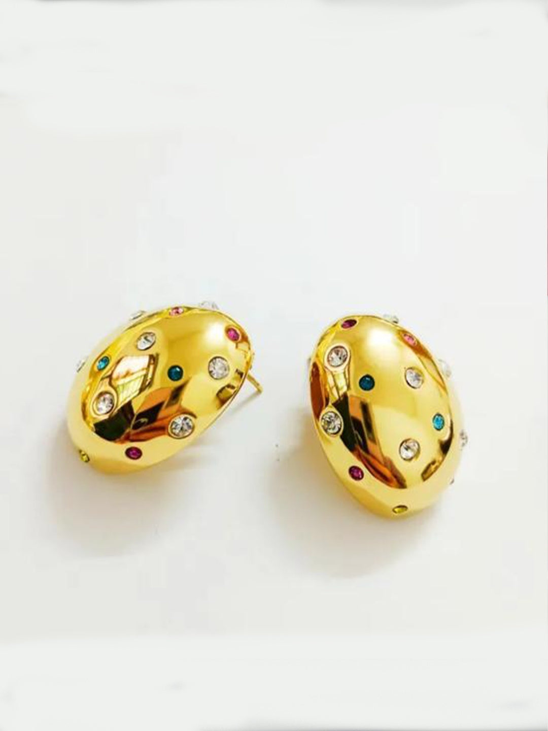 These golden oval studs, adorned with multi-colored stones, offer a vibrant touch to any ensemble. The intricate arrangement of stones in a variety of hues contrasts beautifully against the warm golden frame, making these studs a versatile accessory for both everyday wear and special occasions. Their elegant oval design ensures they remain timeless, while the pops of color add a playful, eye-catching element to your look.