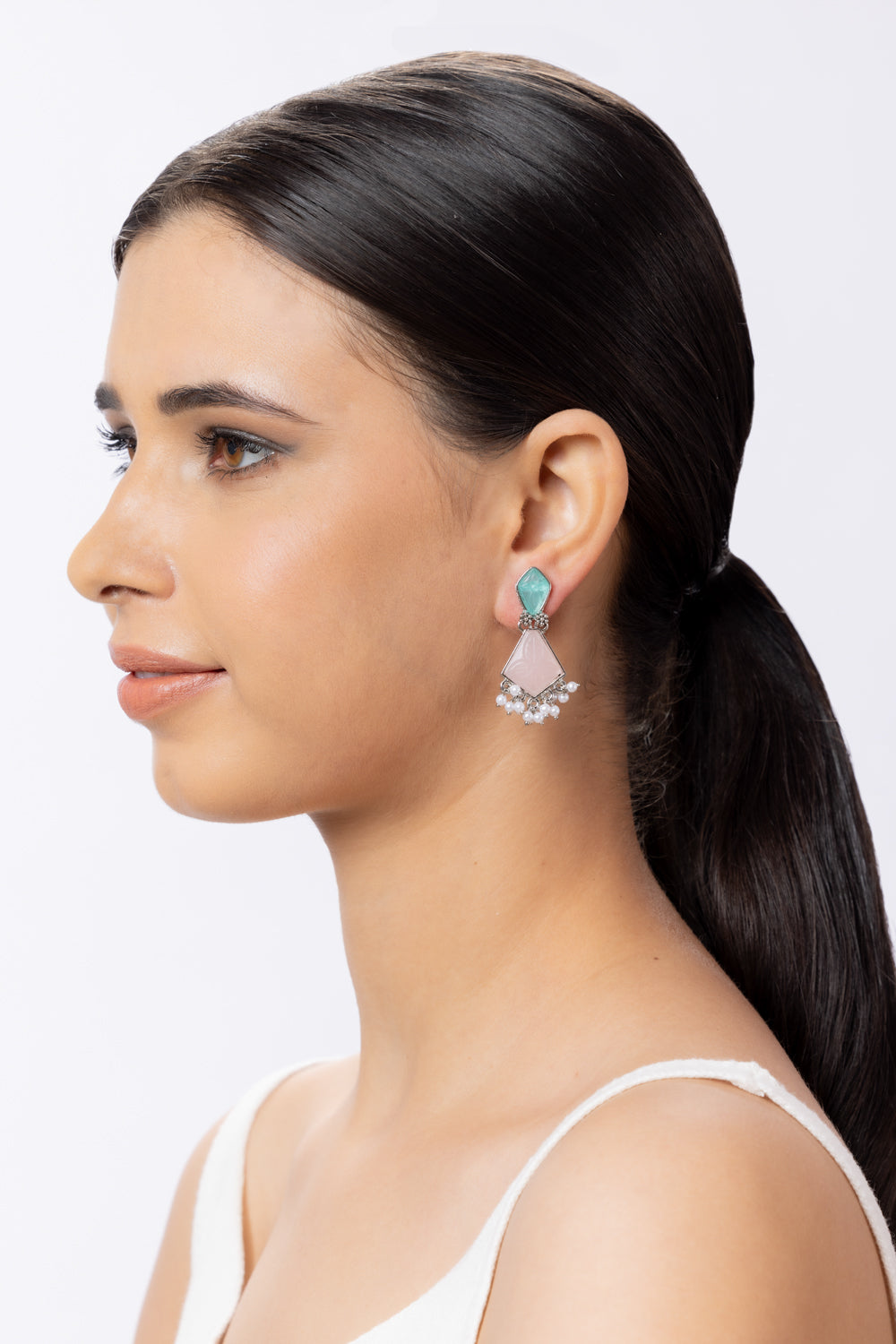 Niscka Brings You Wide Range Of Daily Wear Oxidised Earrings with. These Beautiful Handcrafted Danglers Are Perfect For Both Indian And Western Outfit. These Earrings Are Studded With Light Blue And Baby Pink Stones With Pearls Hanging At The Bottom. These Are Very Light Weighted And Are Perfect For Casual Use.