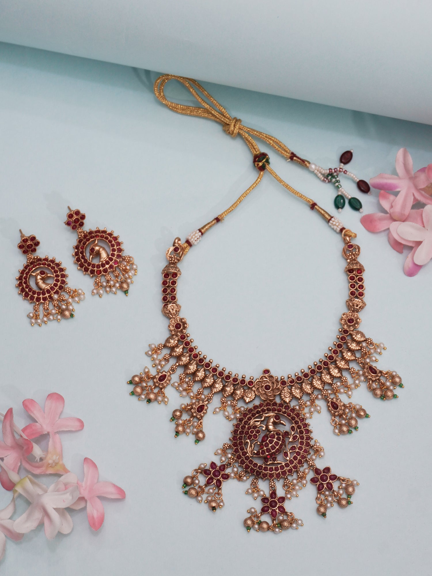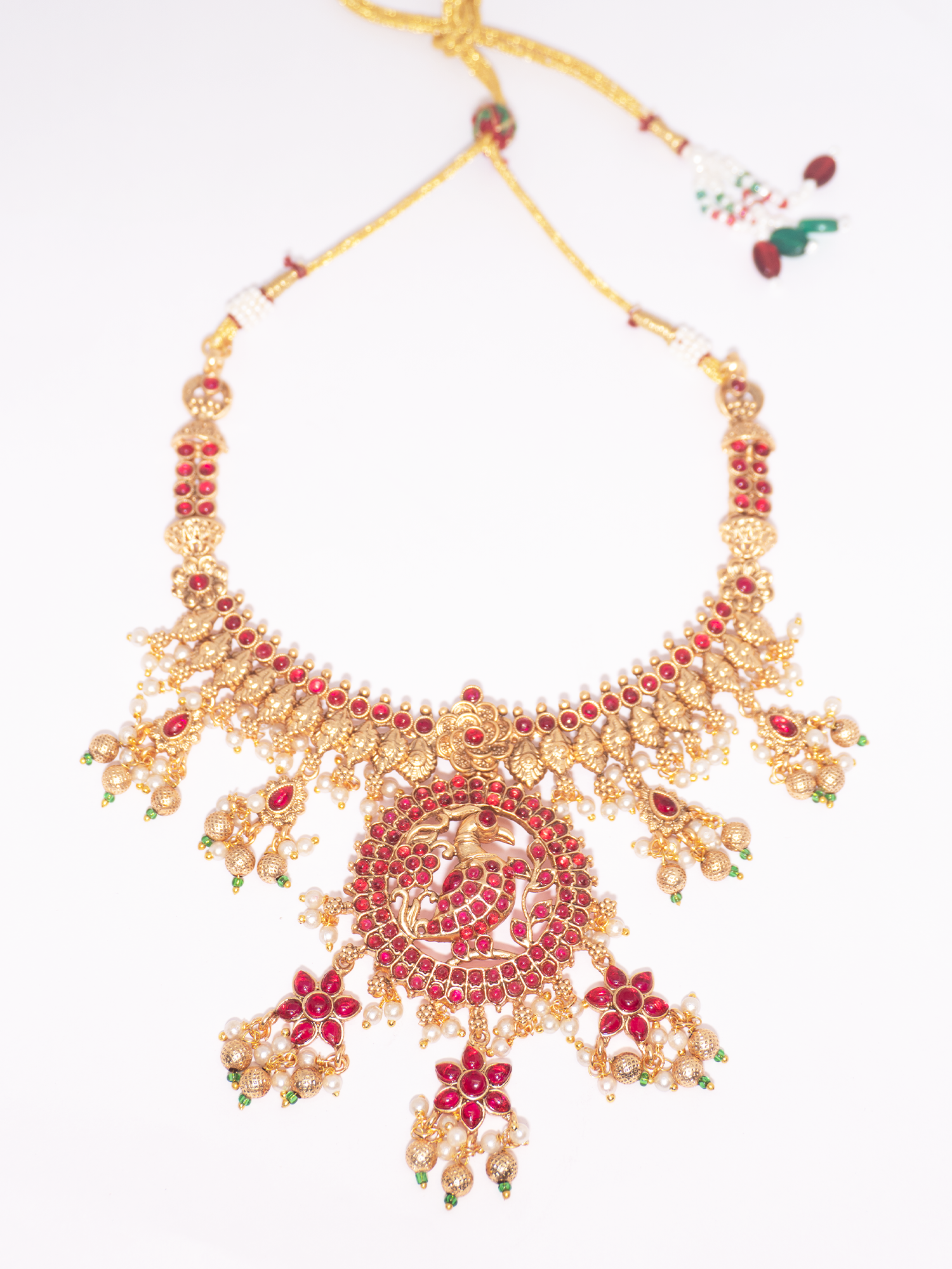 Luxe Ruby and Pearl Gold Plated Peacock Design Ethnic Necklace Set