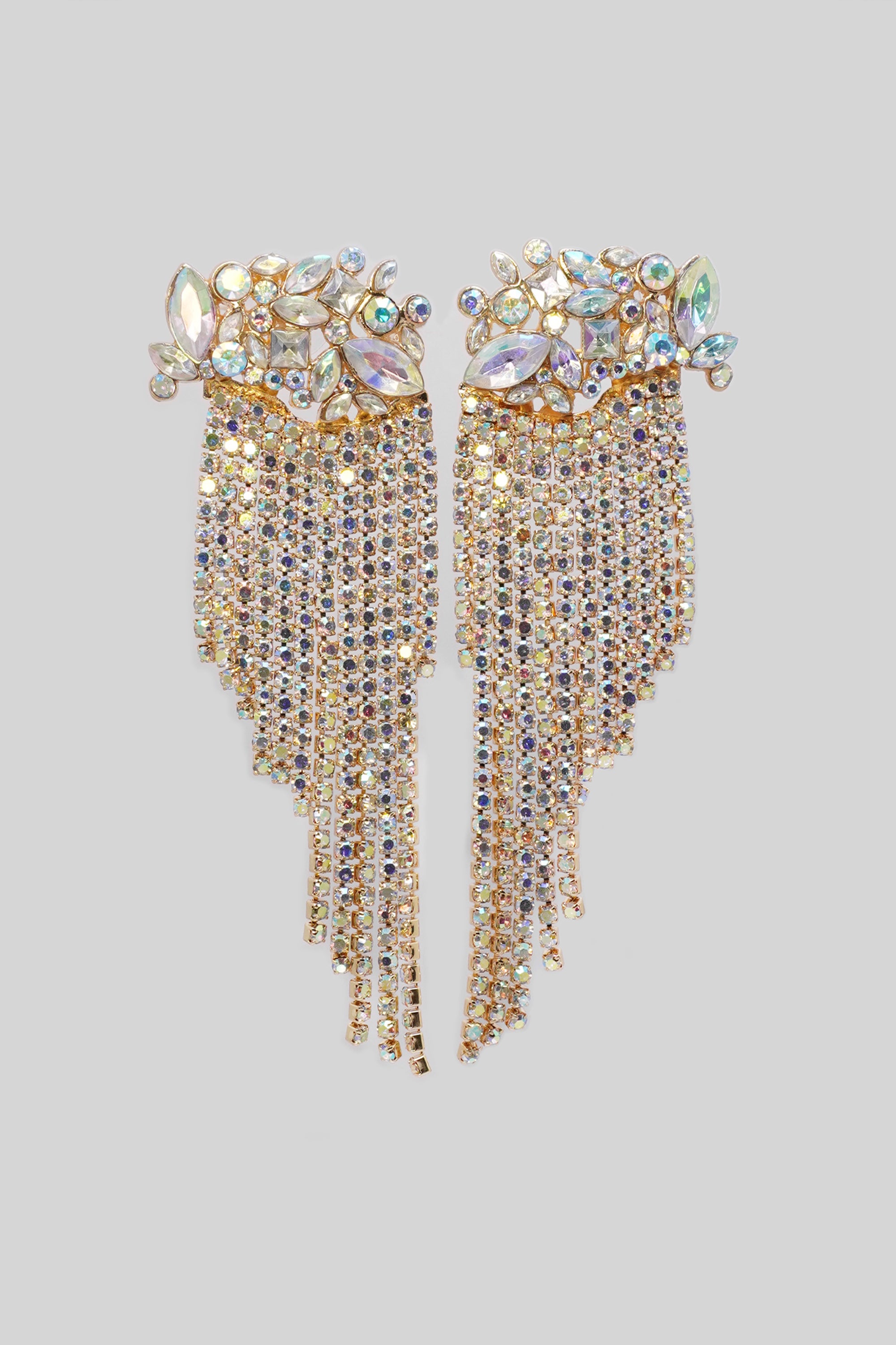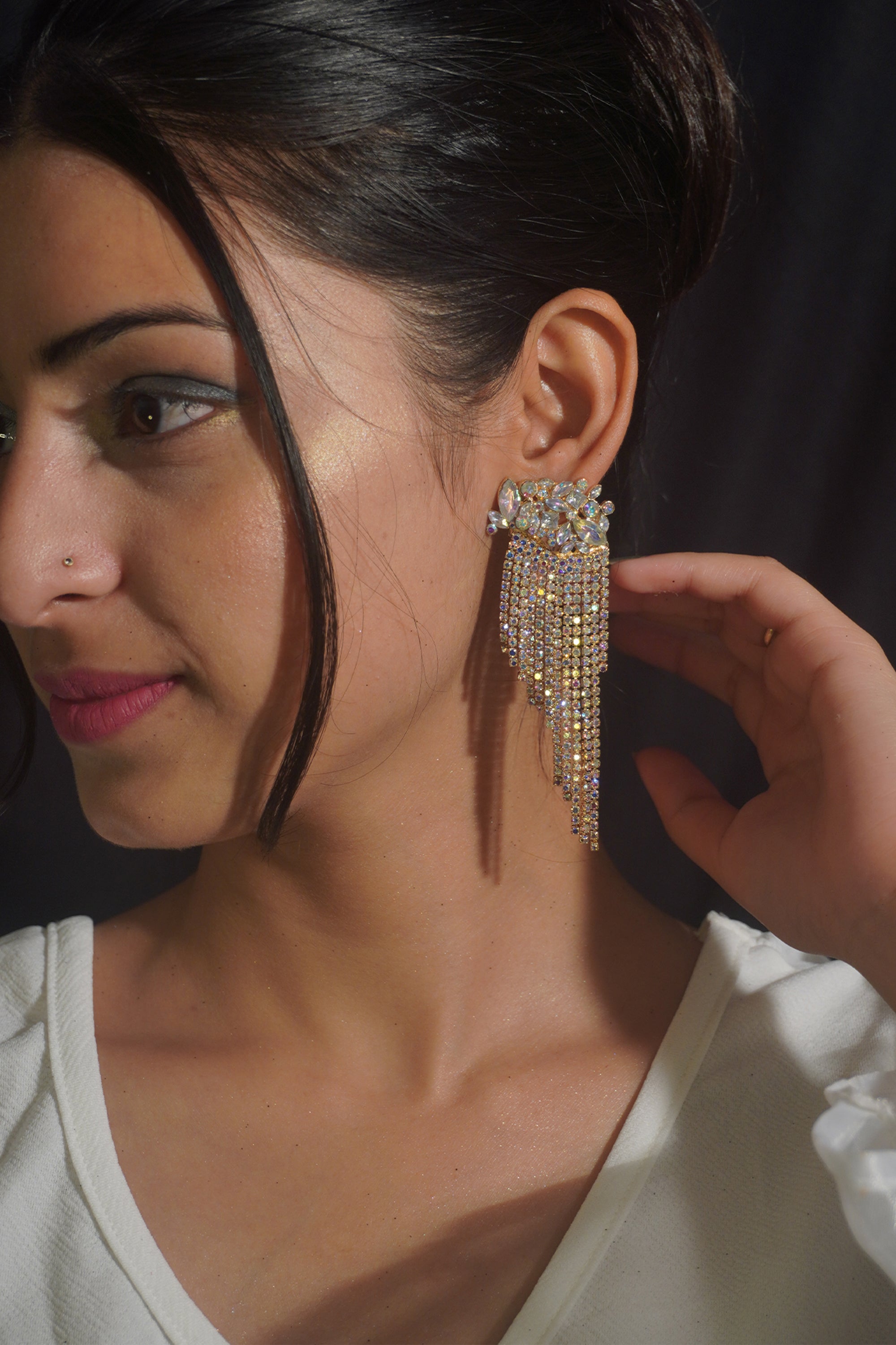 This magnificent earring is gorgeously crafted with different shapes of rhinestone crystals and AAA-grade American Diamonds. Its gold-plated body is absolutely stunning and eye-catching. Its shimmering design makes it a perfect accessory for any occasion. Its lightweight makes it more comfortable.