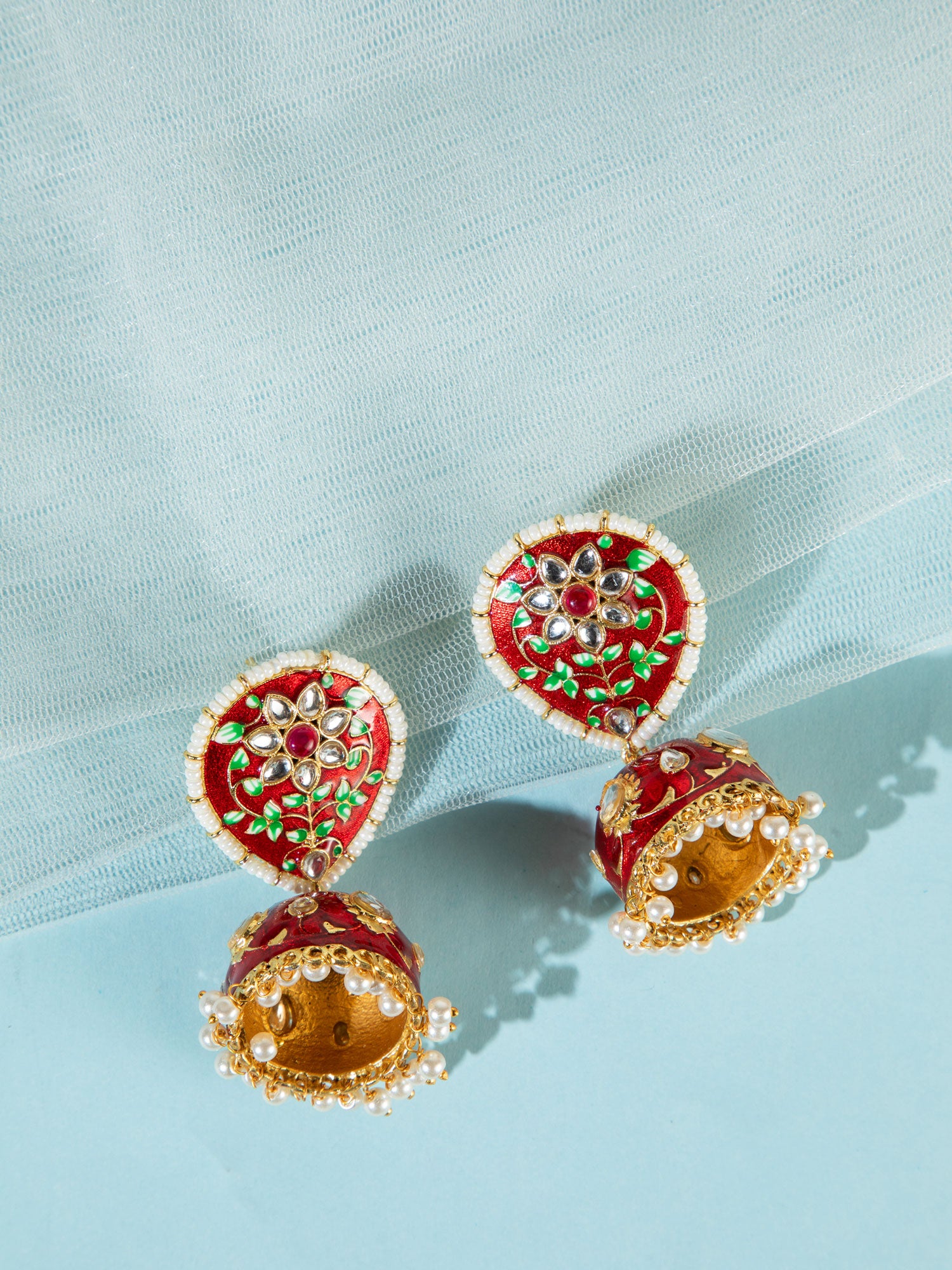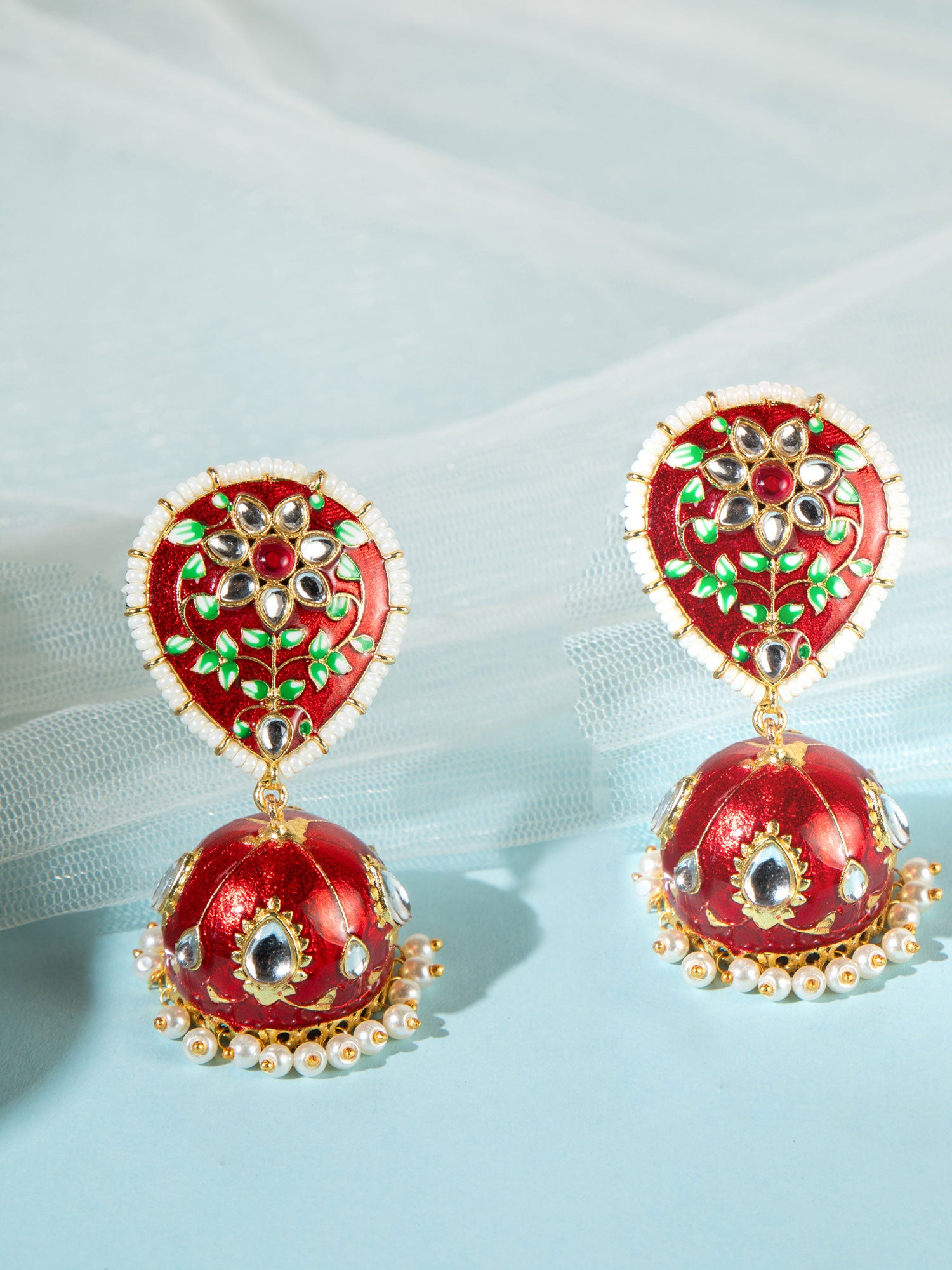 Add a touch of royal elegance with these stunning red jhumki earrings, beautifully crafted with intricate kundan work, delicate leaf motifs, and rich gold plating. The deep red beads enhance the traditional charm, while the detailed craftsmanship gives a luxurious and festive appeal. Perfect for weddings, festive occasions, and ethnic celebrations, these jhumkis effortlessly elevate your look with timeless grace.