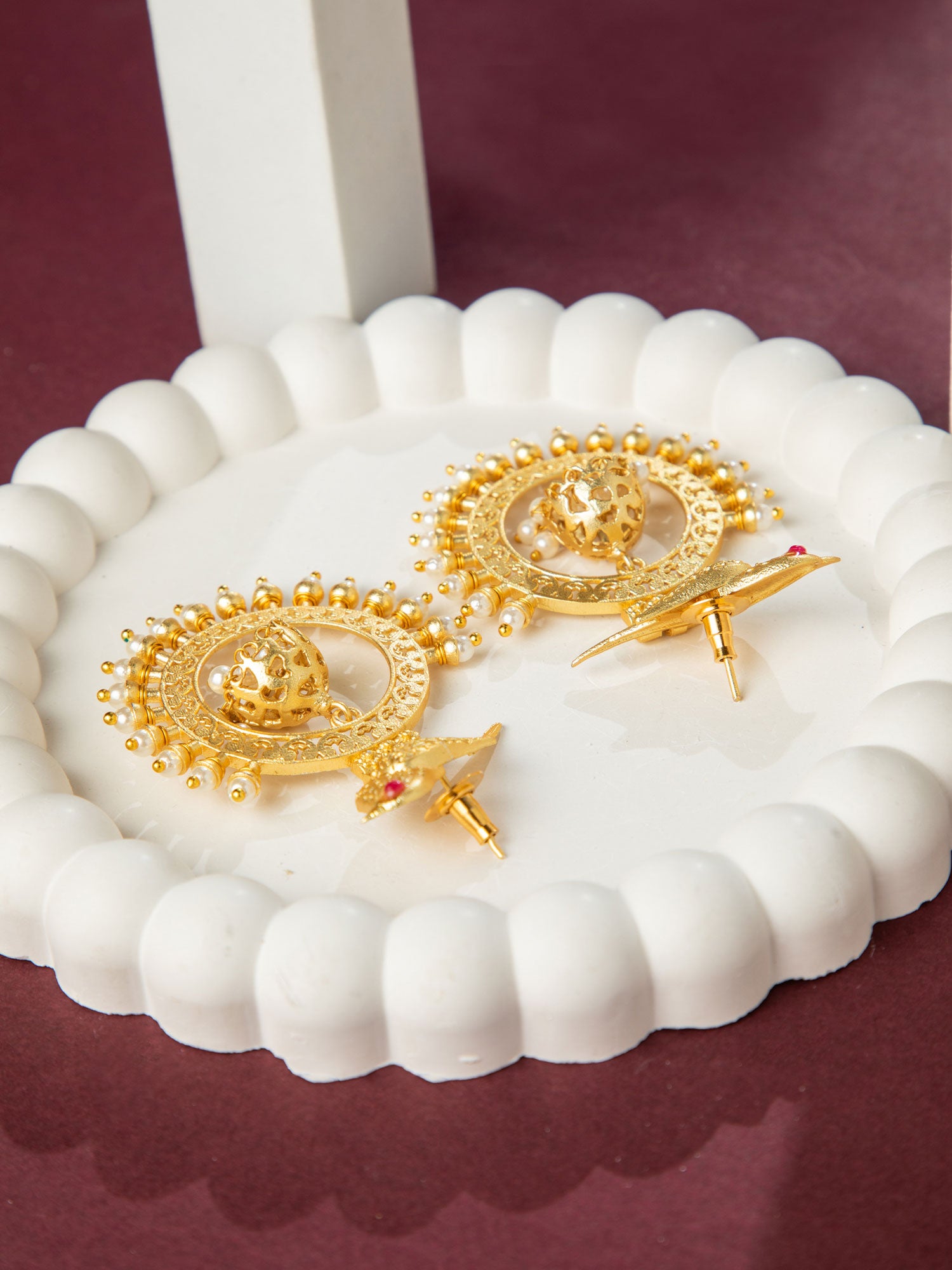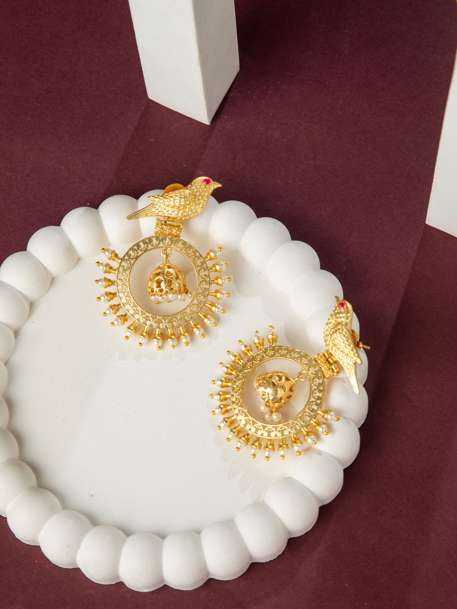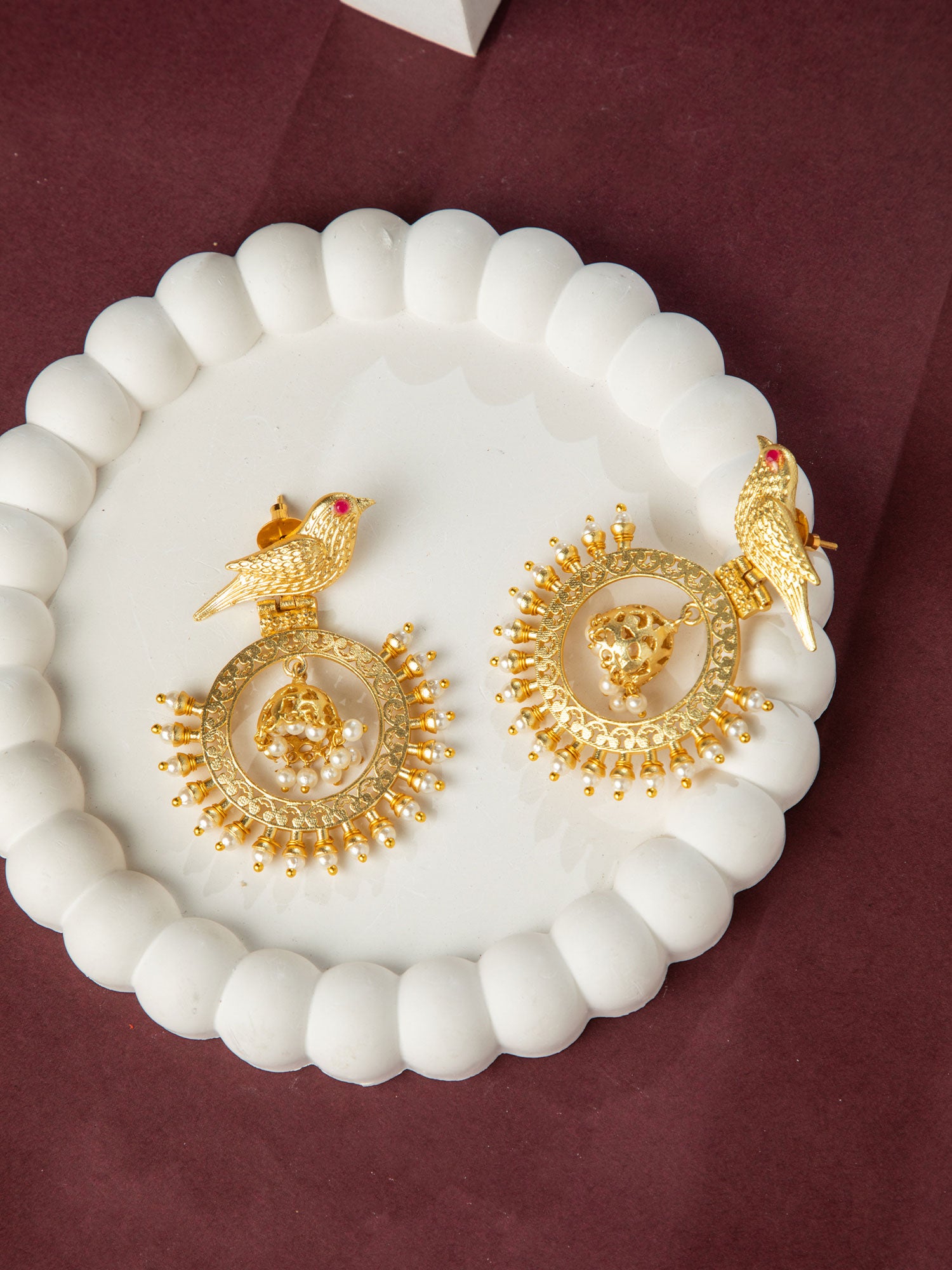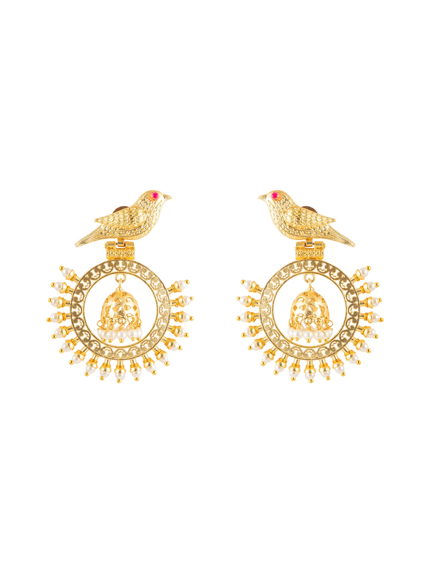 Matte Gold Plated Bird Design Jhumki Earrings with Pearls