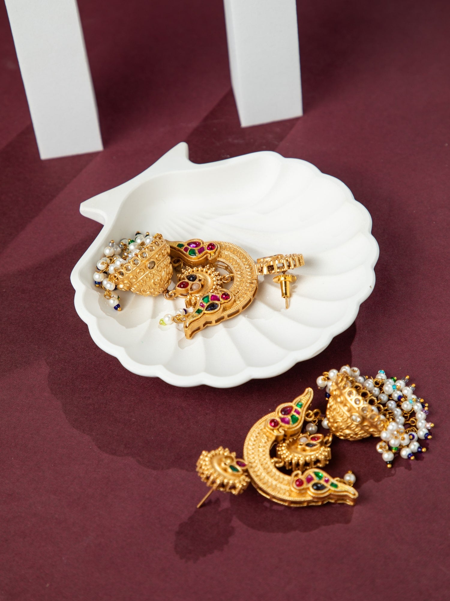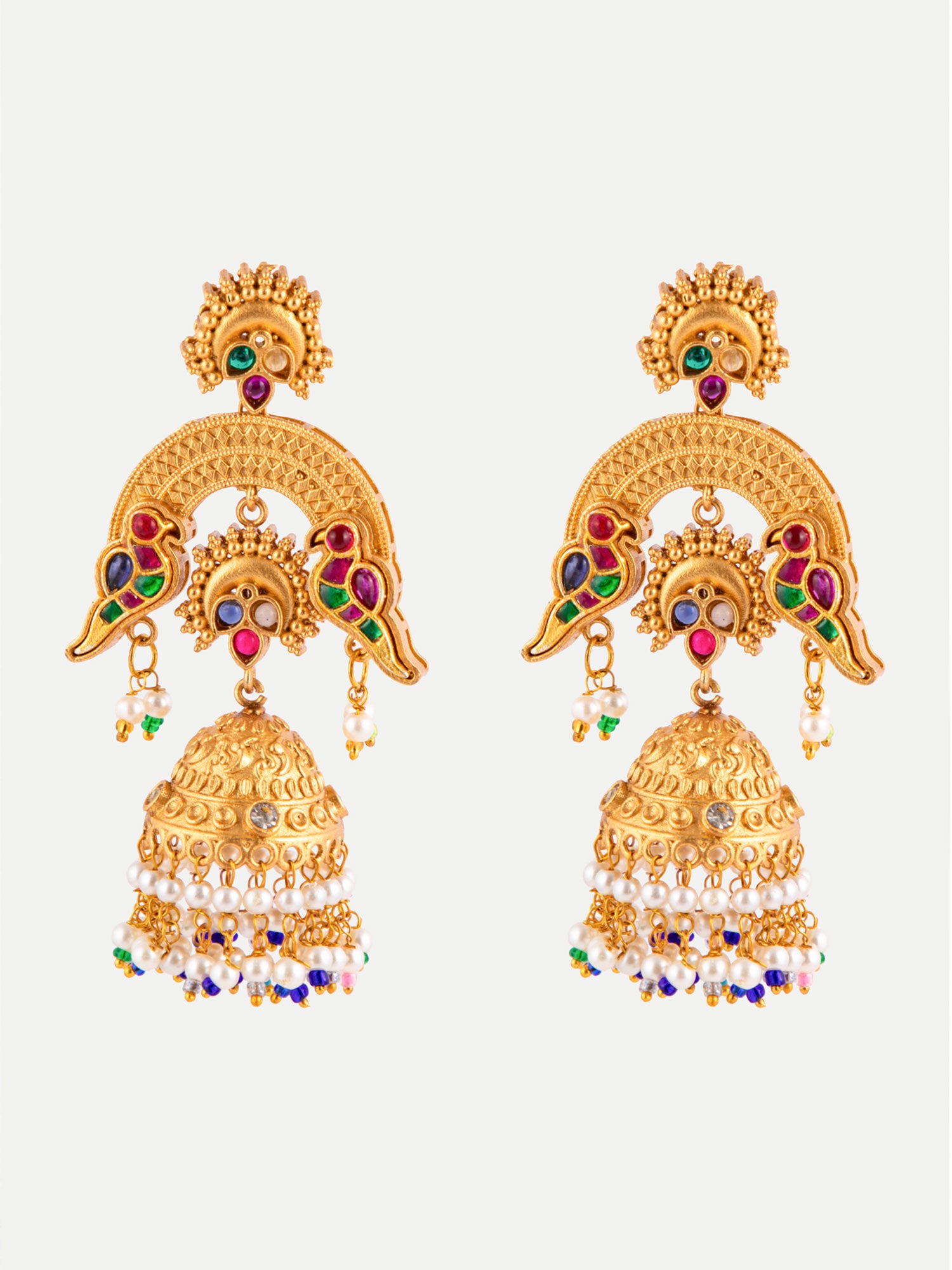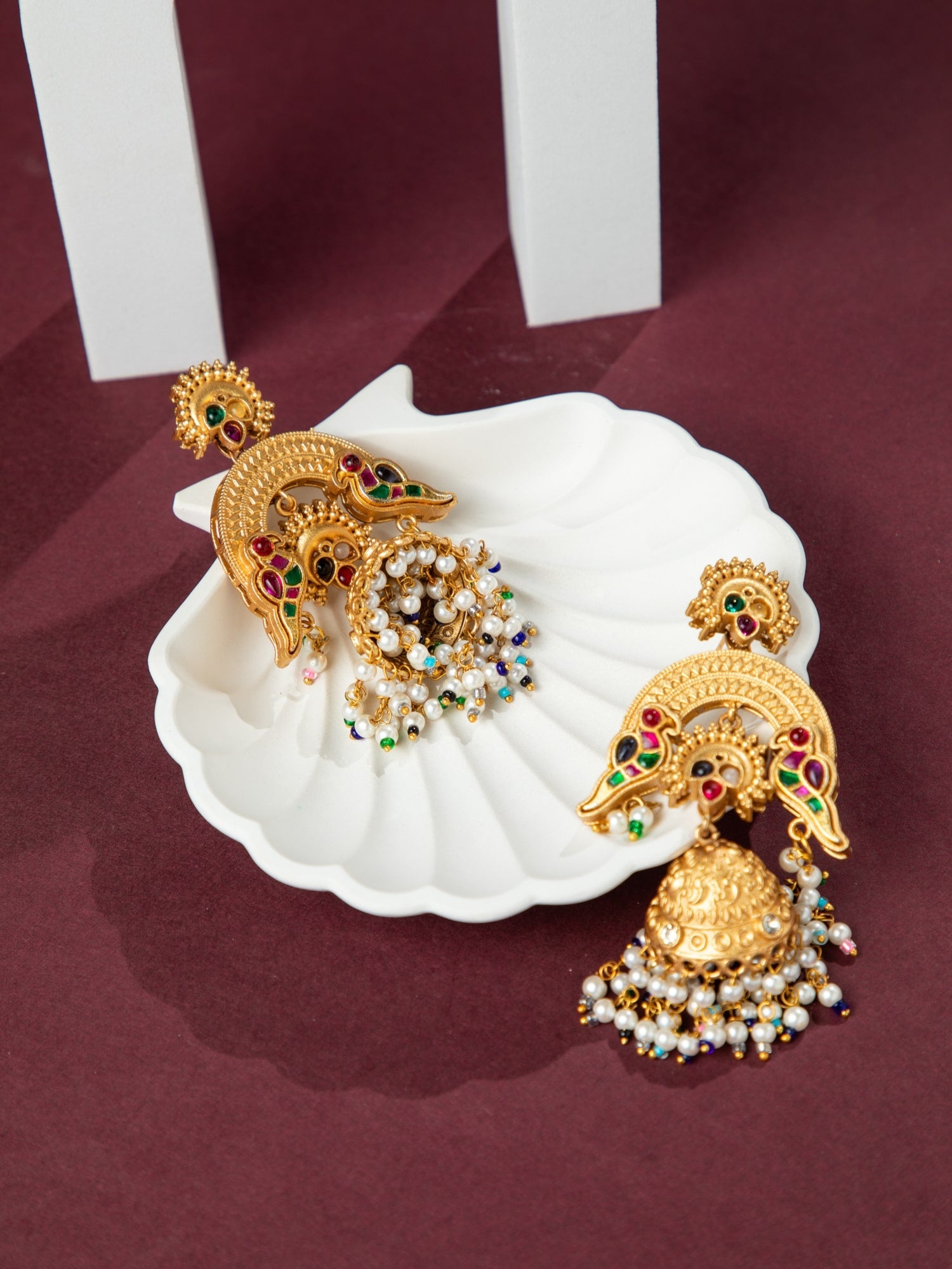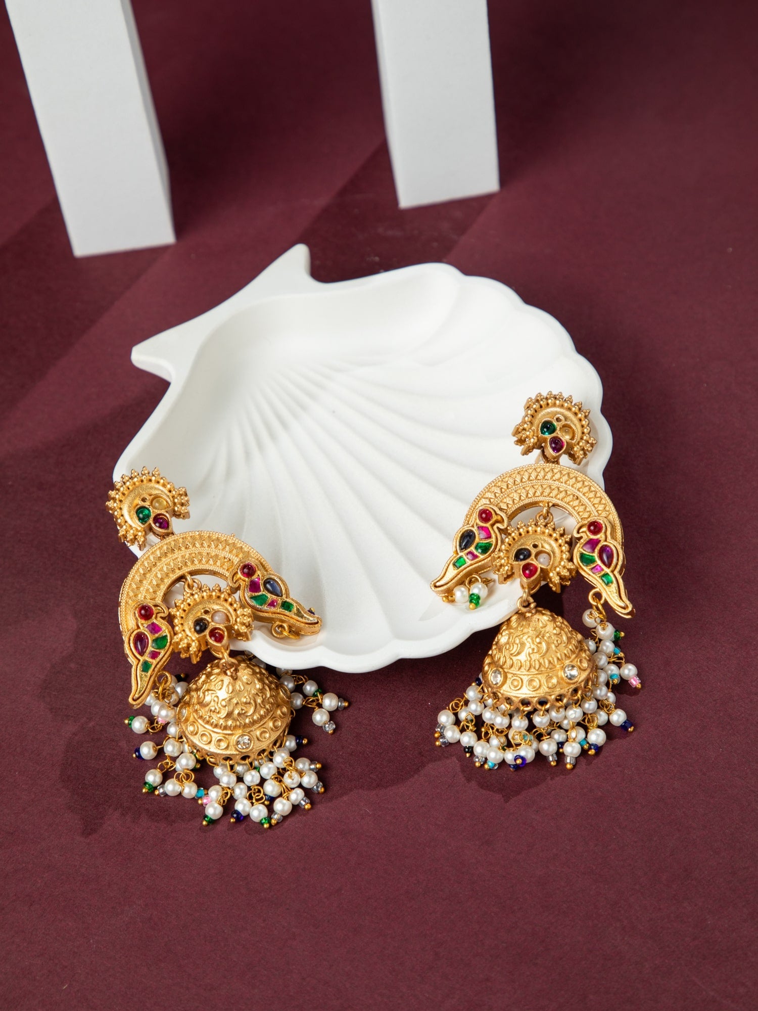 Matte Gold Plated Chaand Bali Jhumka with Peacock Design and Multicolor Stones