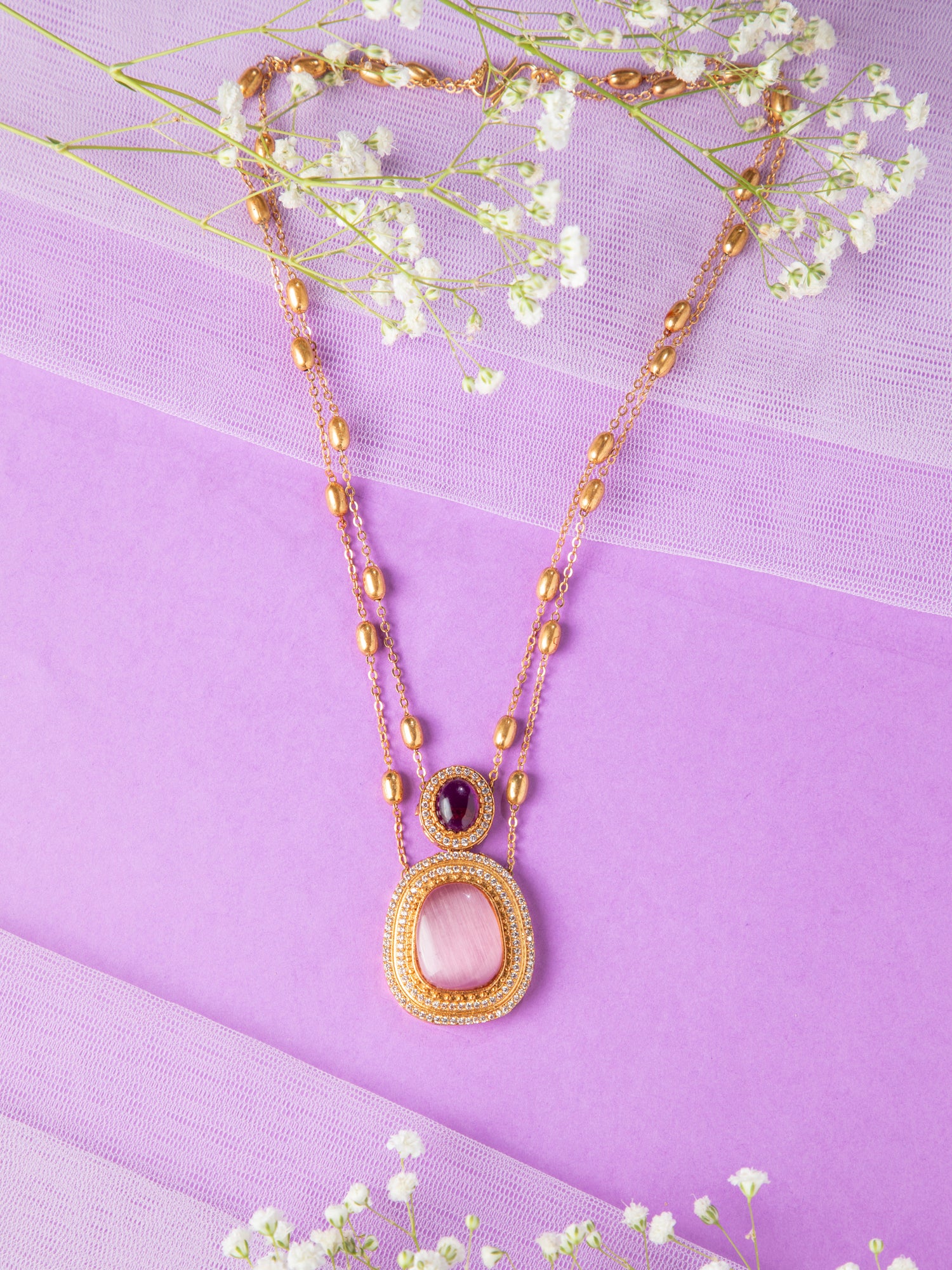 Matte Gold Plated Double Layered Necklace with Pink and Purple Stone Pendant