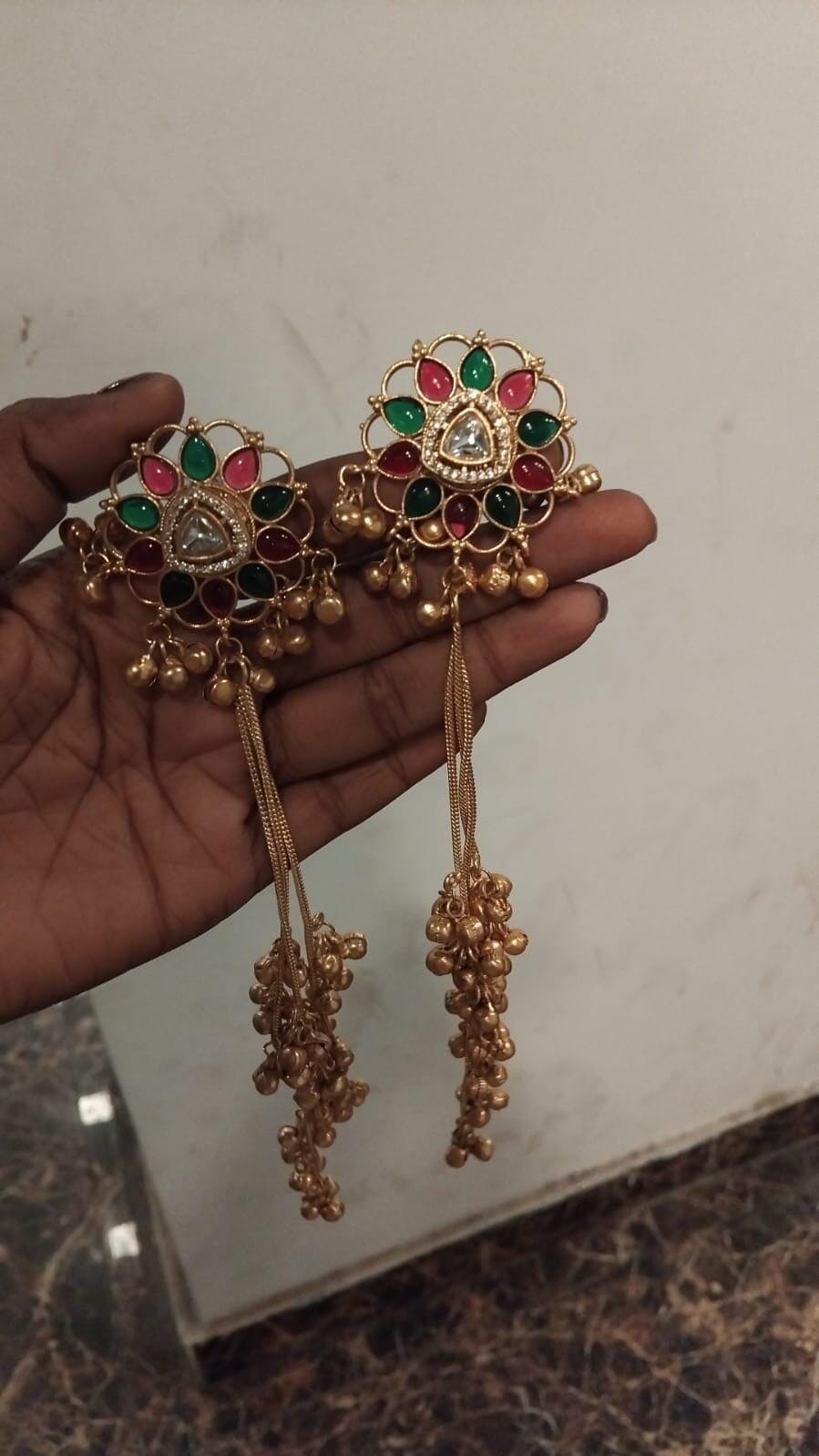 Matte Gold Plated Long Kashmiri Floral Earrings