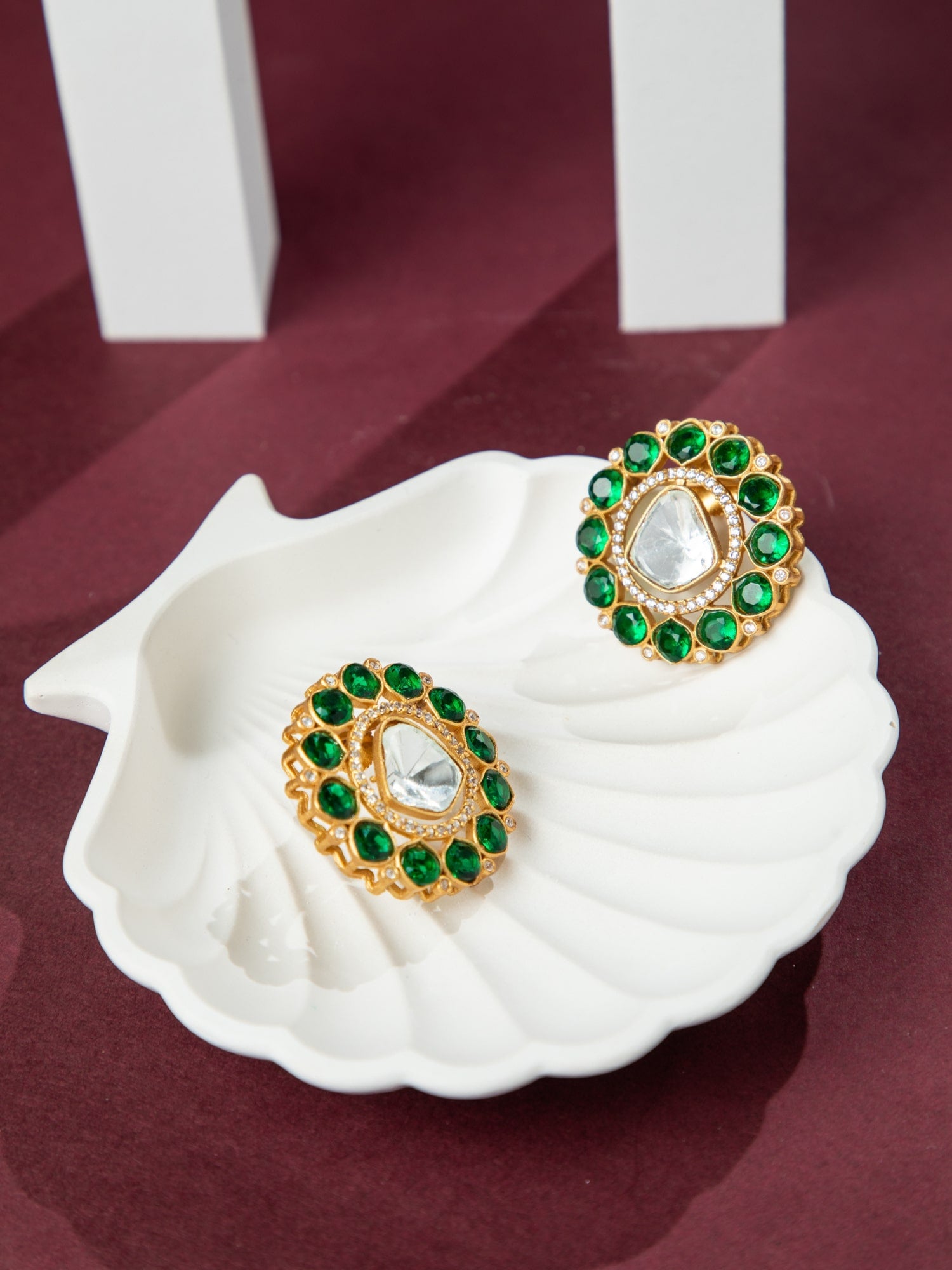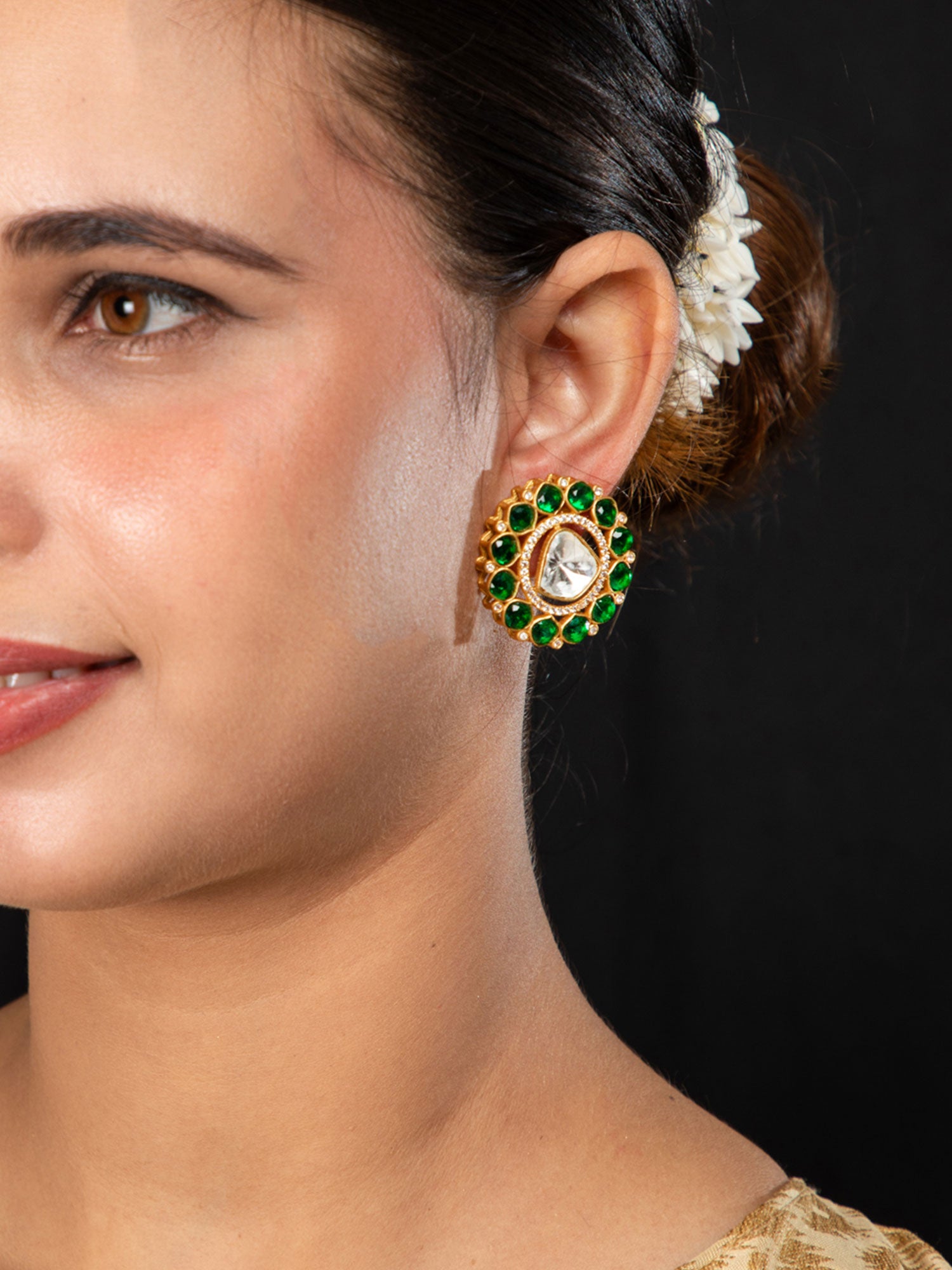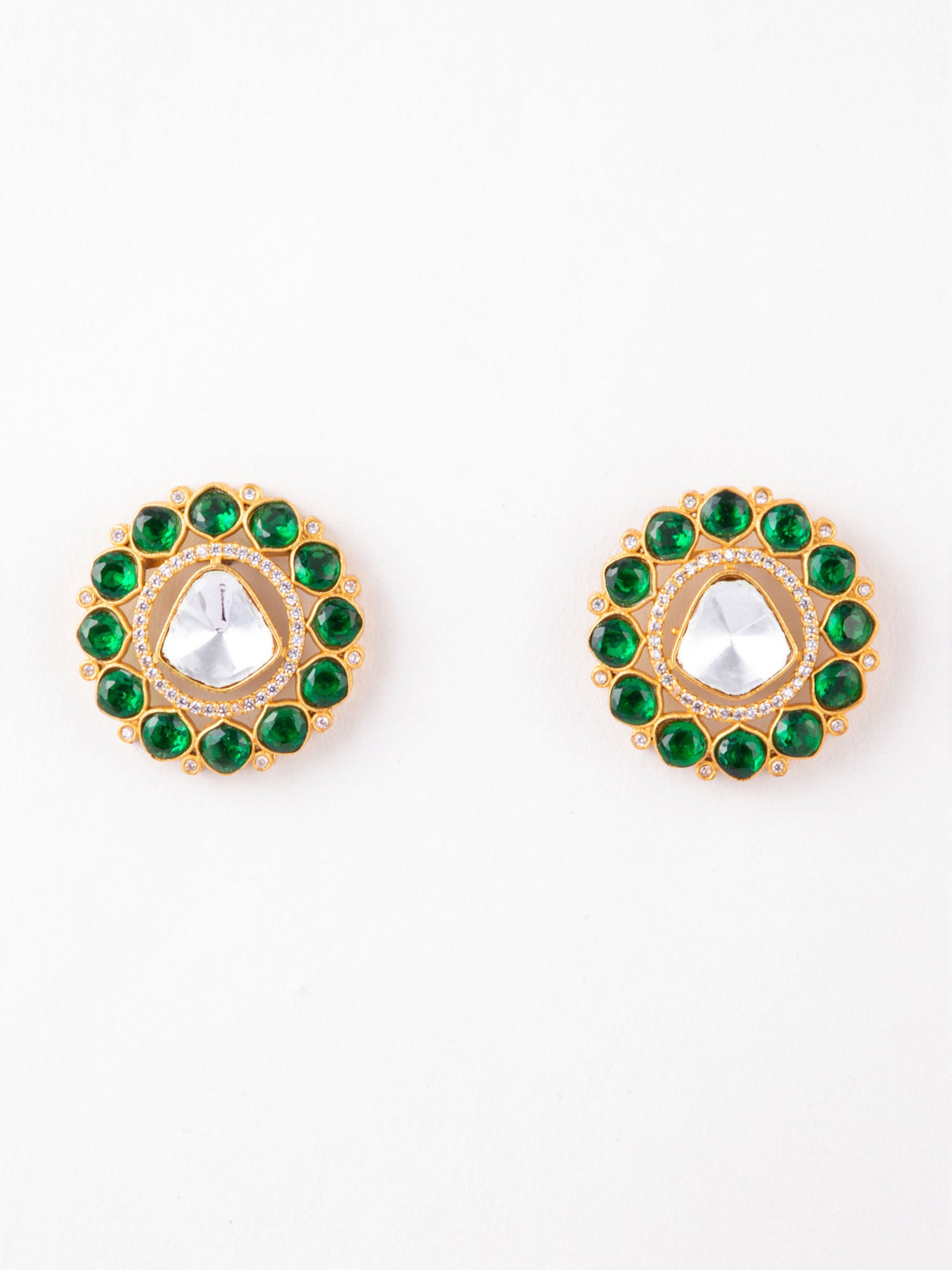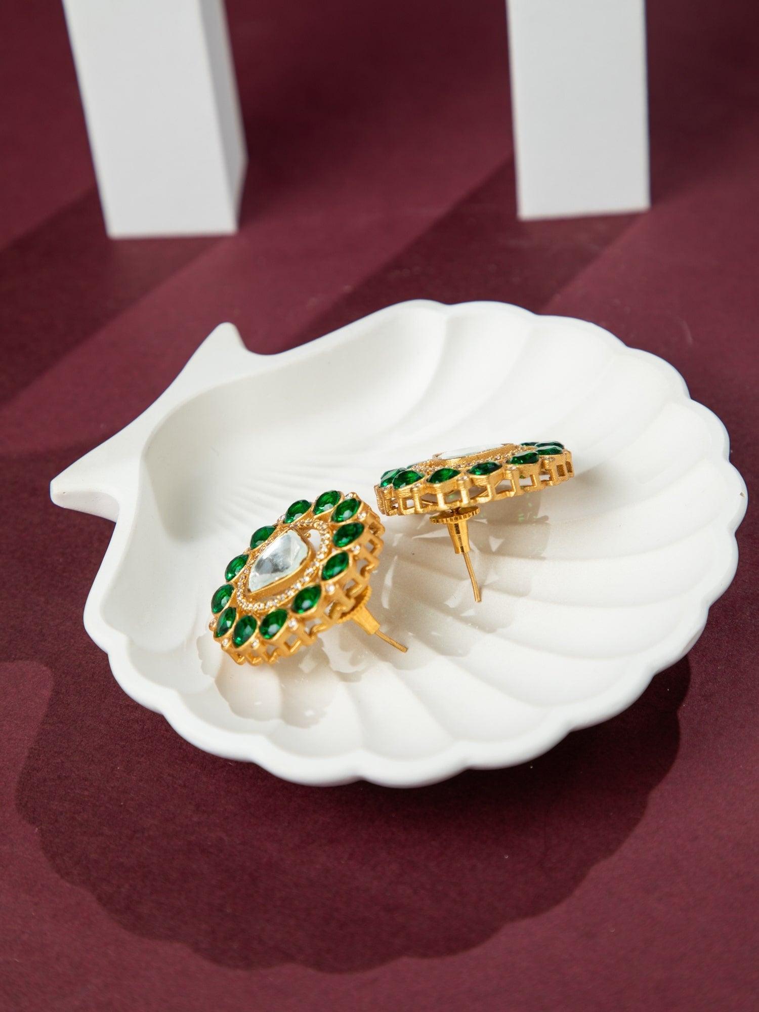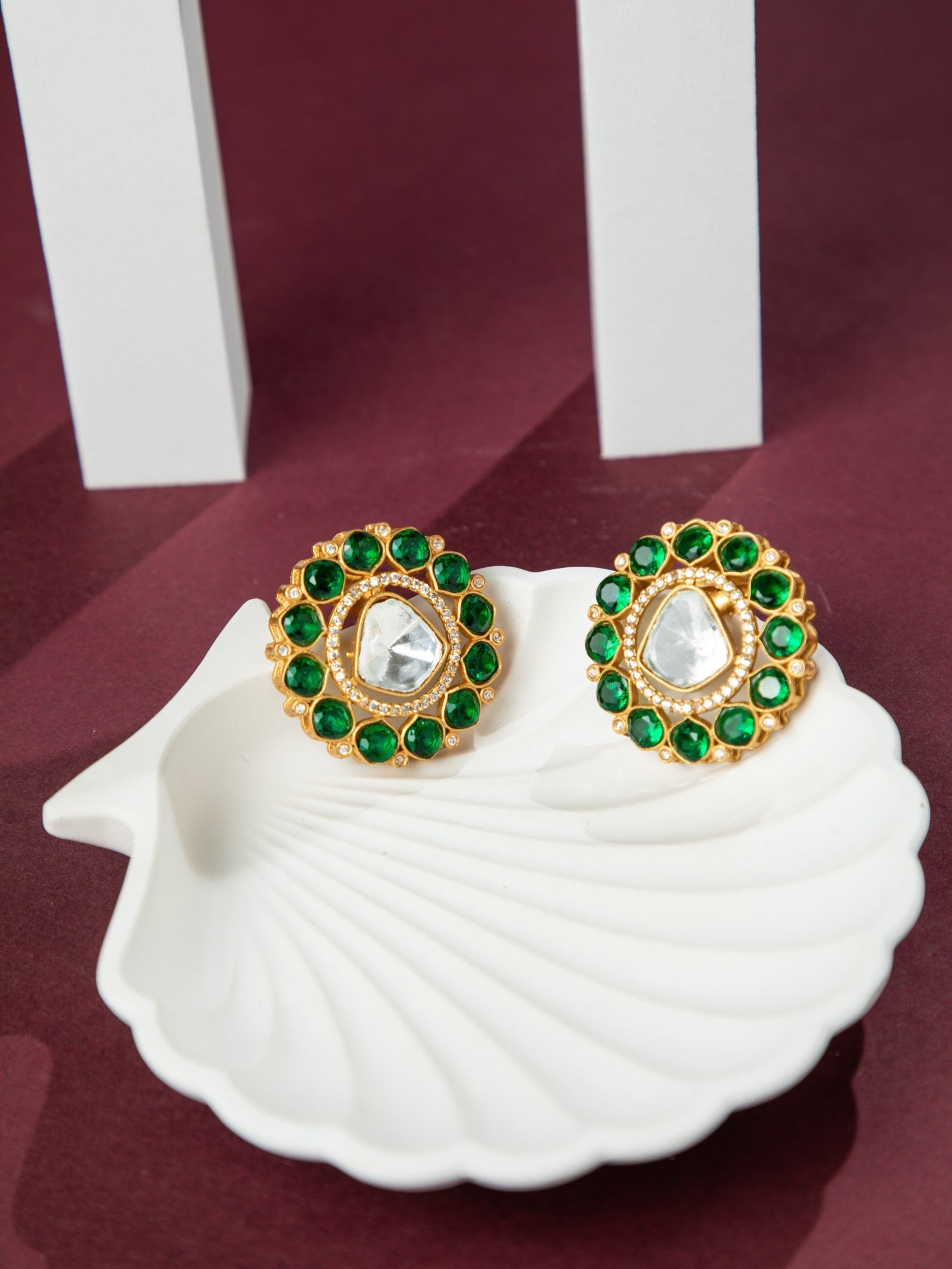 Matte Gold Plated Round Earrings with Green Stones, White CZ and Kundan Stones