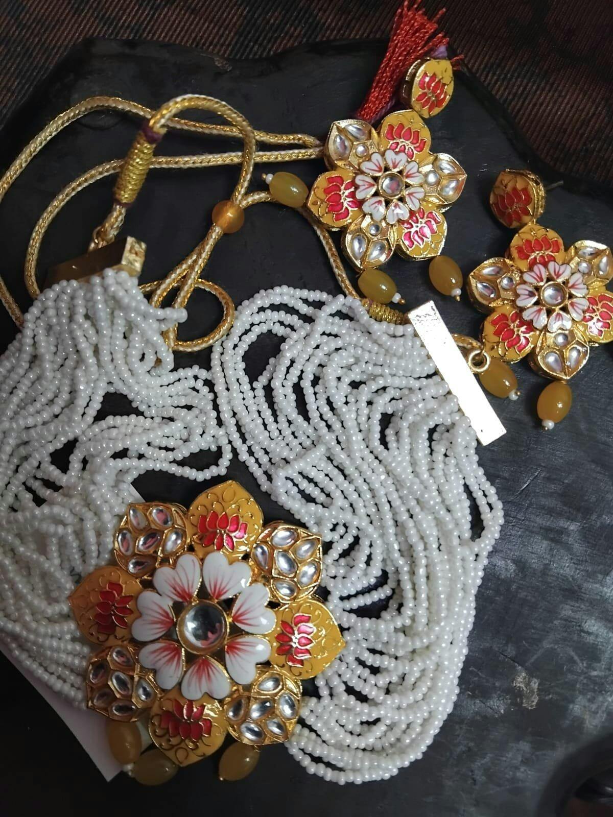 Matte Gold Yellow Floral Meenakari Necklace Set with Pearls